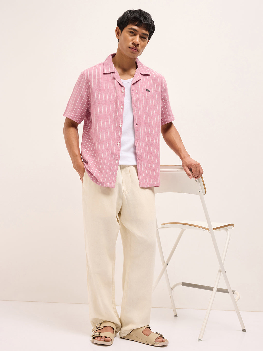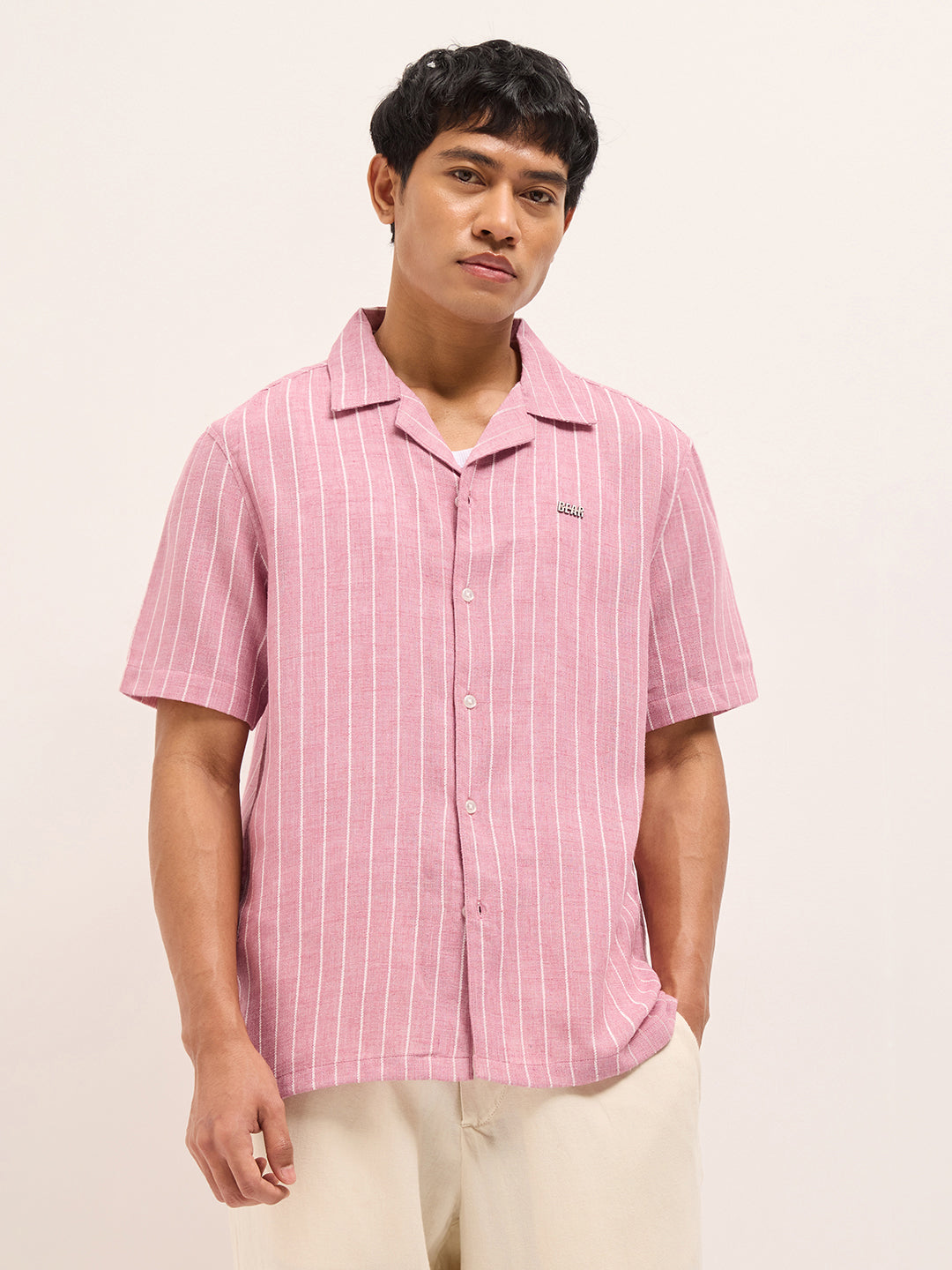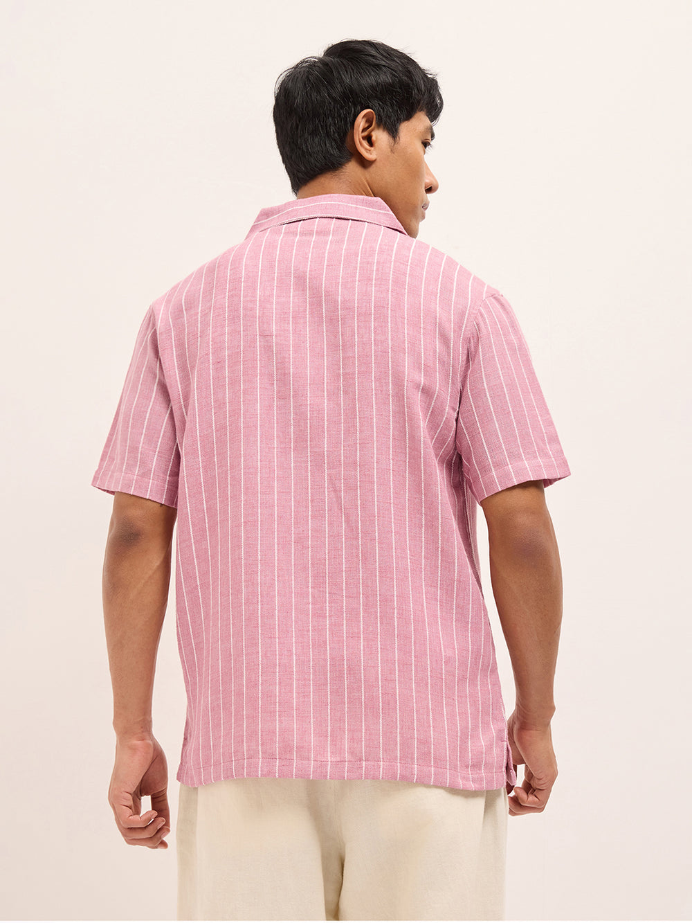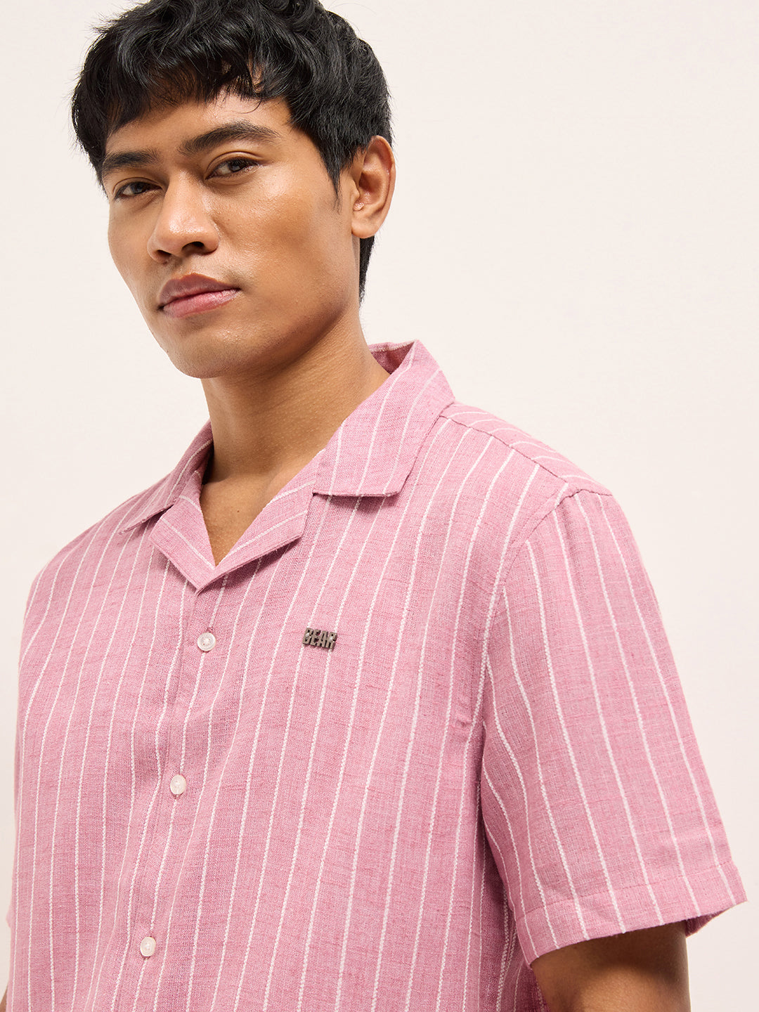 Pink Linen Vertical Textured Stripe Relaxed Fit Half Sleeve Casual Shirt