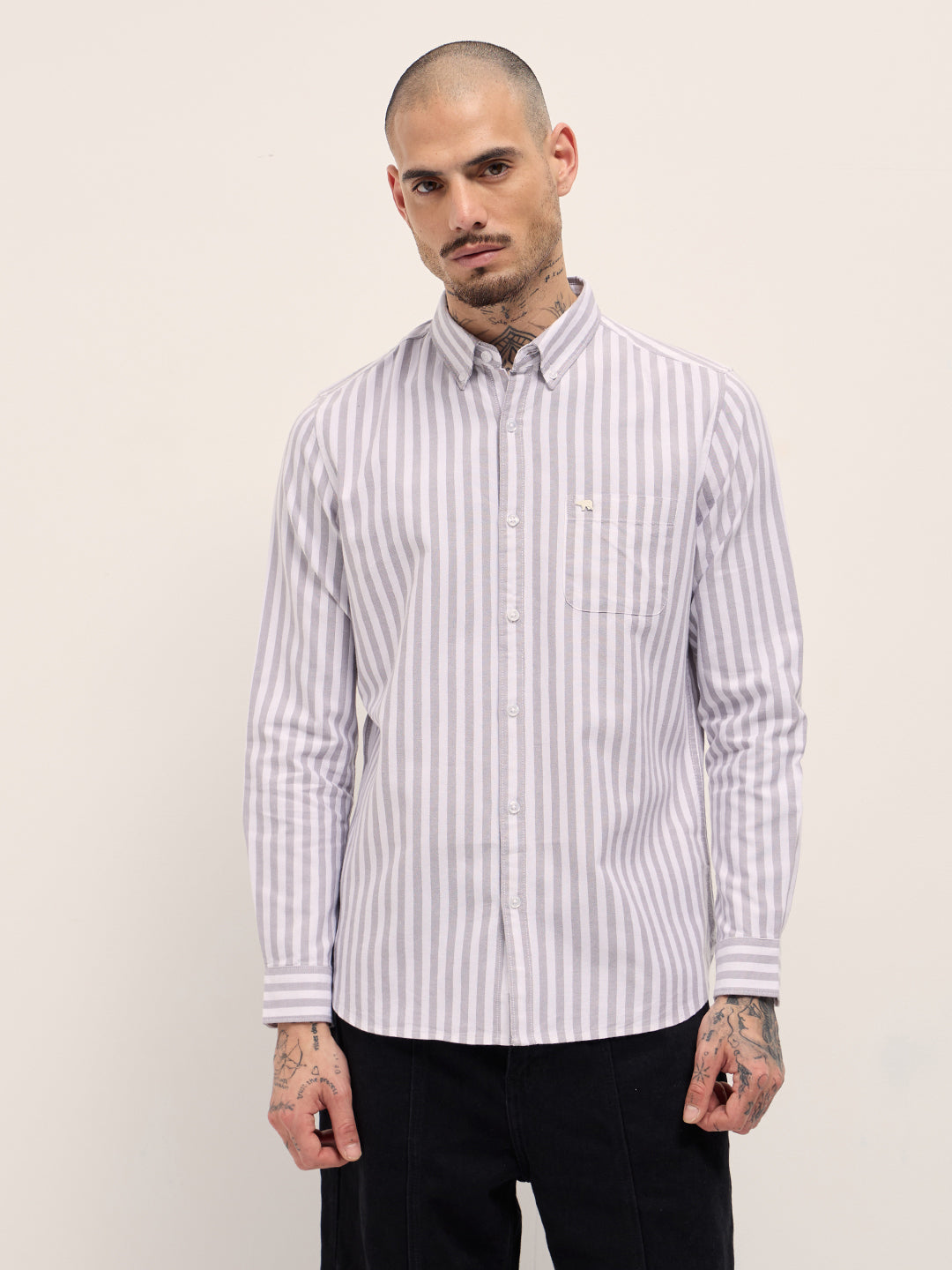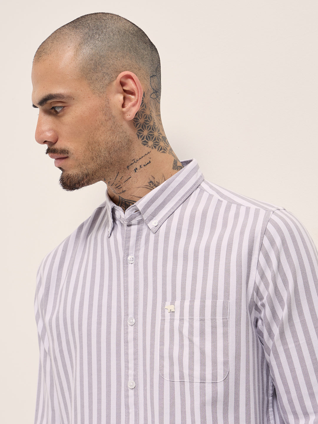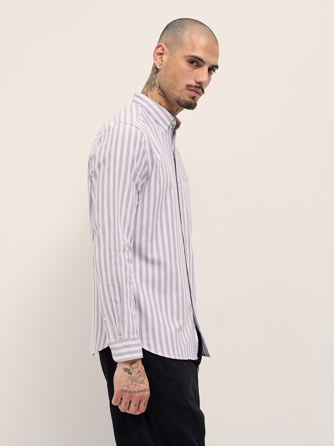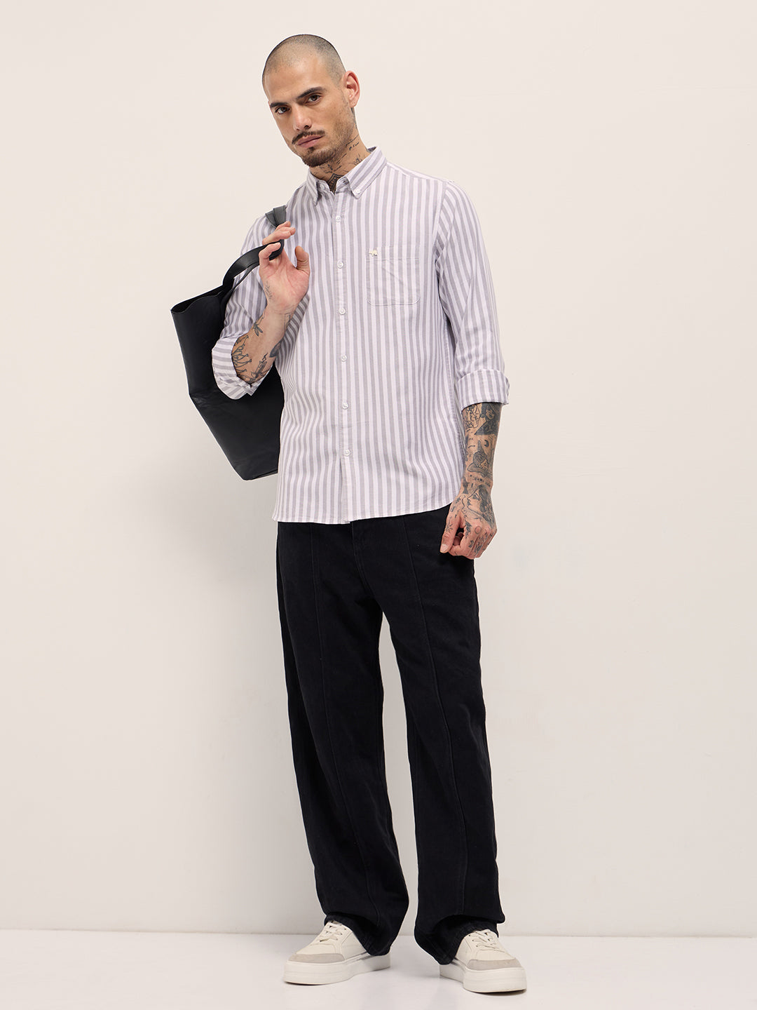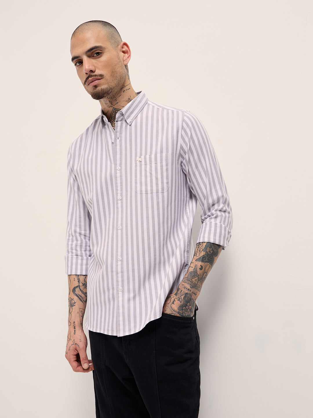 Shop Grey & White Vertical Stripes Slim Fit Casual Shirt Online.