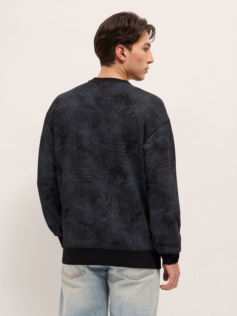 Black Relaxed Fit Crew Neck T-Shirt with All-Over Abstract Laser-Etched Design