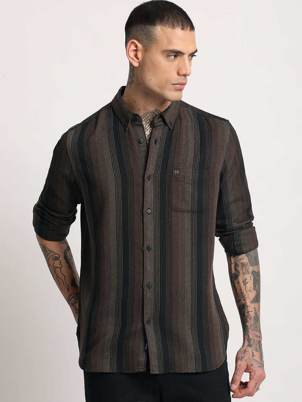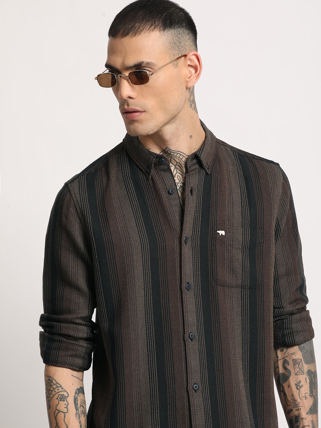Men Brown Striped Slim Fit Cotton Casual Shirt