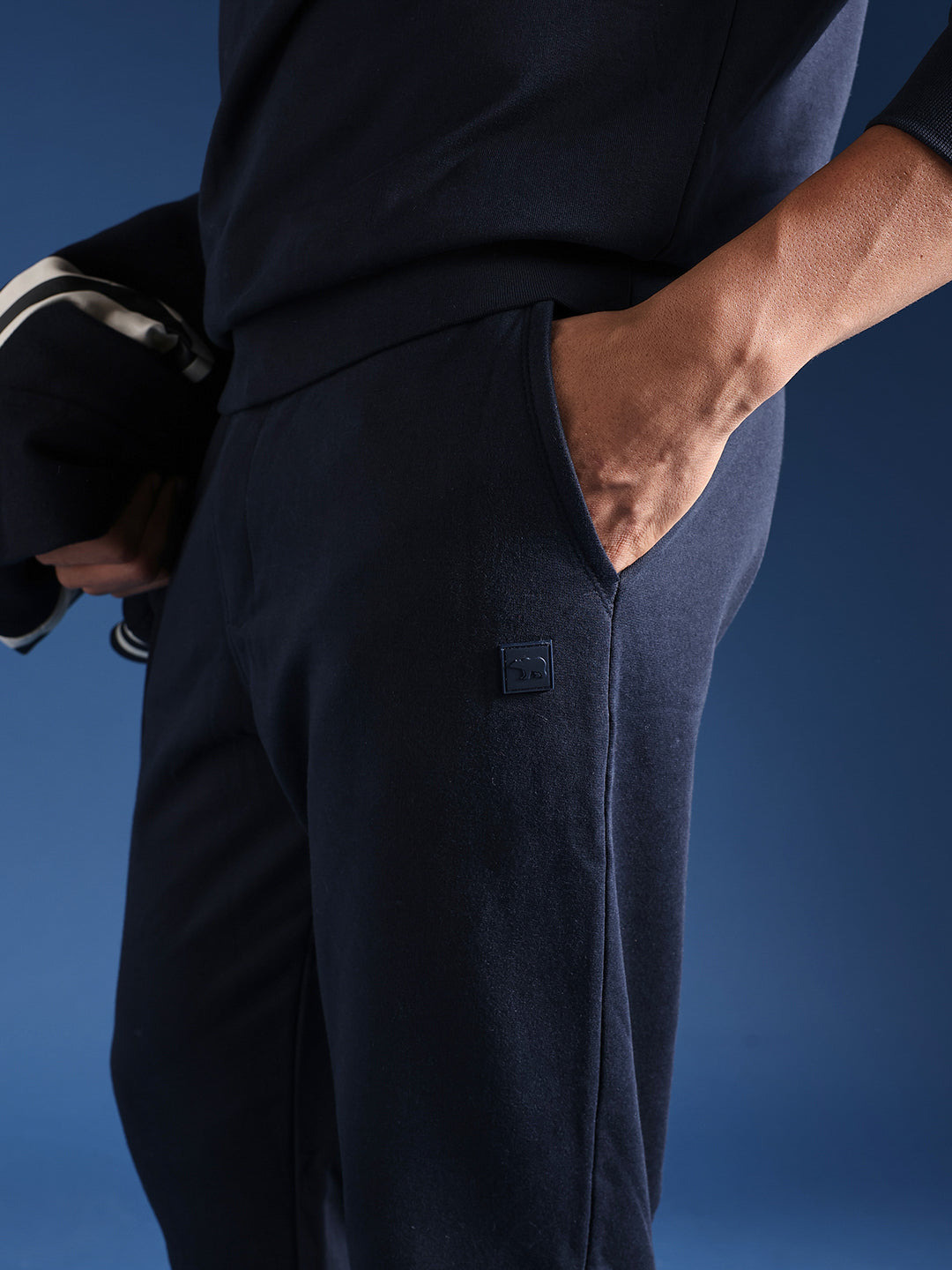 Navy Blue Relaxed Fit Solid Track Pants with Toggle Adjustable Hem