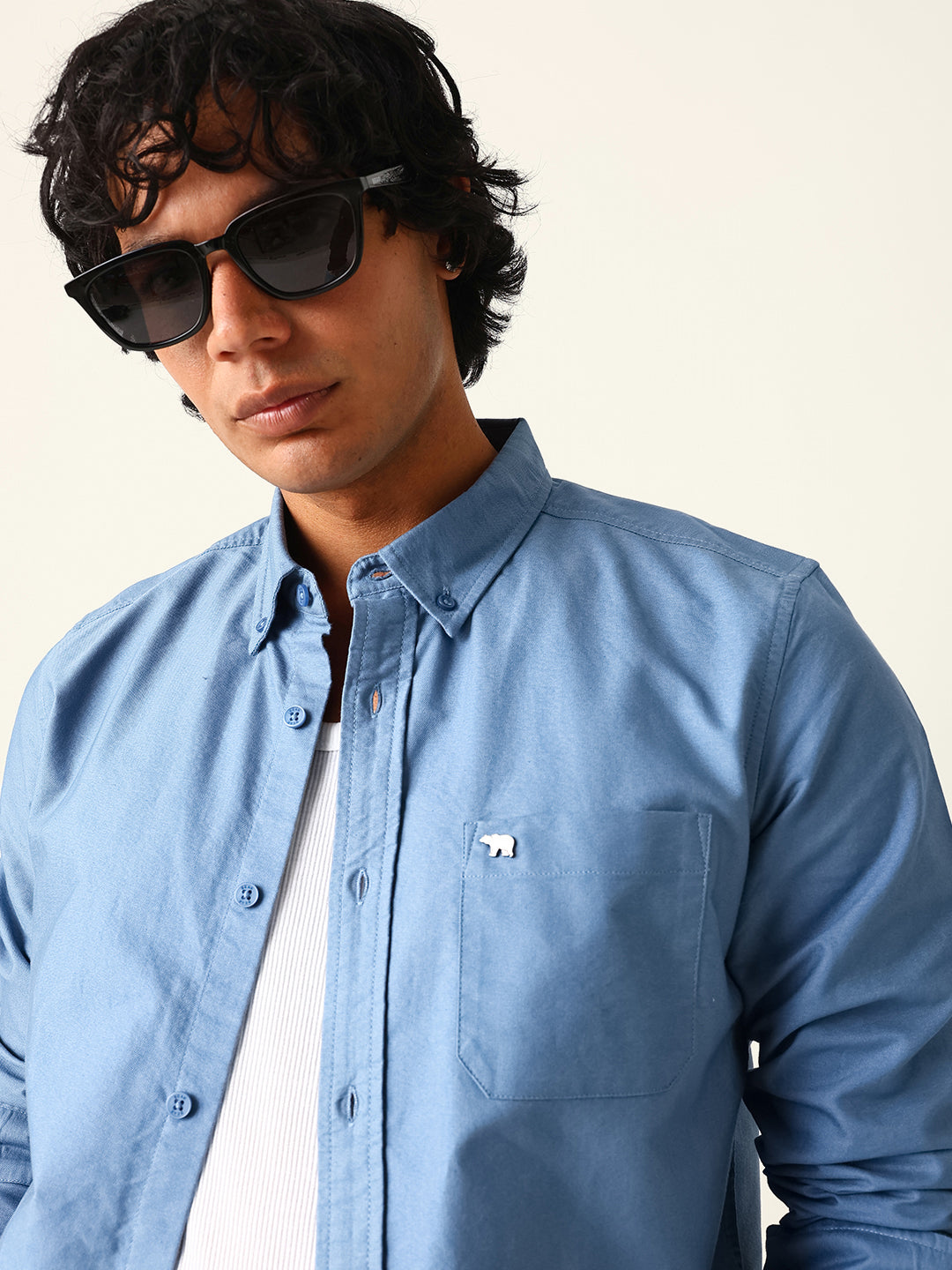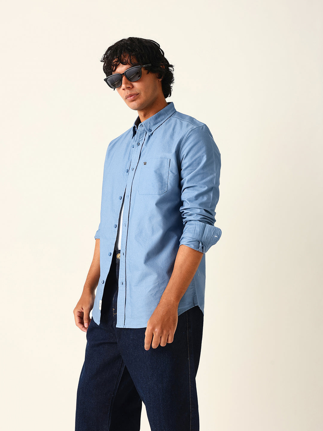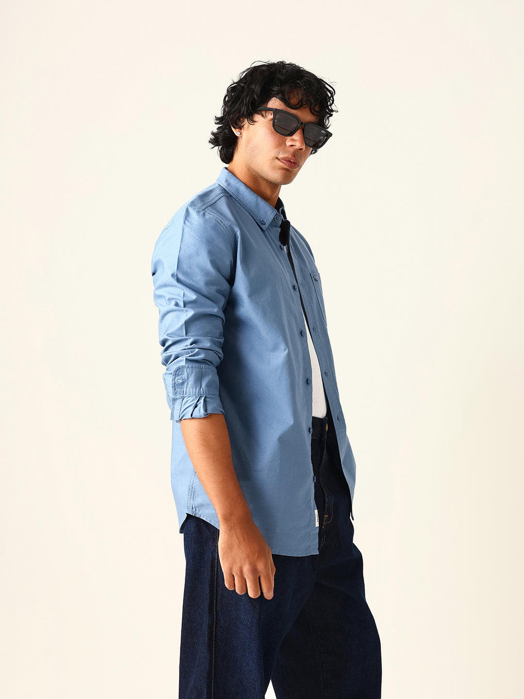 Blue Solid Slim-Fit Casual Shirt with Button-Down Collar
