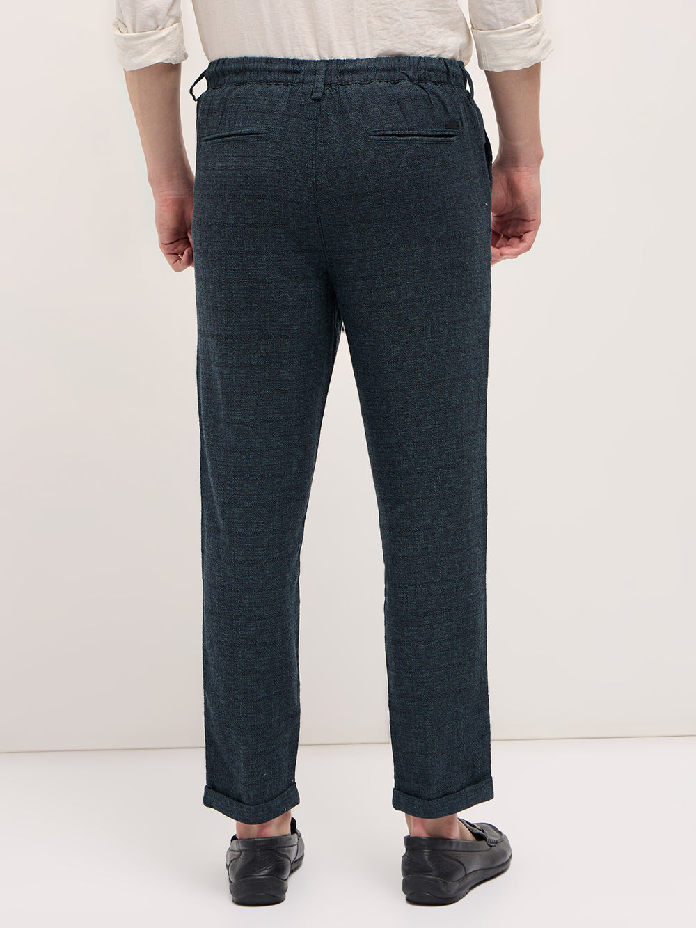 Teal Self Design Tapered Fit Elasticated Waist Casual Trouser