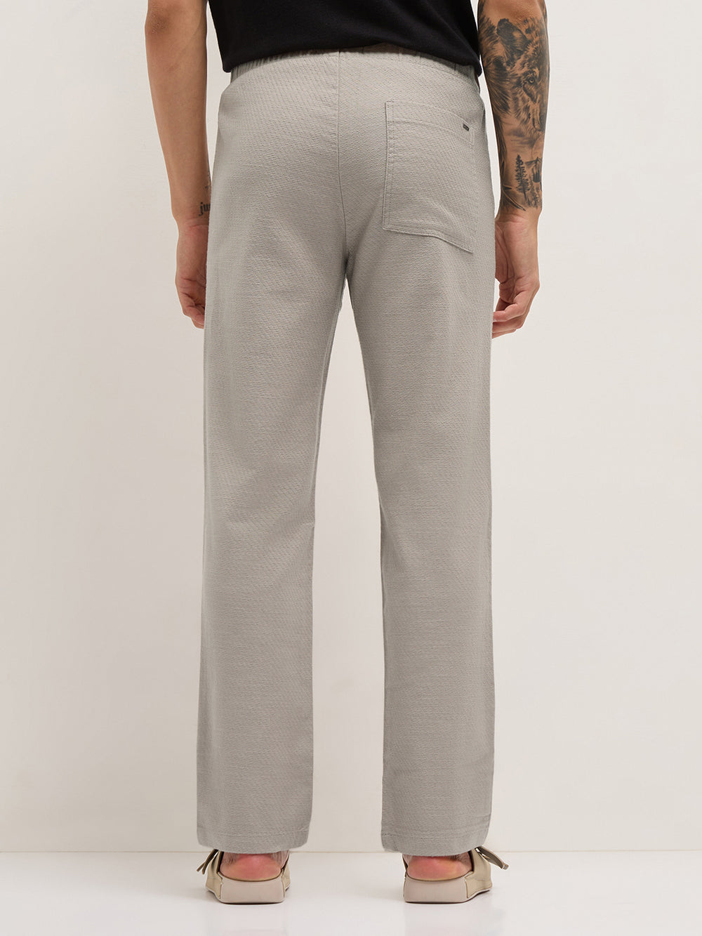 Beige Textured Straight Fit Casual Trousers with an Elasticated Waistband