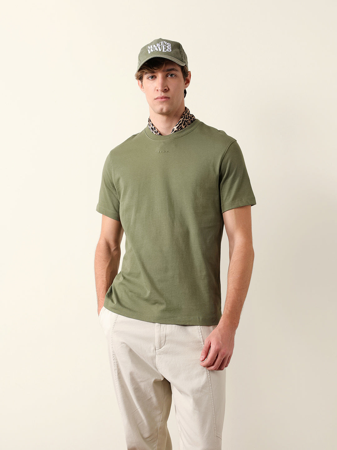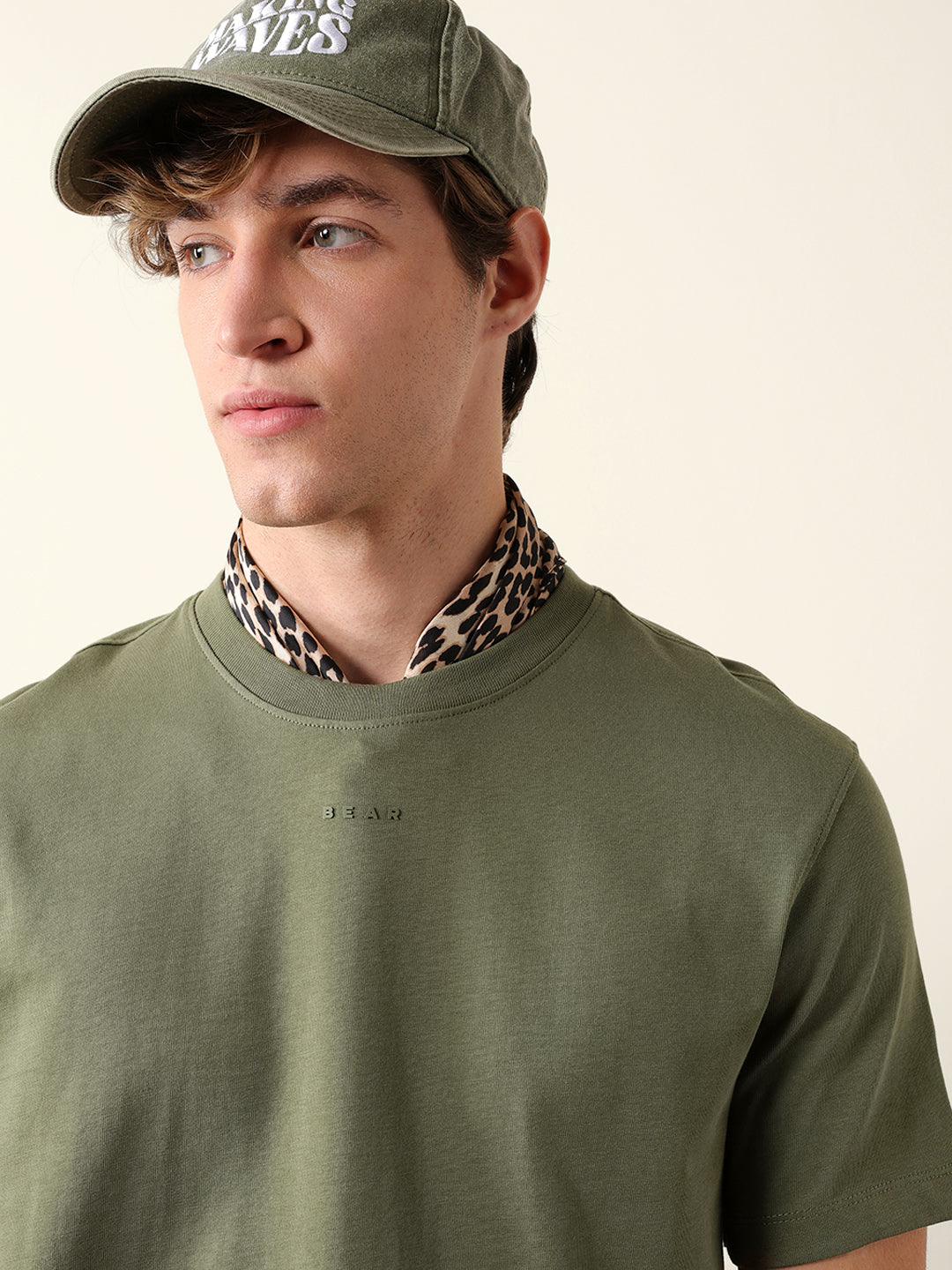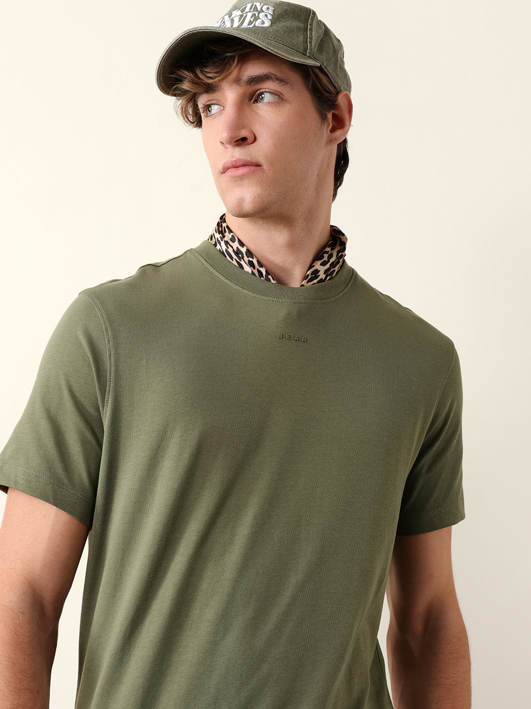 Olive Solid Crew Neck T-Shirt with “BEAR” Logo