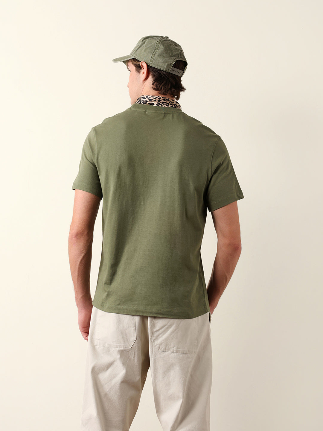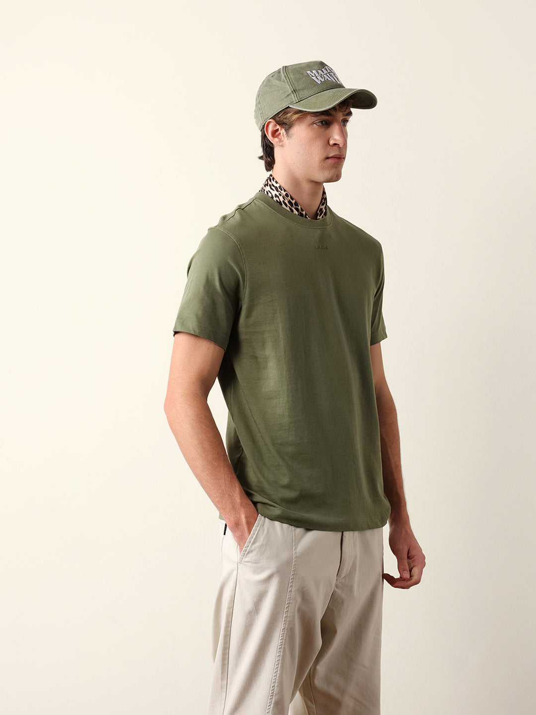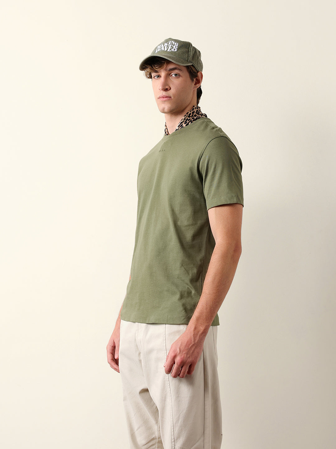 Olive Solid Crew Neck T-Shirt with “BEAR” Logo