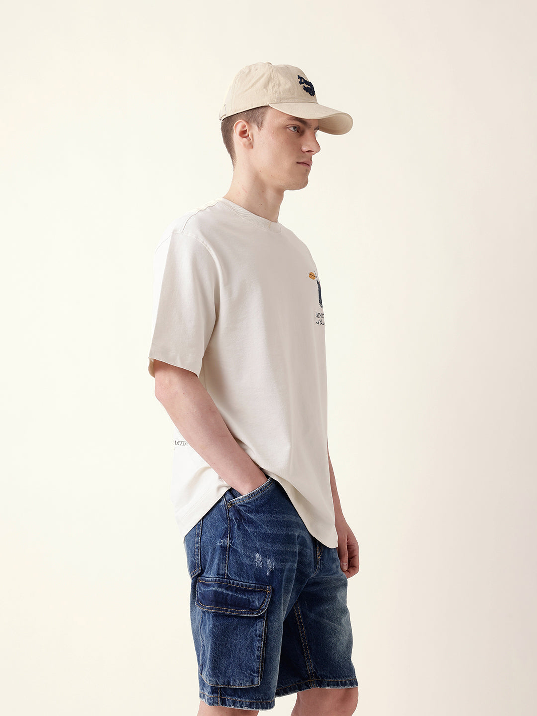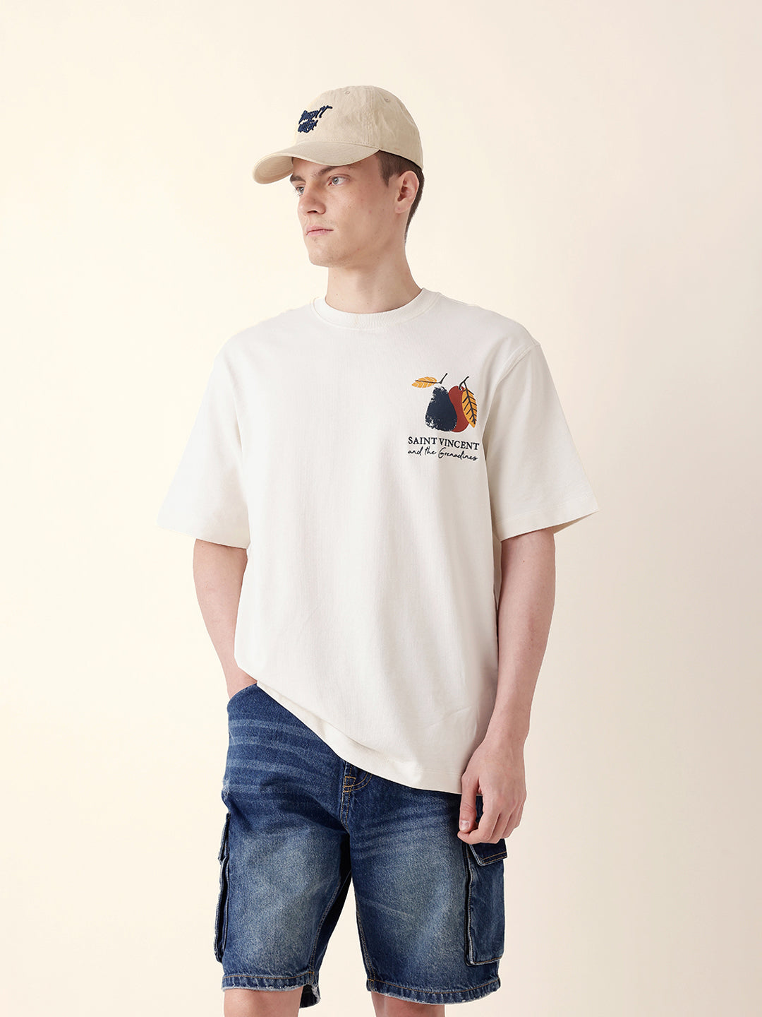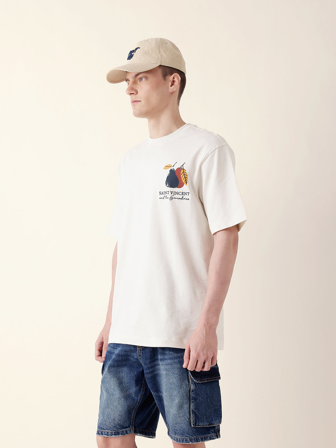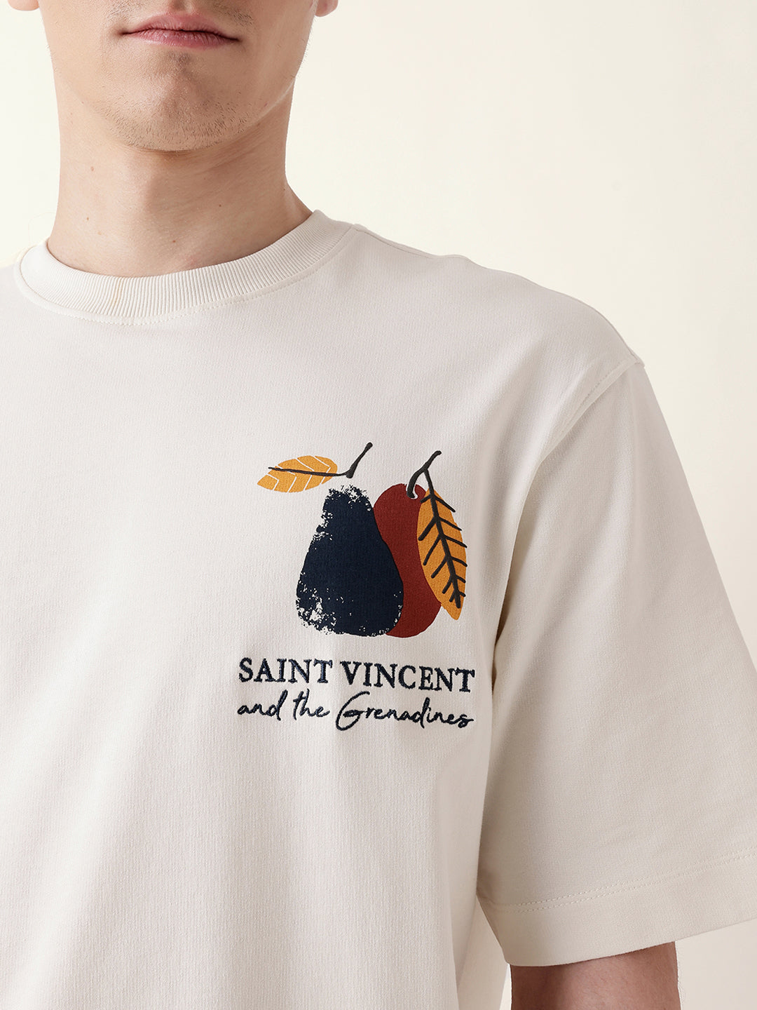 Cream Oversize Fit Crew Neck T-Shirt with Abstract Fruit Back Print