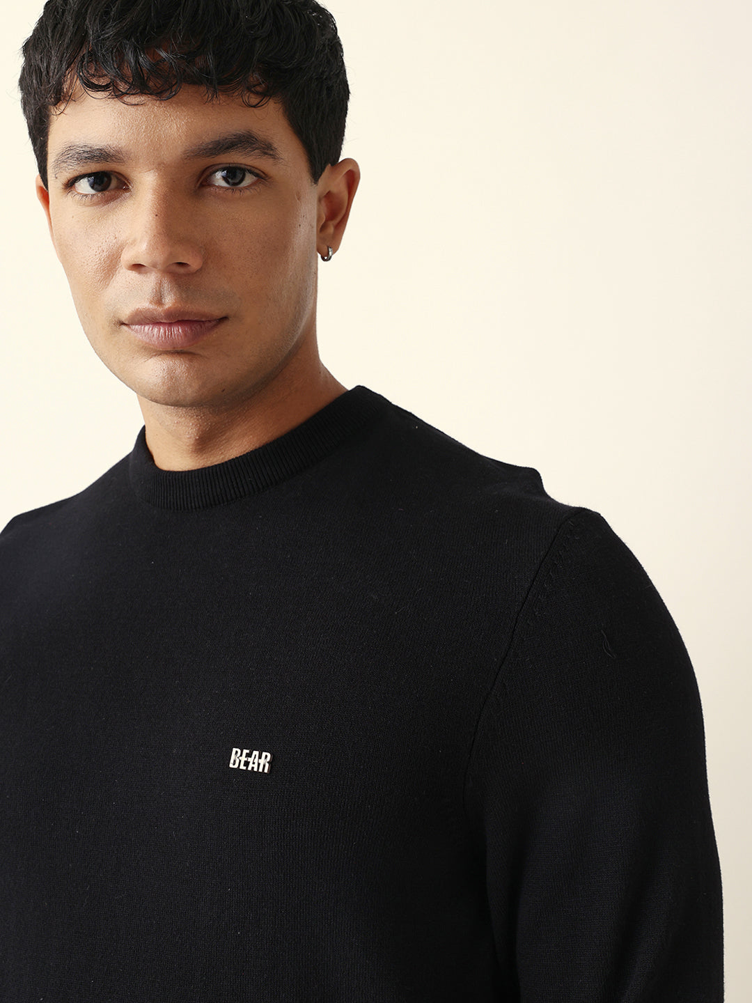 - Neck: Ribbed crew neck with metal logo detail