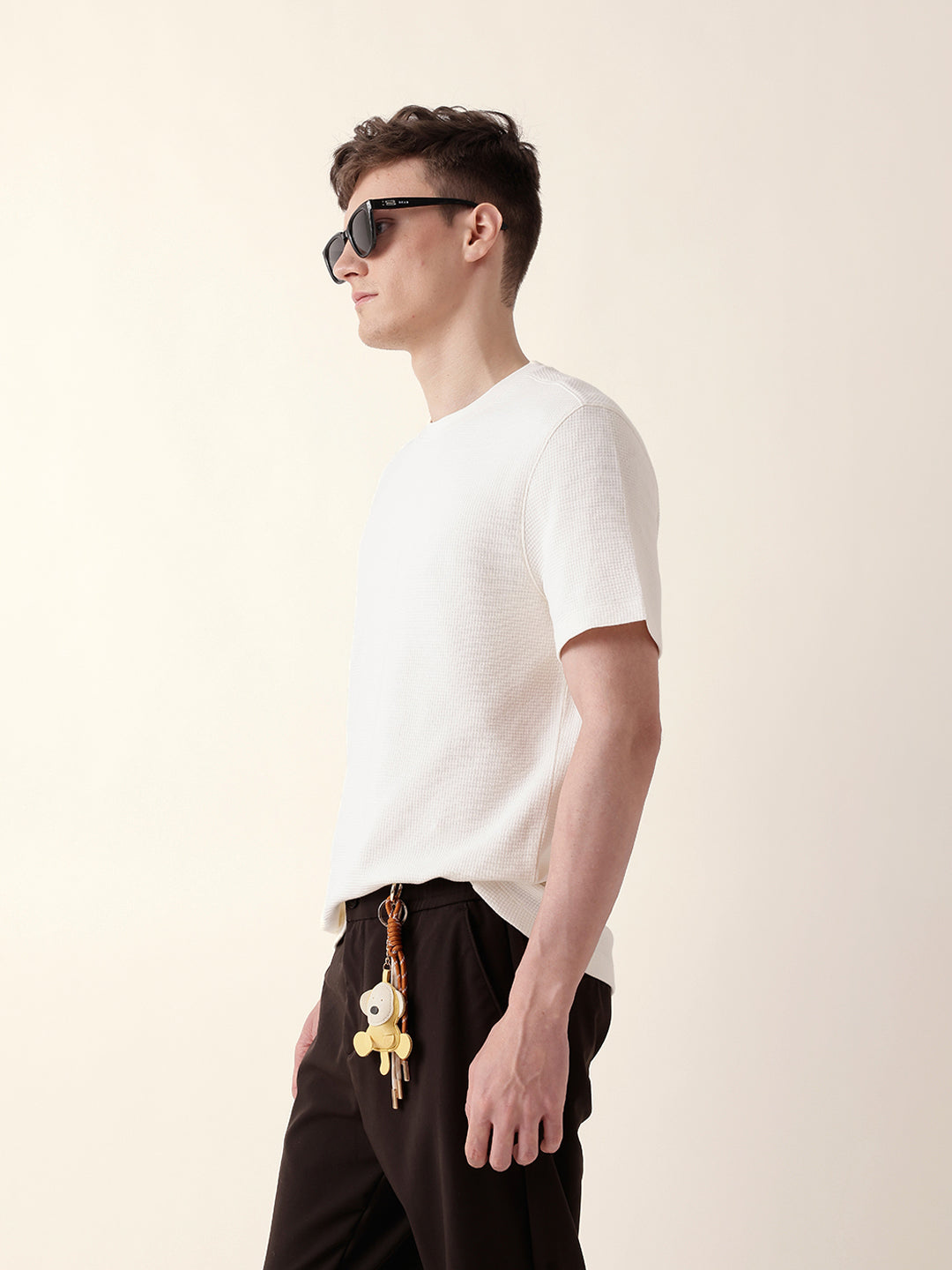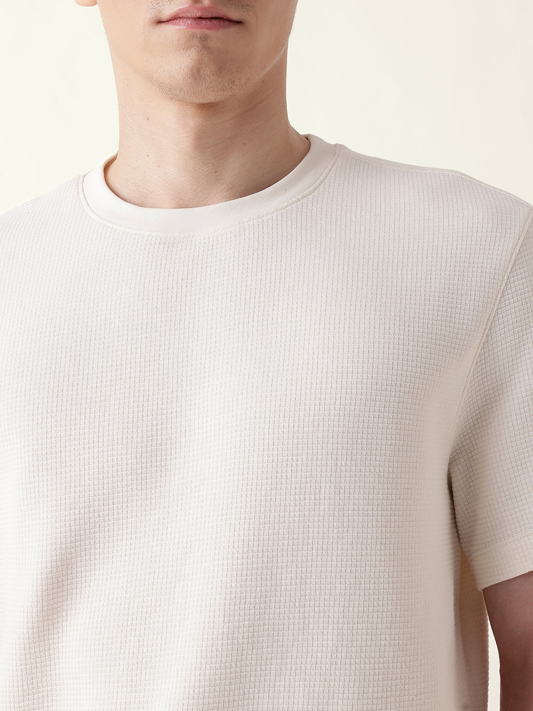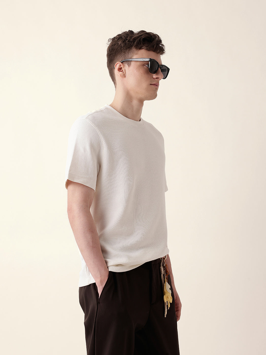 White Regular Fit Crew Neck T-Shirt with Textured Waffle Grid Design