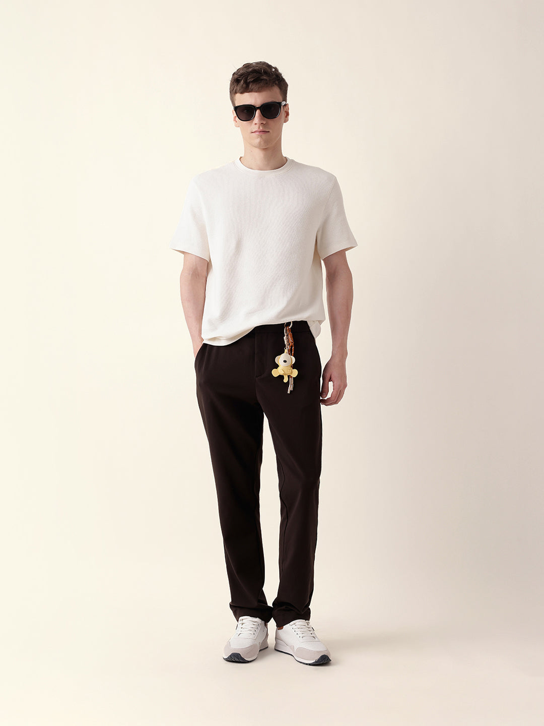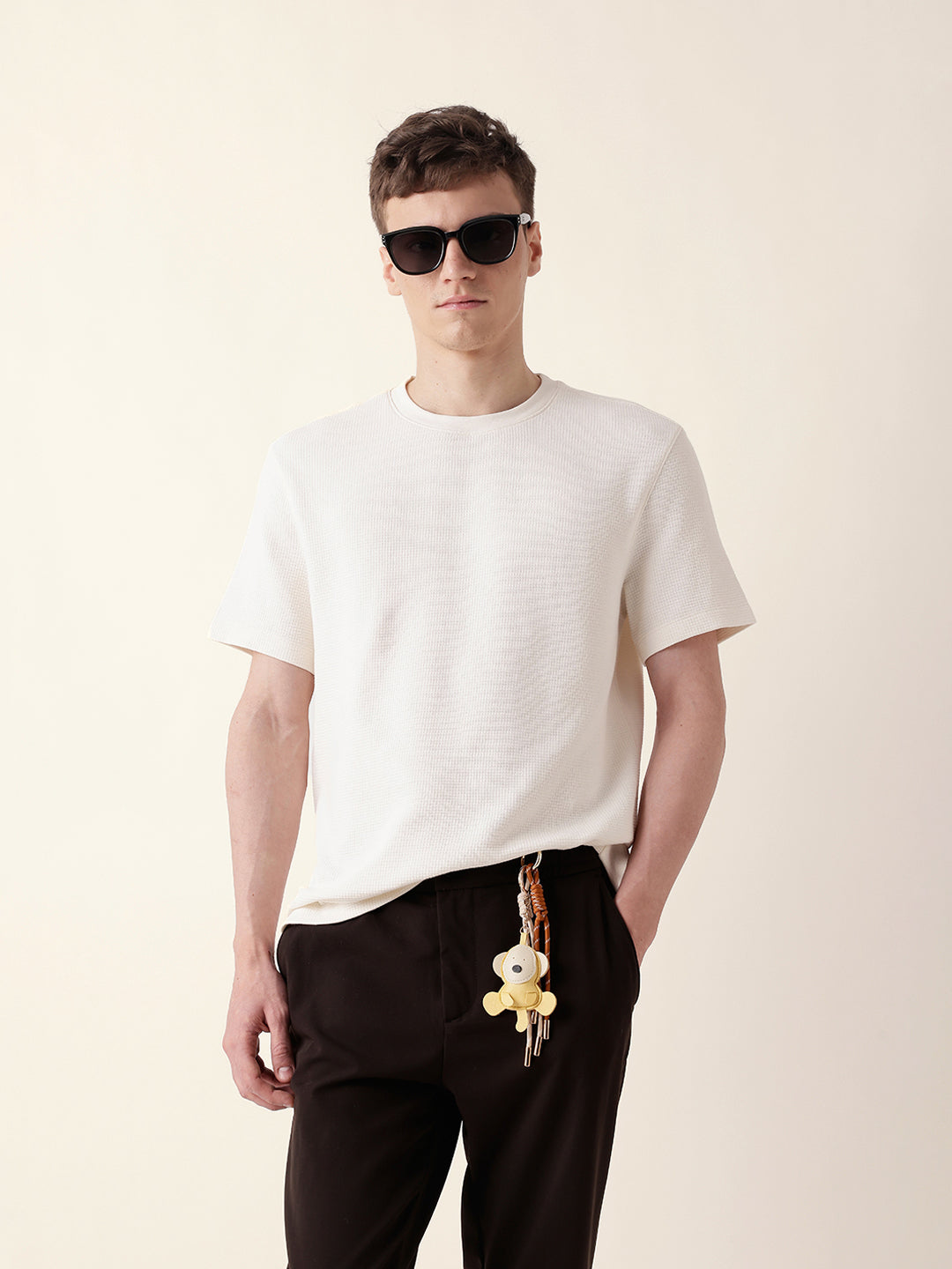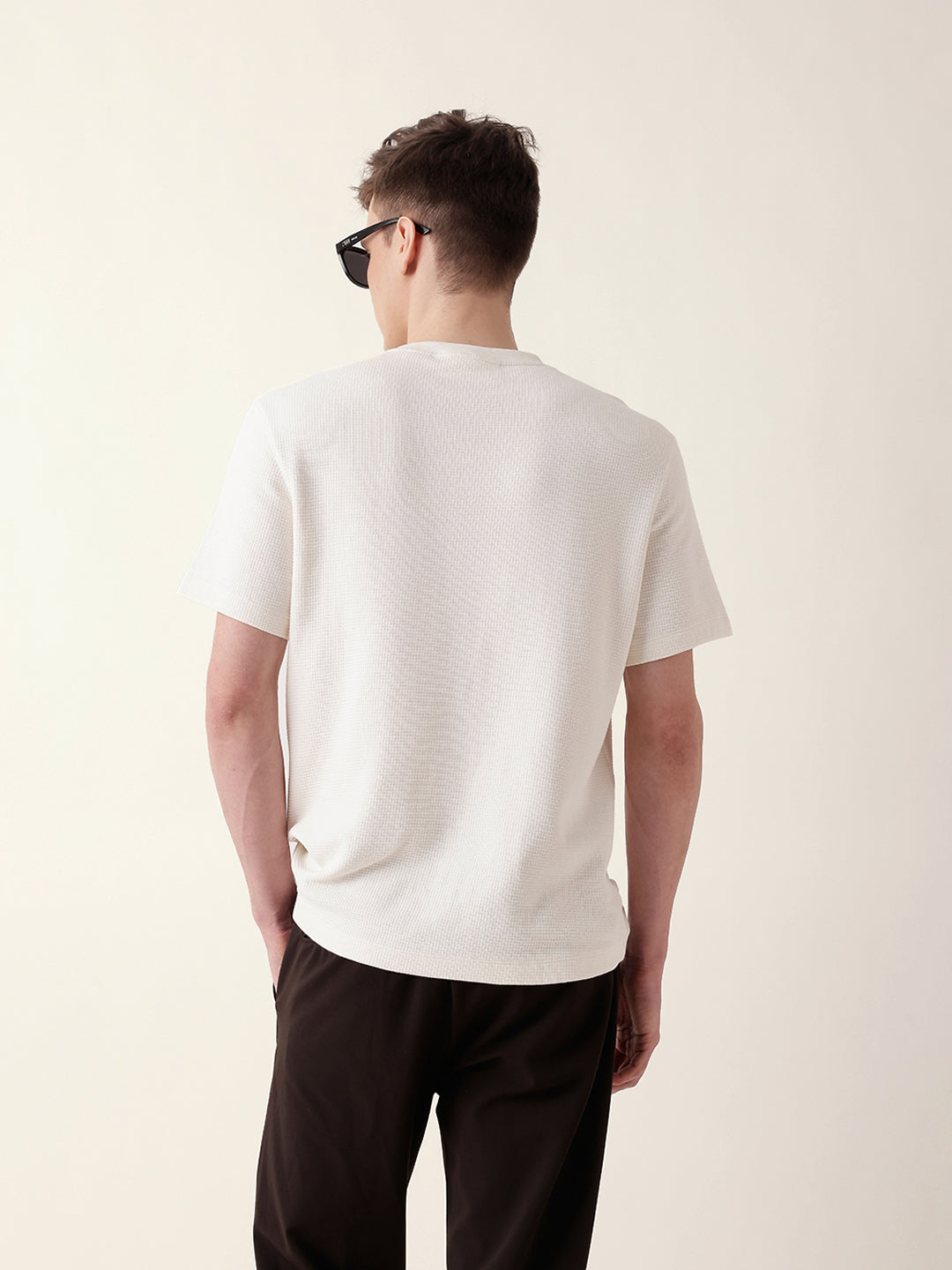 White Regular Fit Crew Neck T-Shirt with Textured Waffle Grid Design