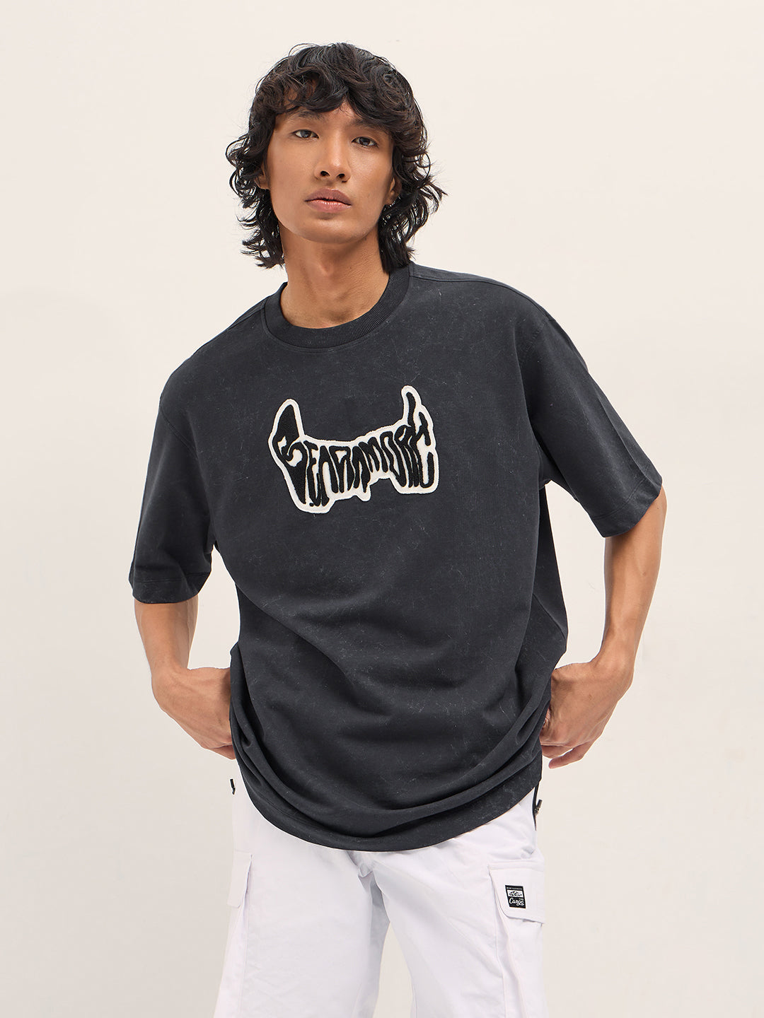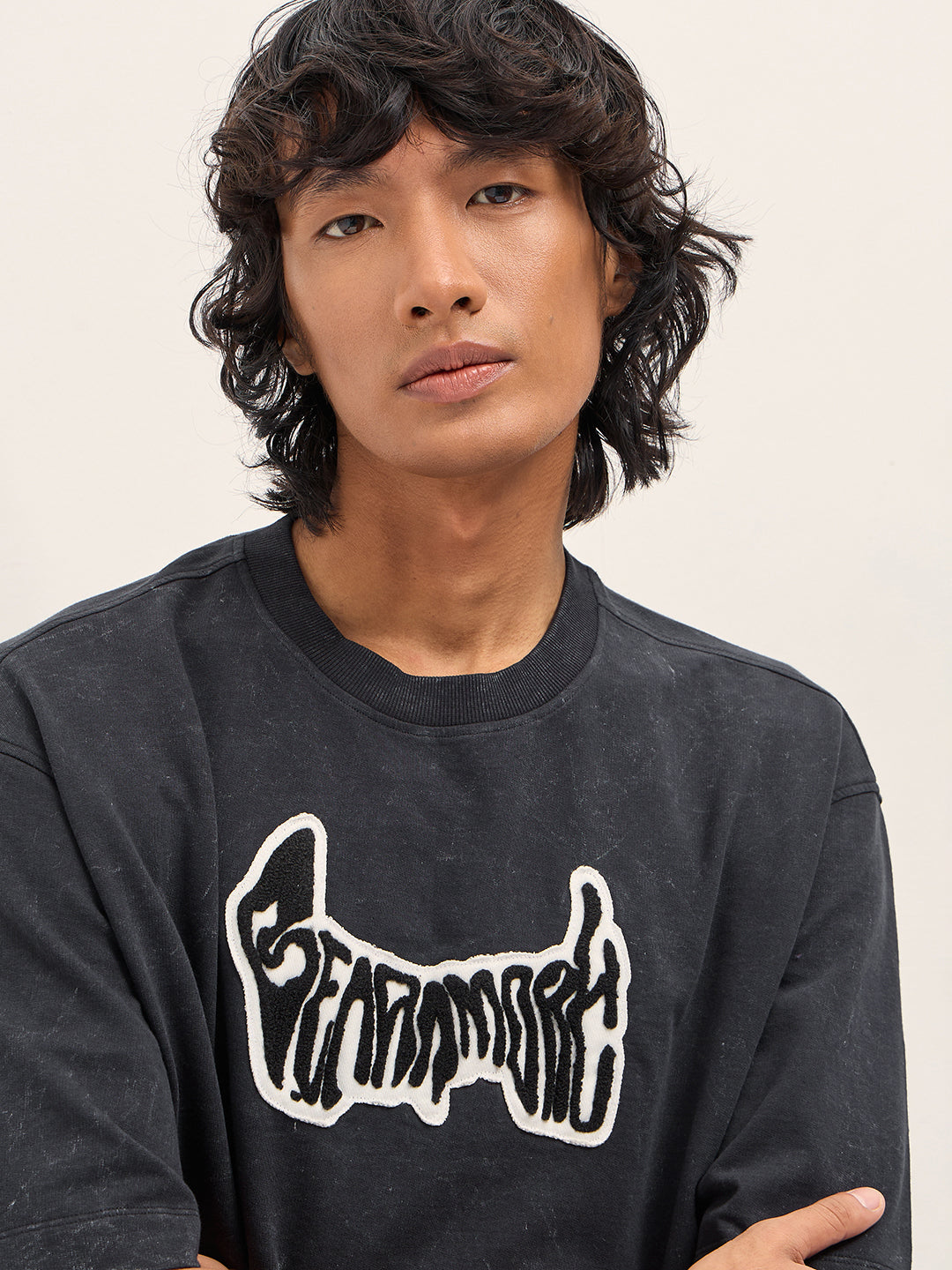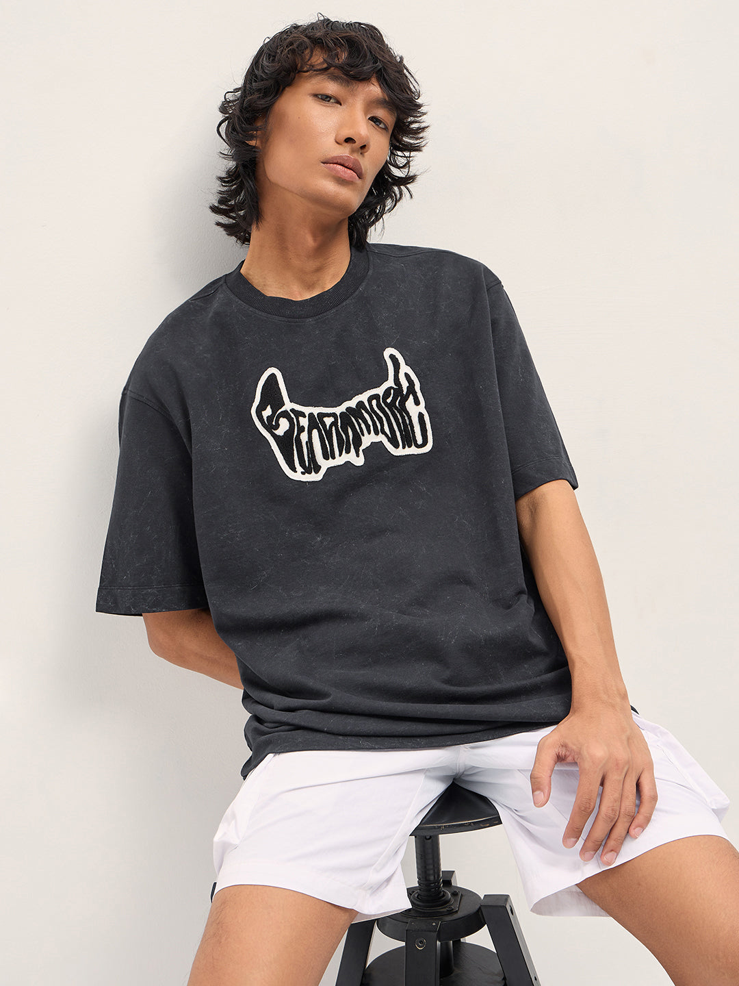 Grey Oversized Acid Wash T-Shirt with “Bear Amore” Chenille Patch