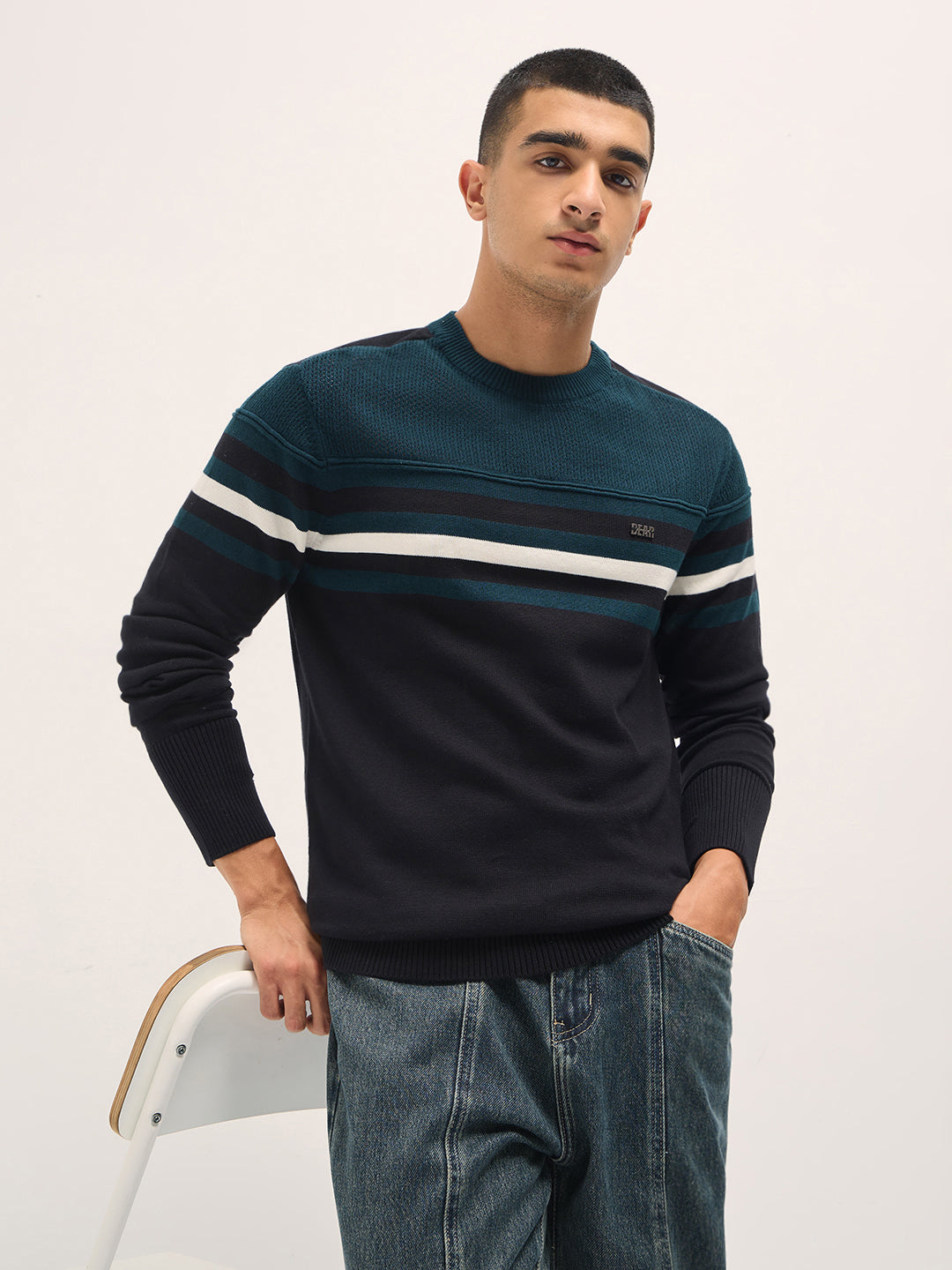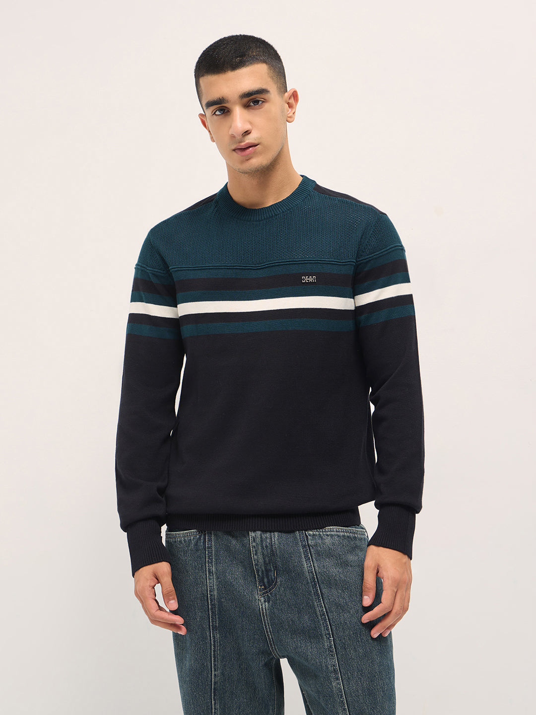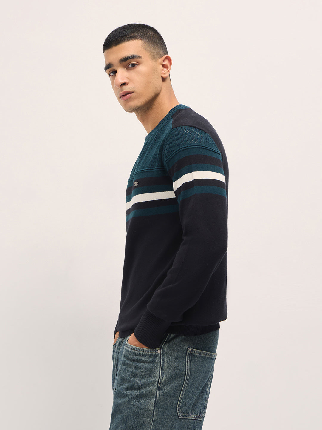 Shop Teal & Black Regular Fit Crew Neck T-Shirt with Ribbed Hem Online