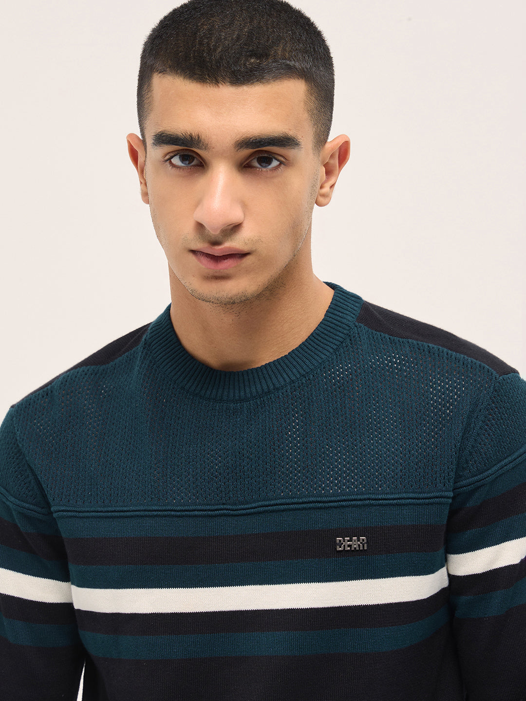 • Neck: Ribbed crew neck with metal logo detail
