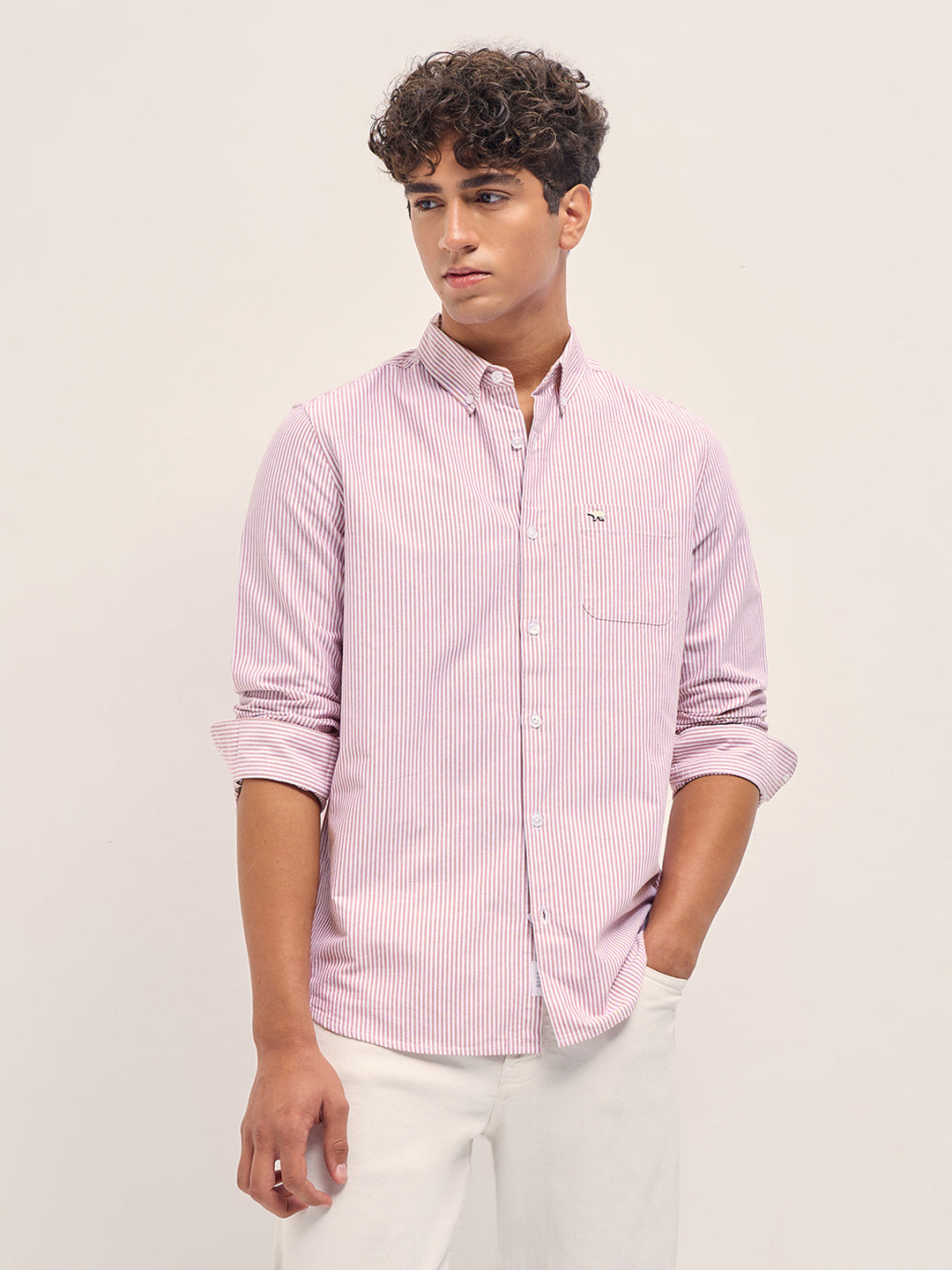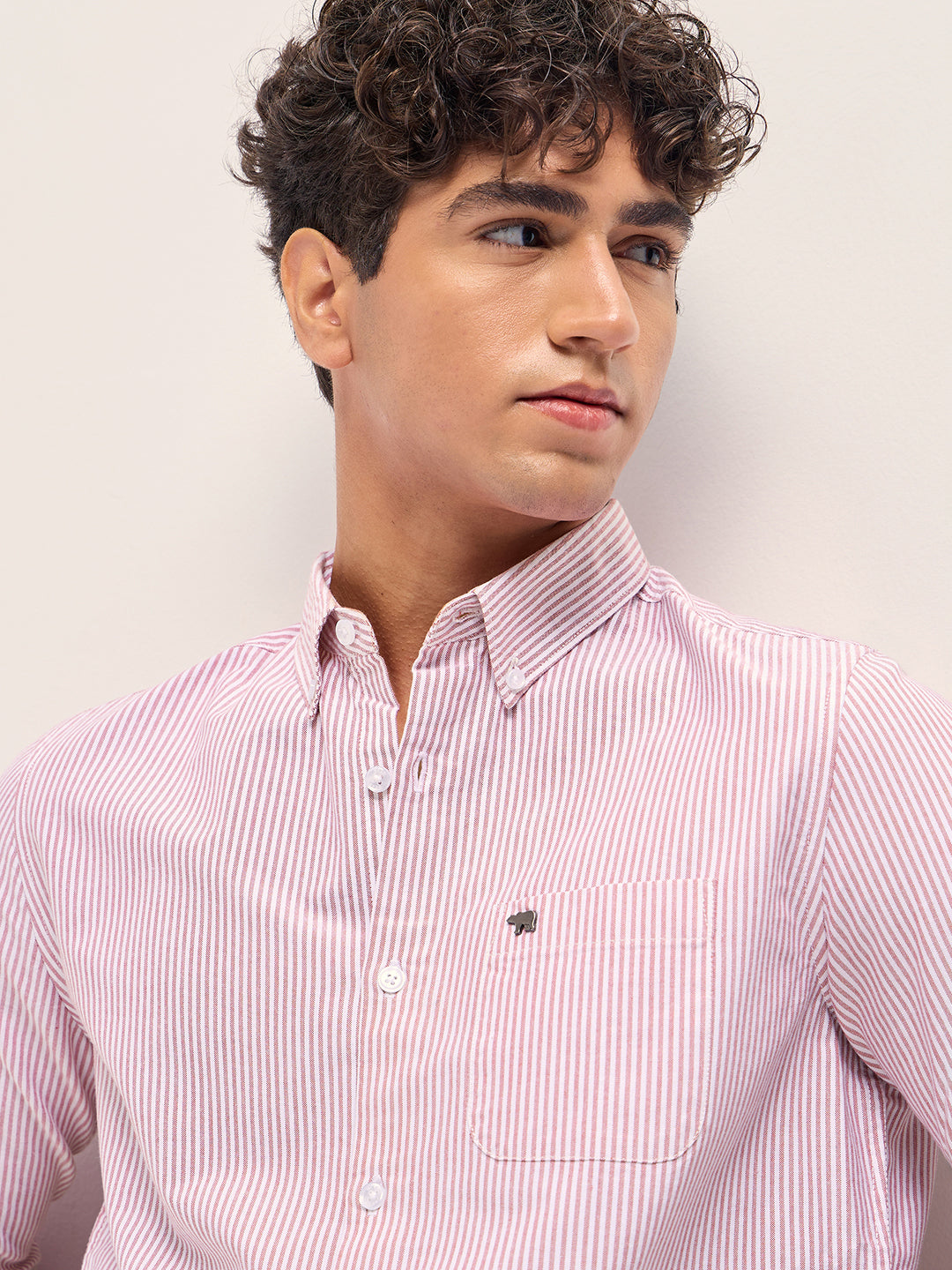 Red & White Vertical Pinstriped Cotton Slim Fit Casual Shirt