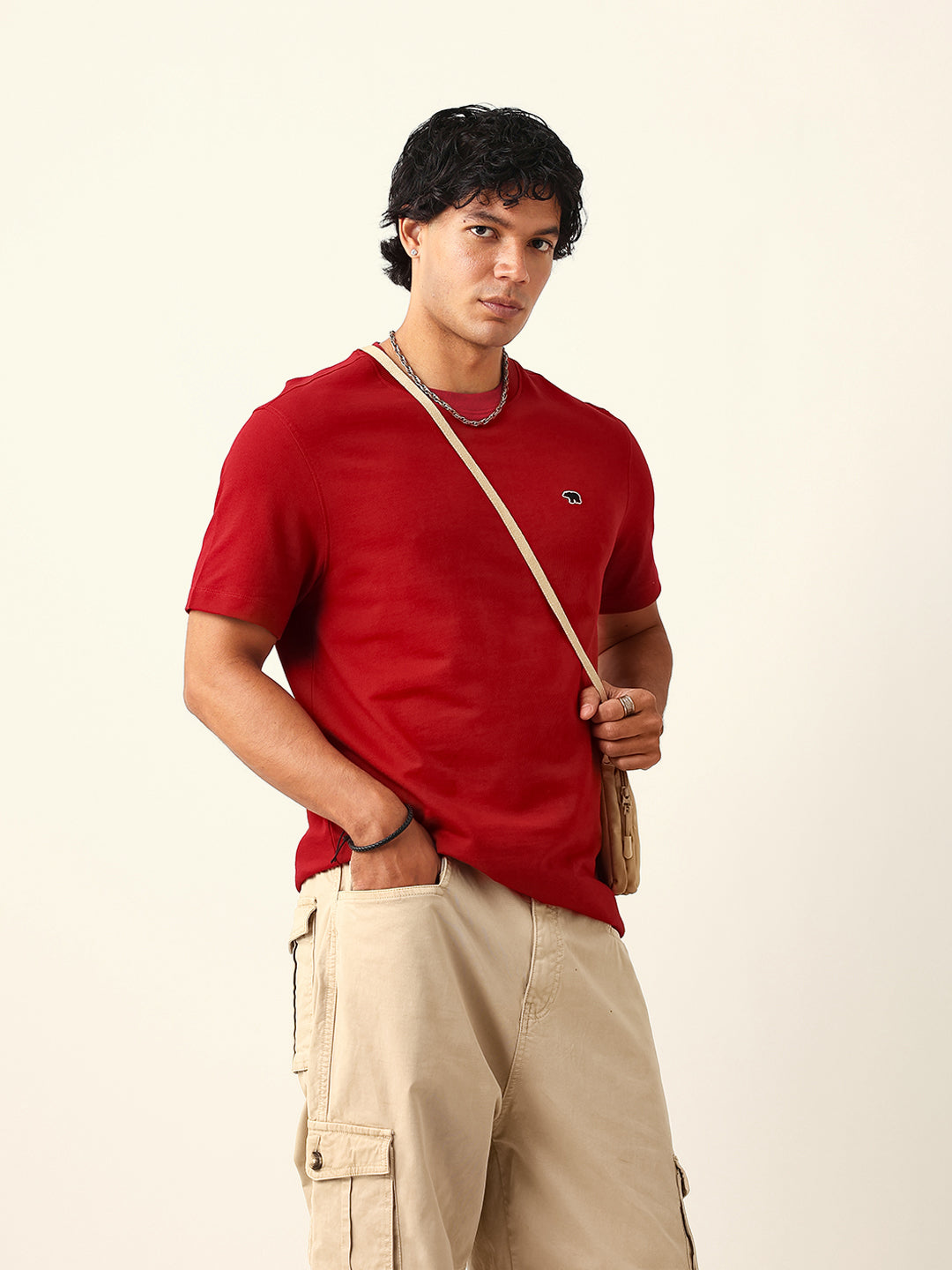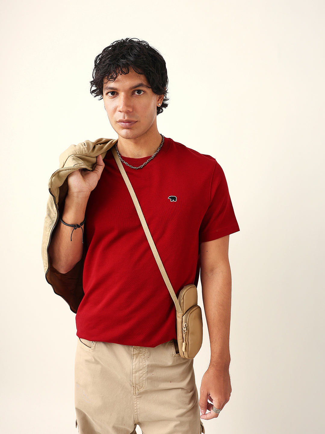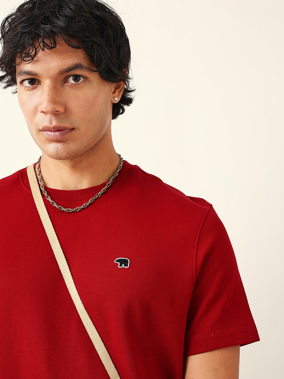 Shop Deep Red Crew Neck T-Shirt with Bear Logo Embroidery Online