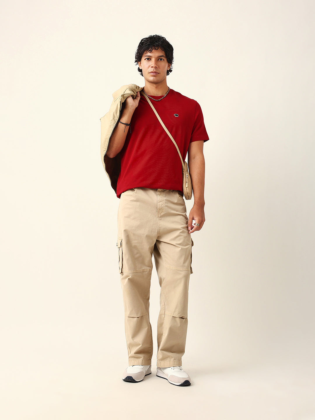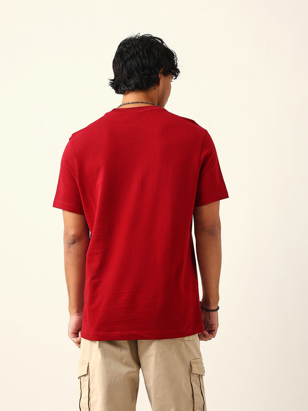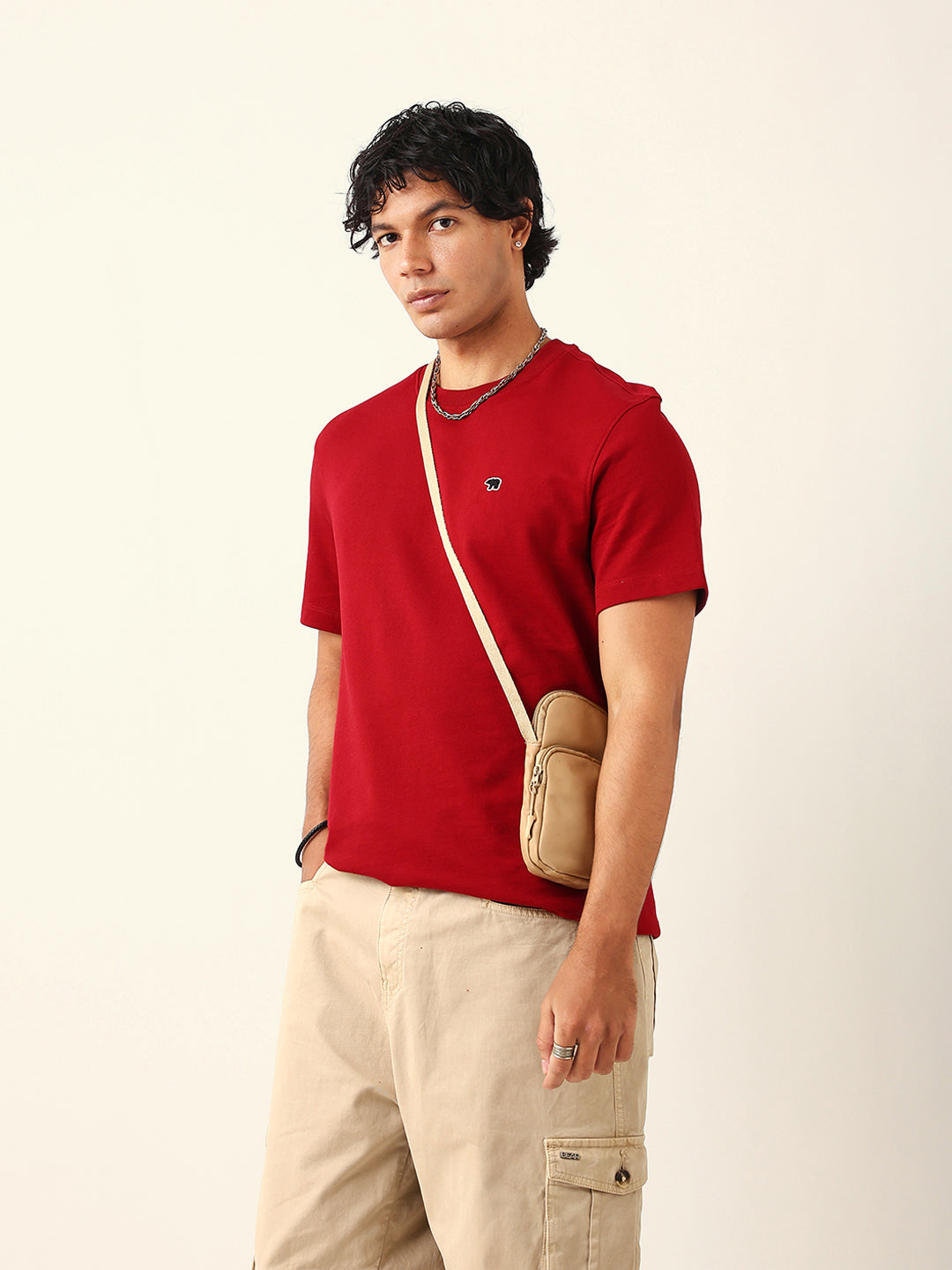 Shop Deep Red Crew Neck T-Shirt with Bear Logo Embroidery Online