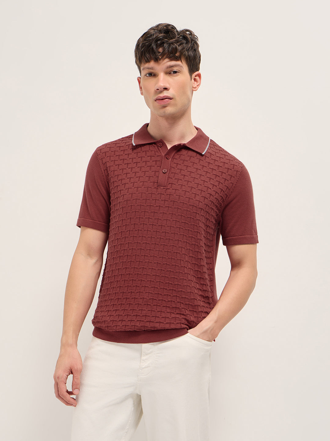 Red Regular Fit Geometric Textured Knit Polo Shirt