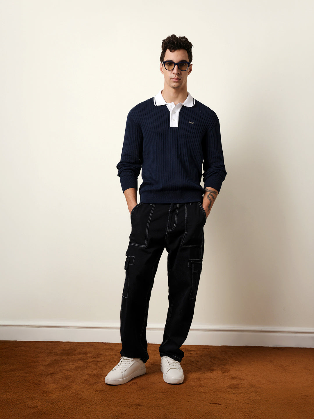 - Collar: Contrast Blue polo collar with a half-button placket