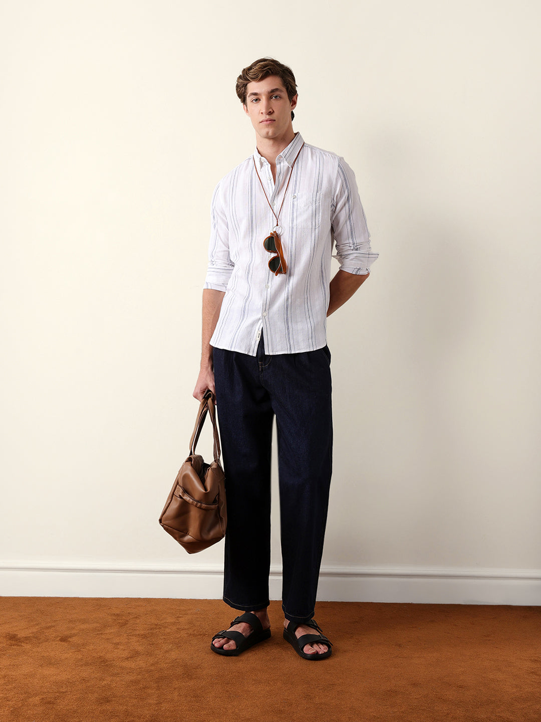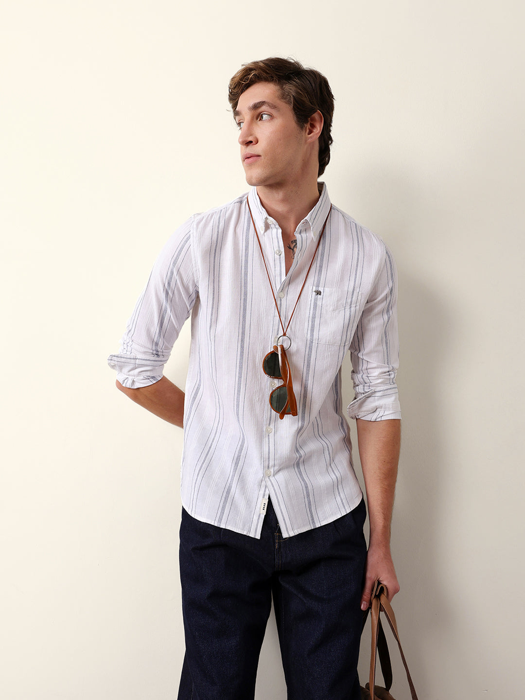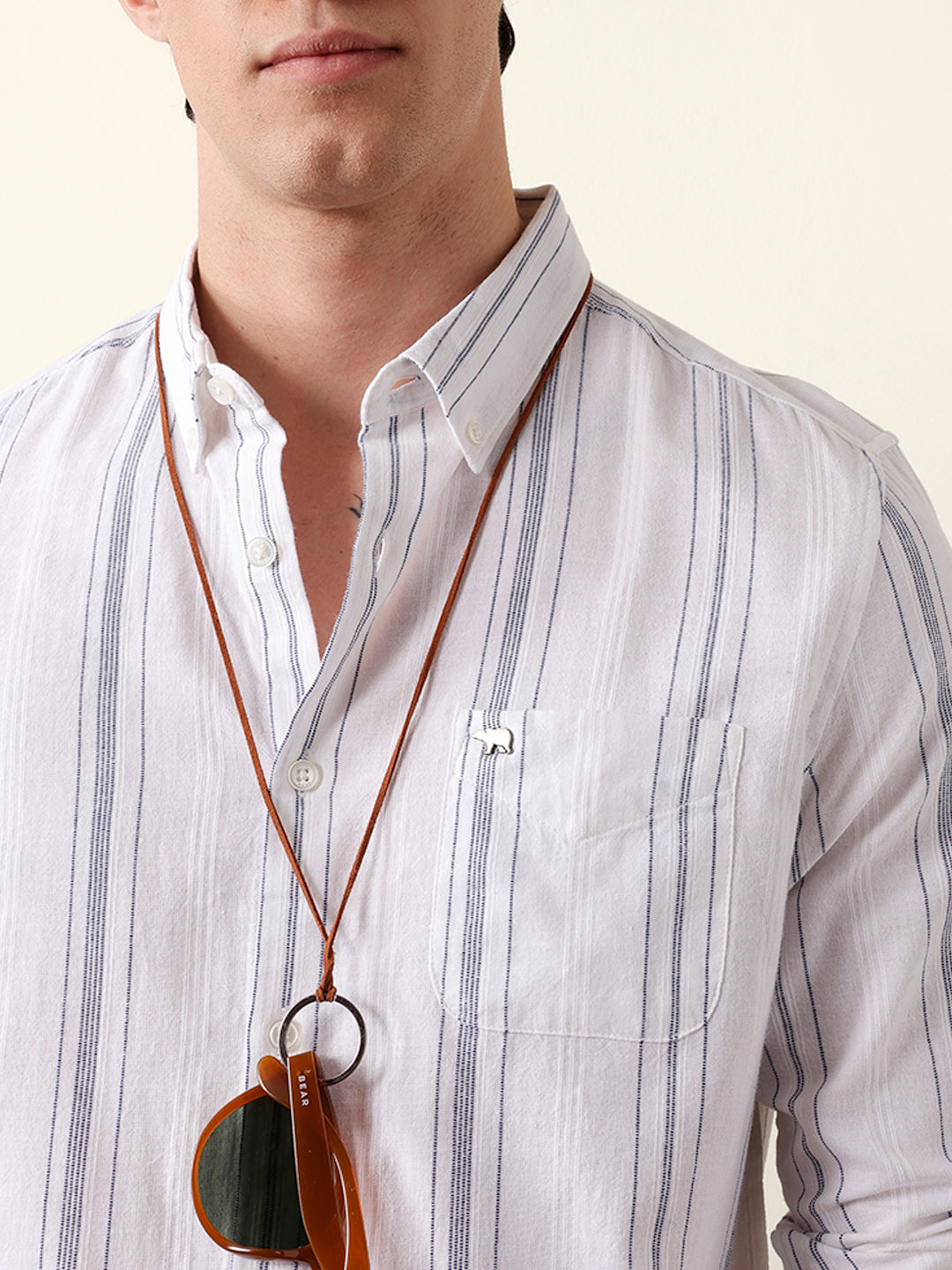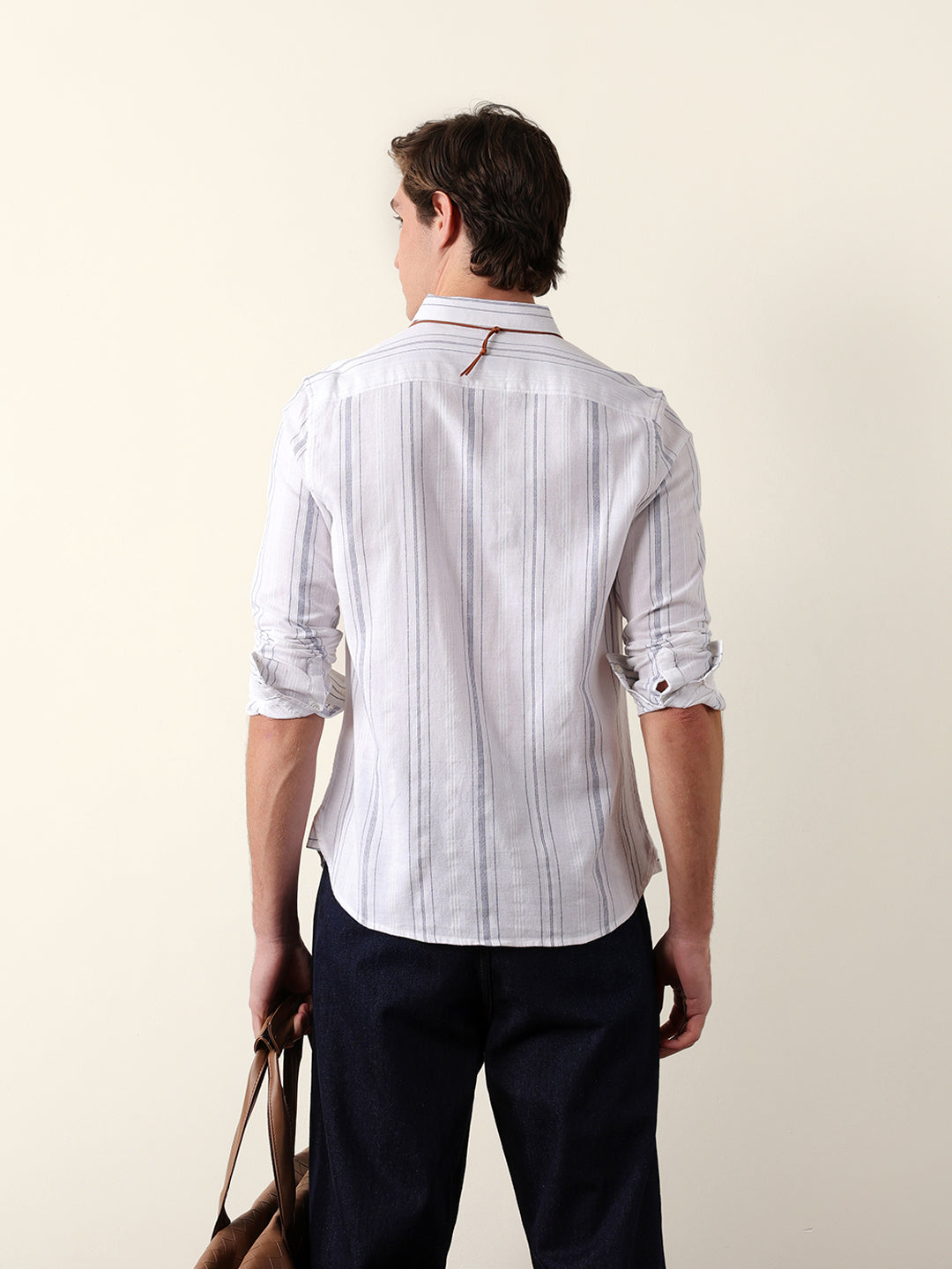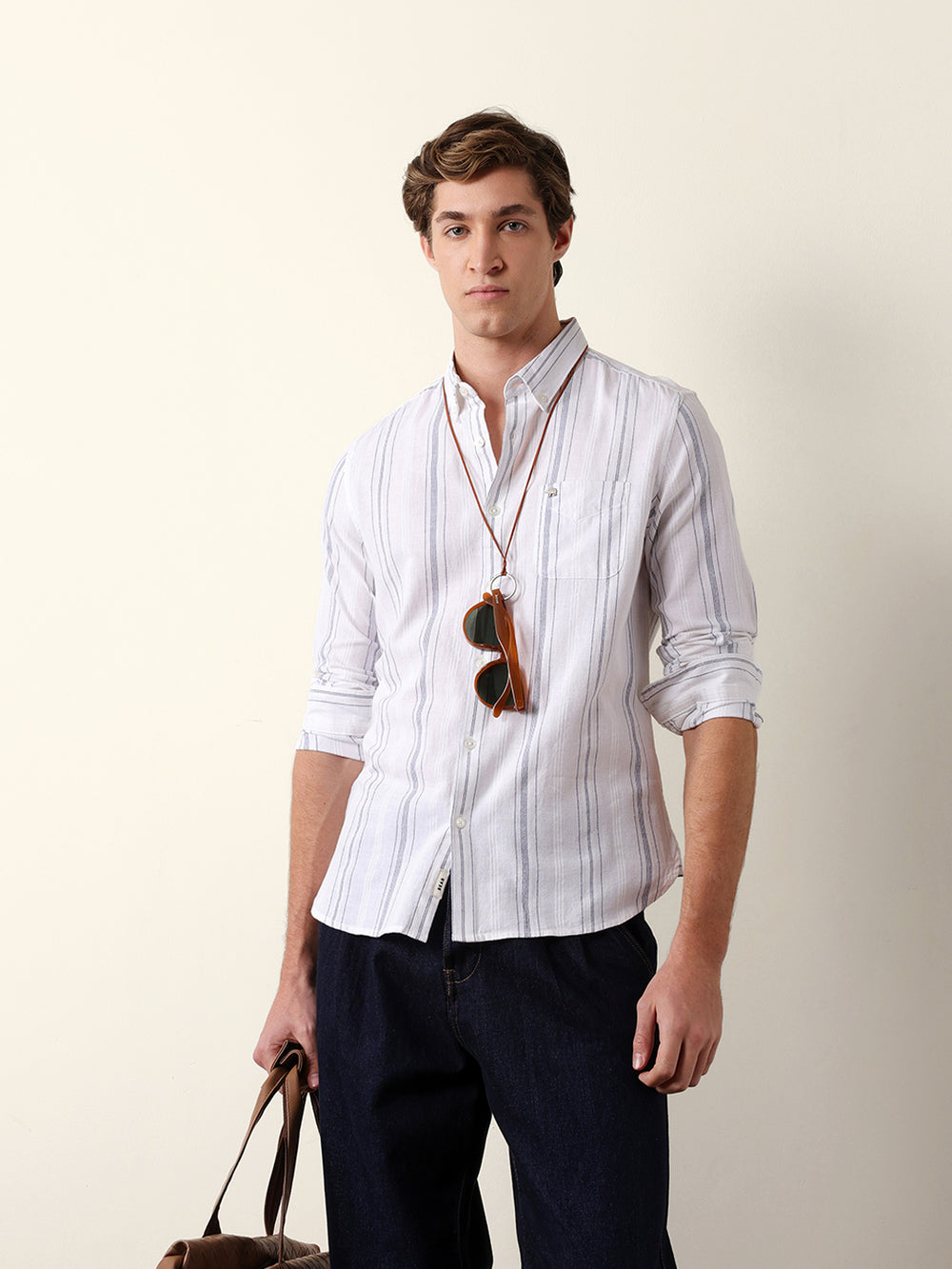 White Woven Vertical Stripes Slim Fit Casual Shirt