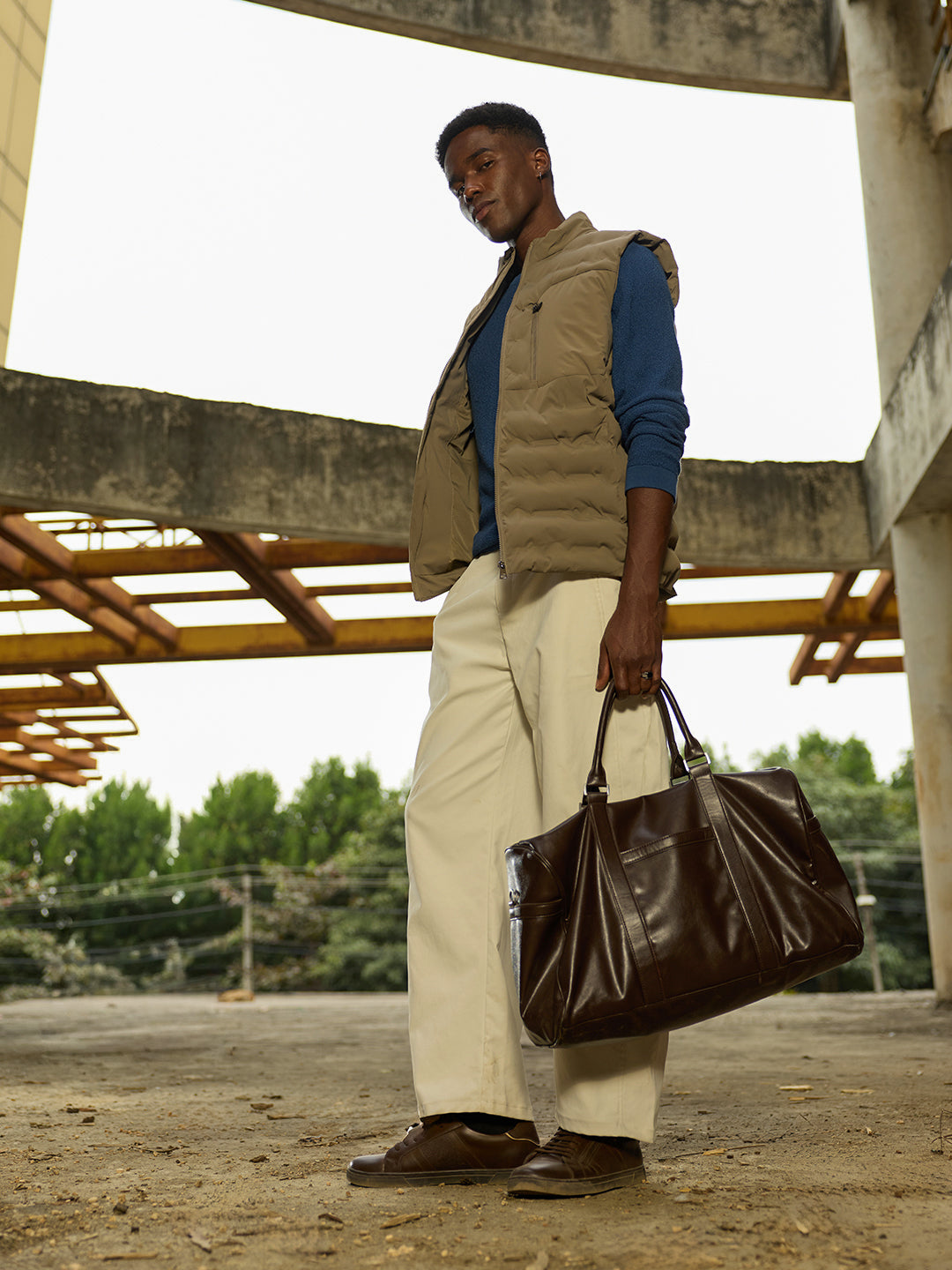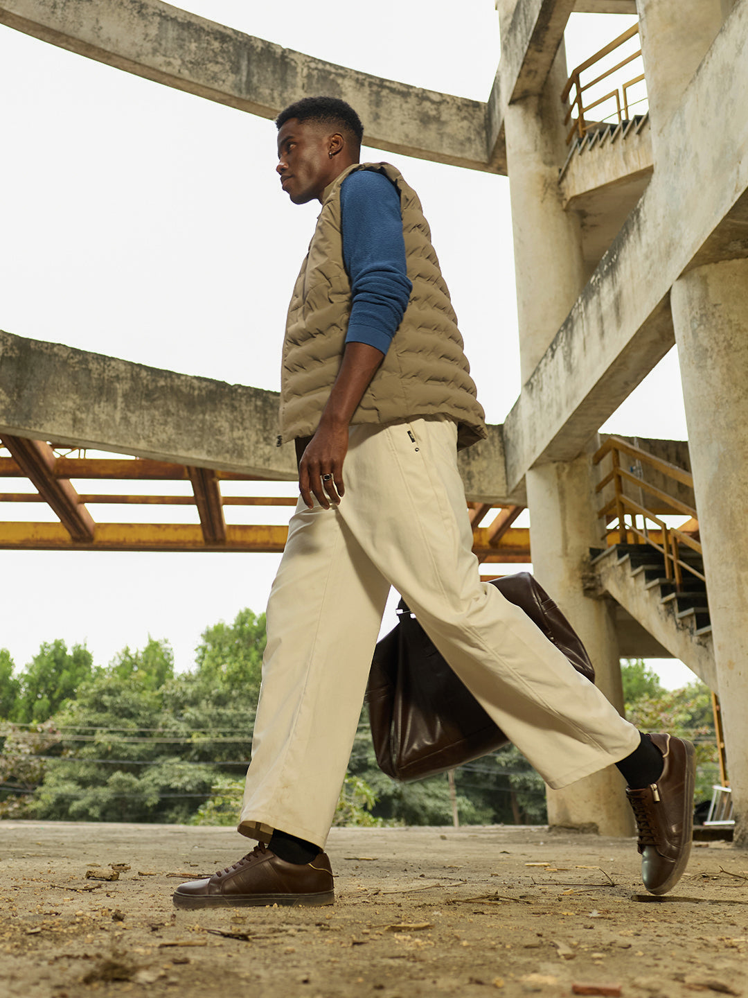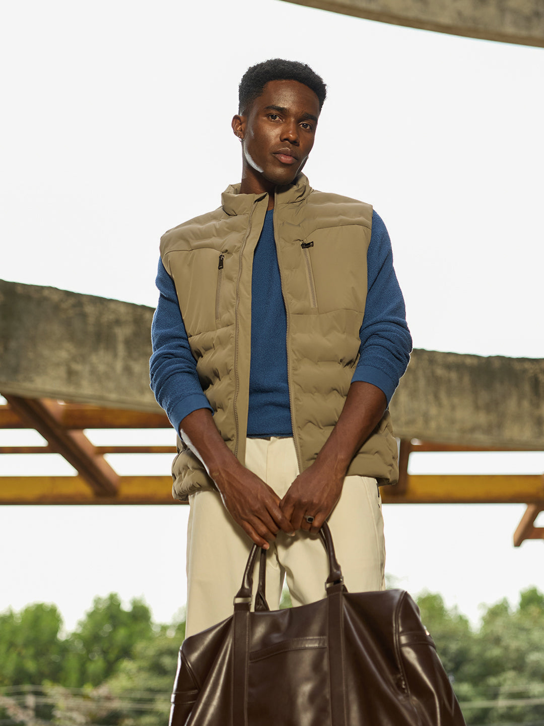 Light Brown Solid Regular Fit Gilet Puffer Jacket with Utility Zipper Pockets