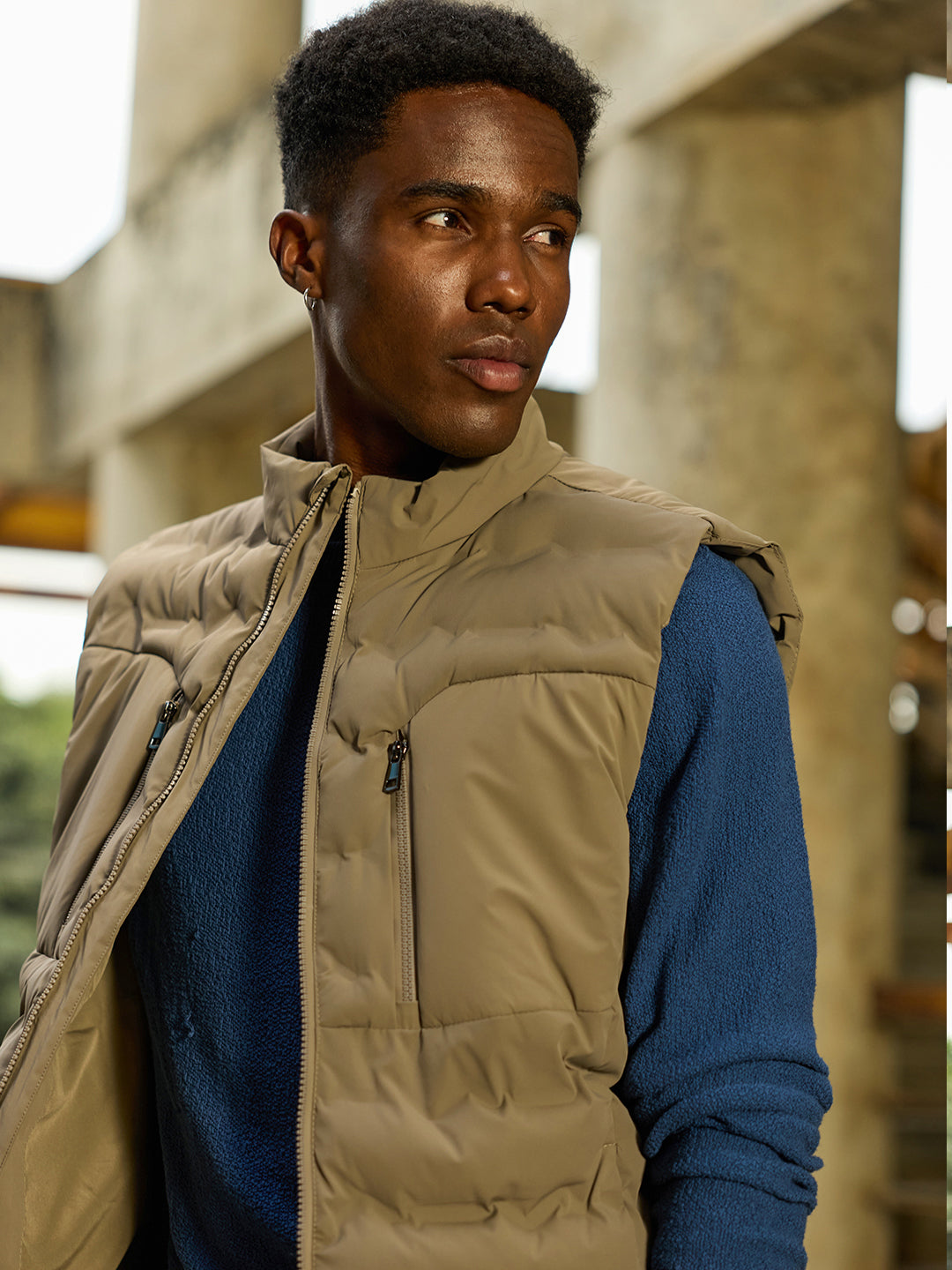 - Design: Quilted sleeveless puffer design with horizontal panel construction