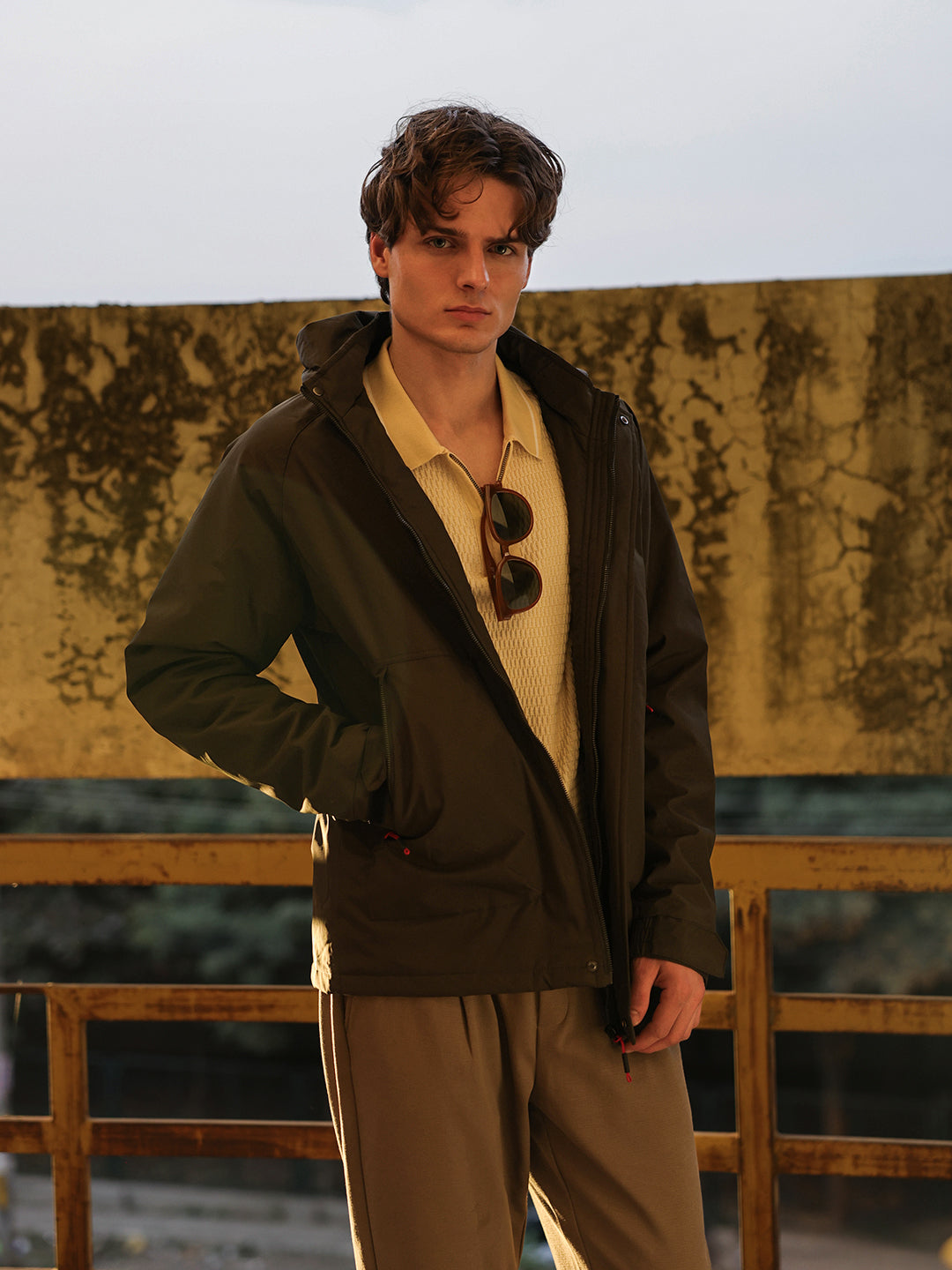 Olive Regular Fit Utility Jacket with Detachable Hood and Water-Repellent Finish