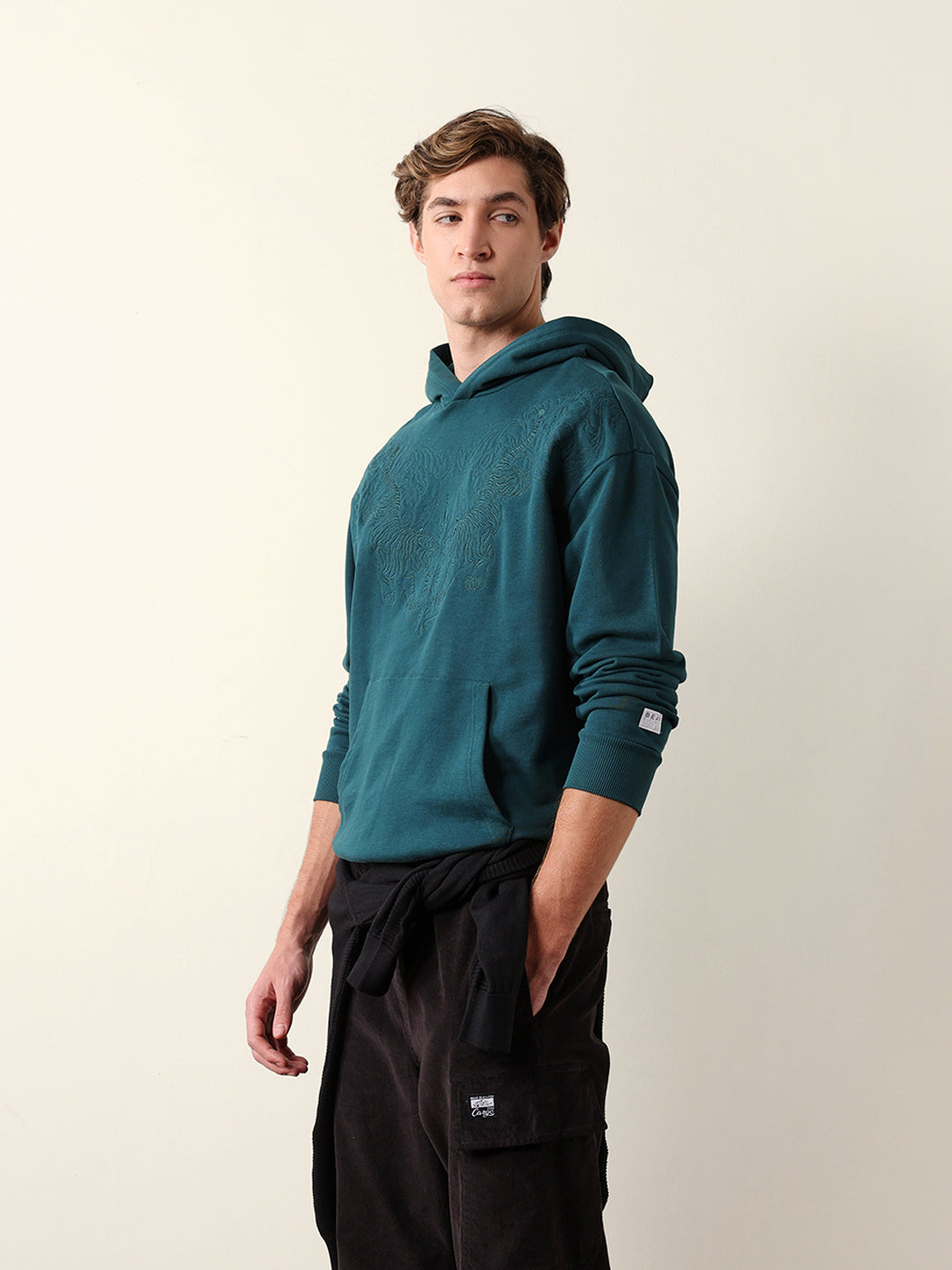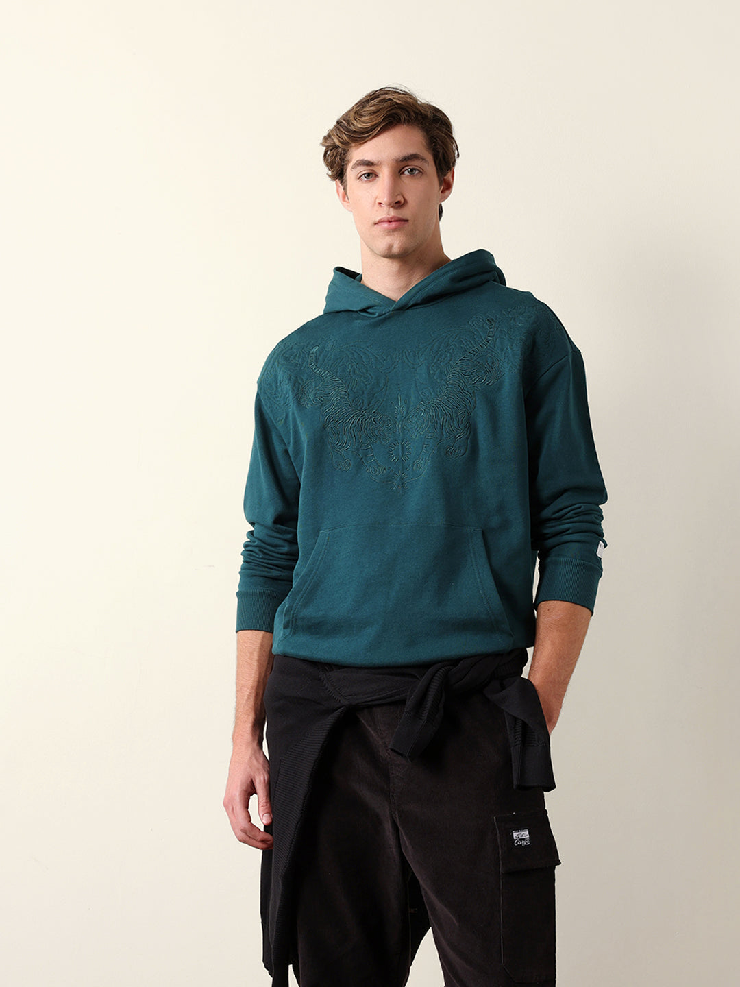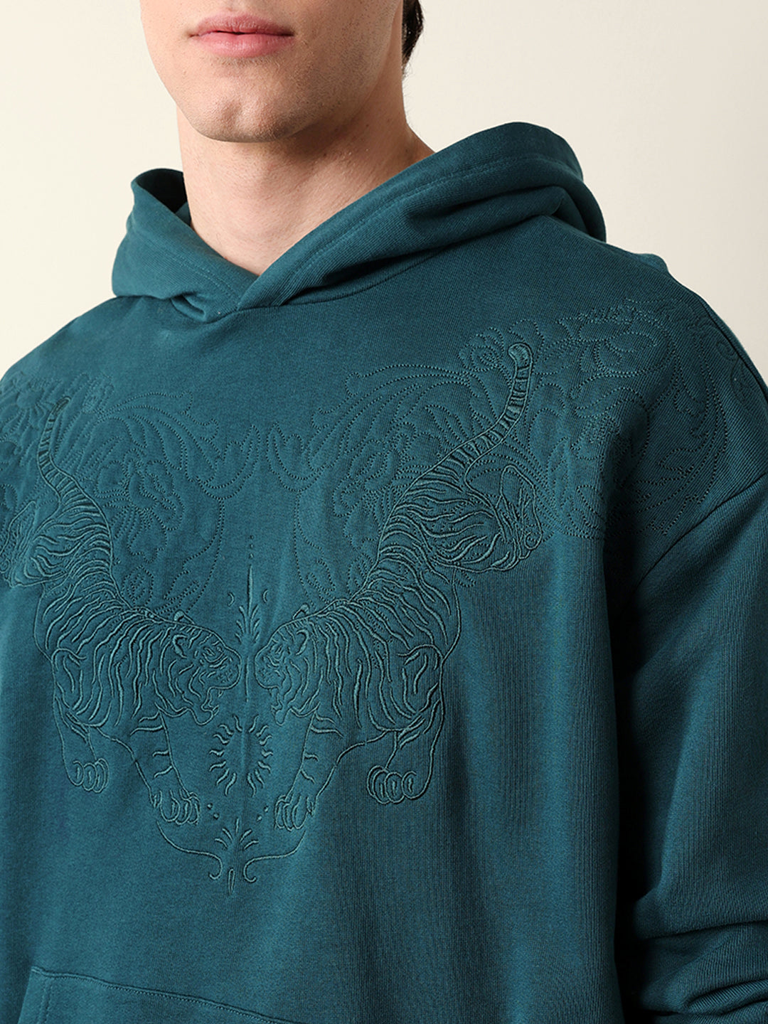 Teal Relaxed Fit Hoodie with Tonal Tiger Embroidered Motif
