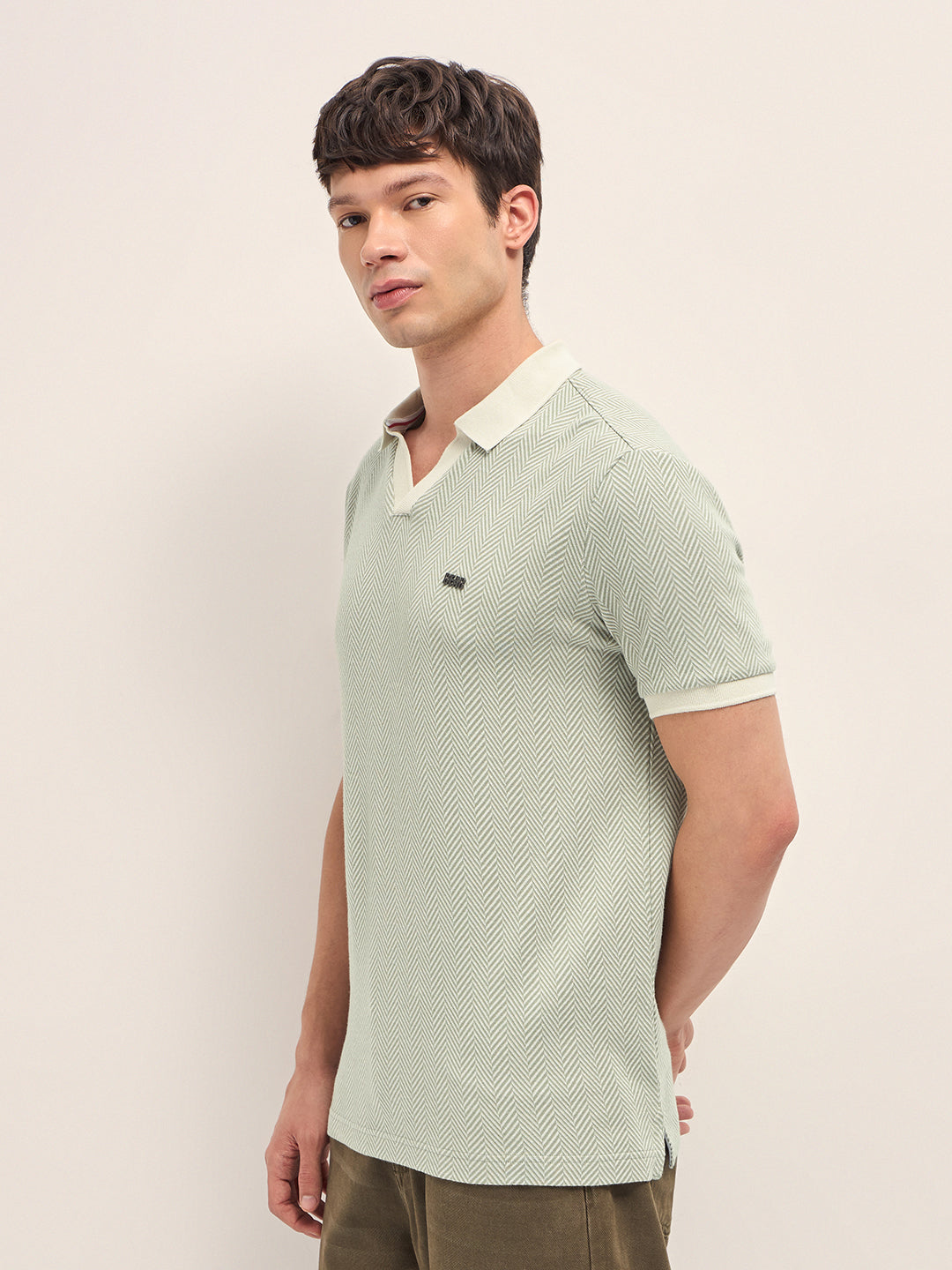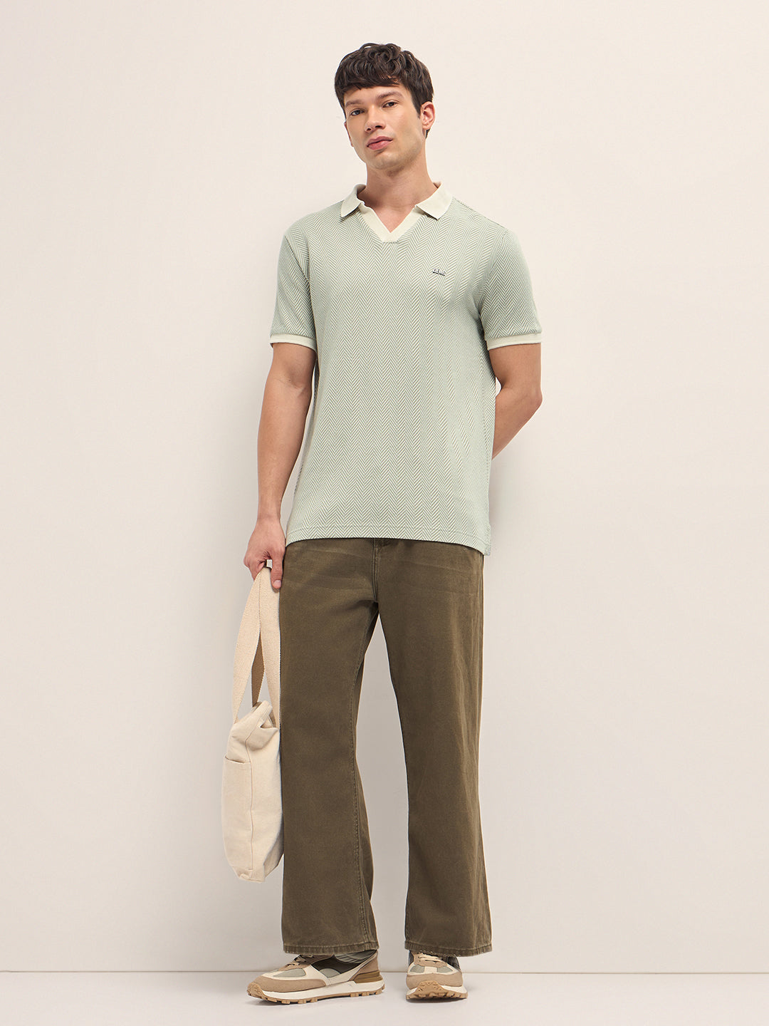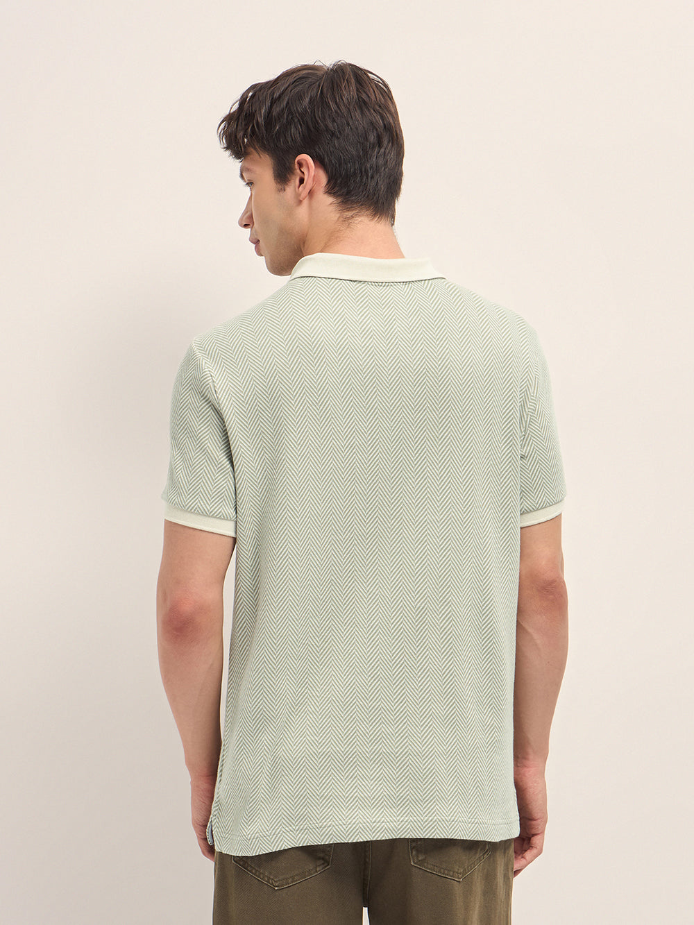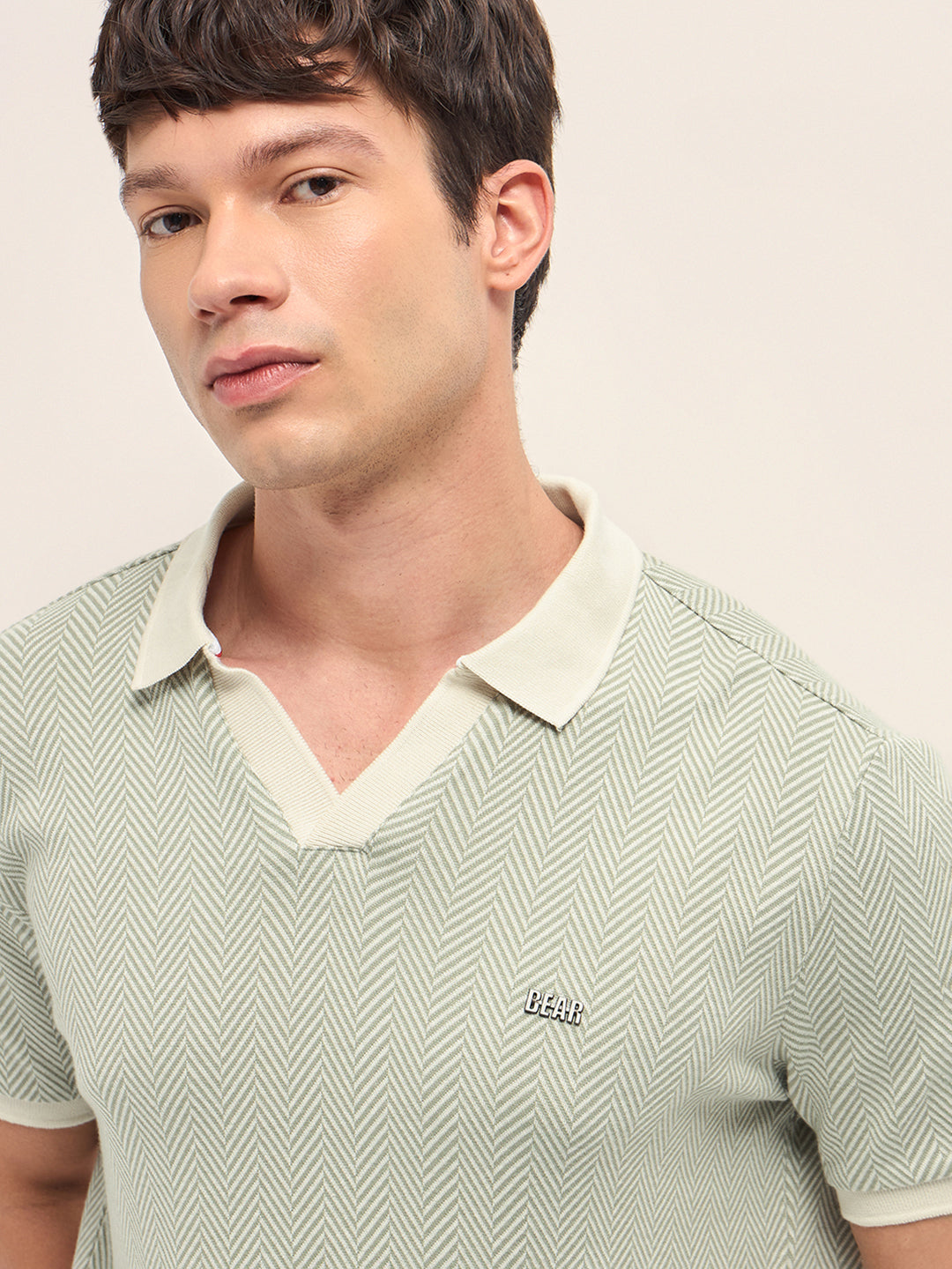Sage Green Textured Knit Polo with Contrast Collar and Open V-Placket