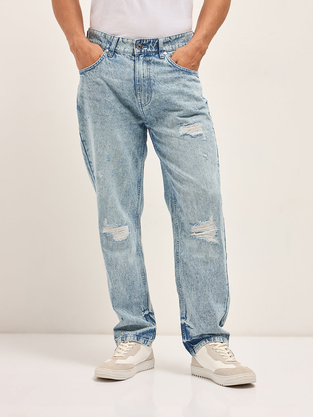 Light Blue with Light Fade Distressed Mid-Rise Straight Fit Jeans