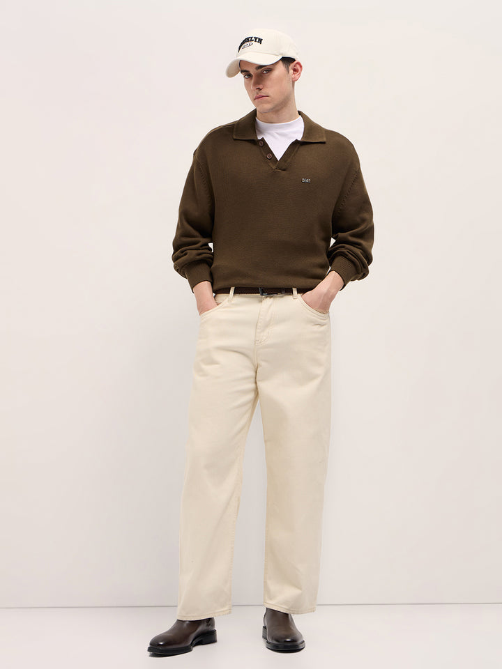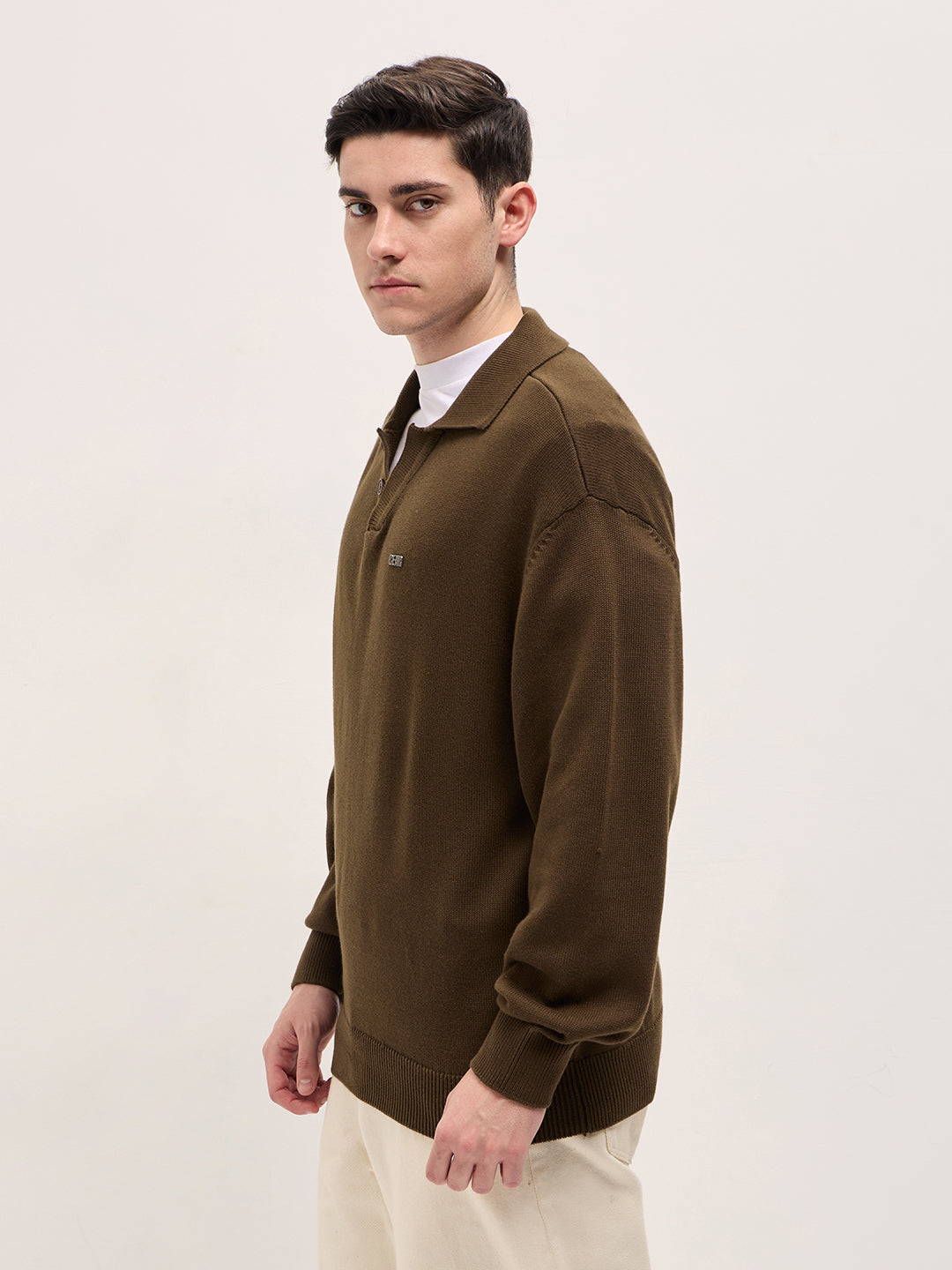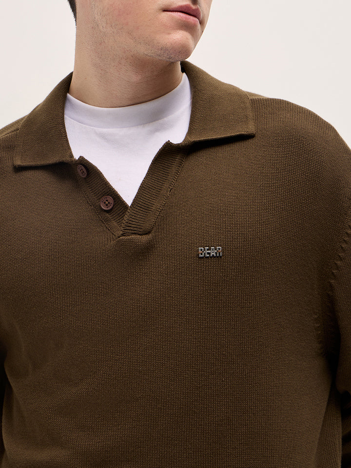 Brown Textured Knit Relaxed Fit Polo with a Stylish Open Placket