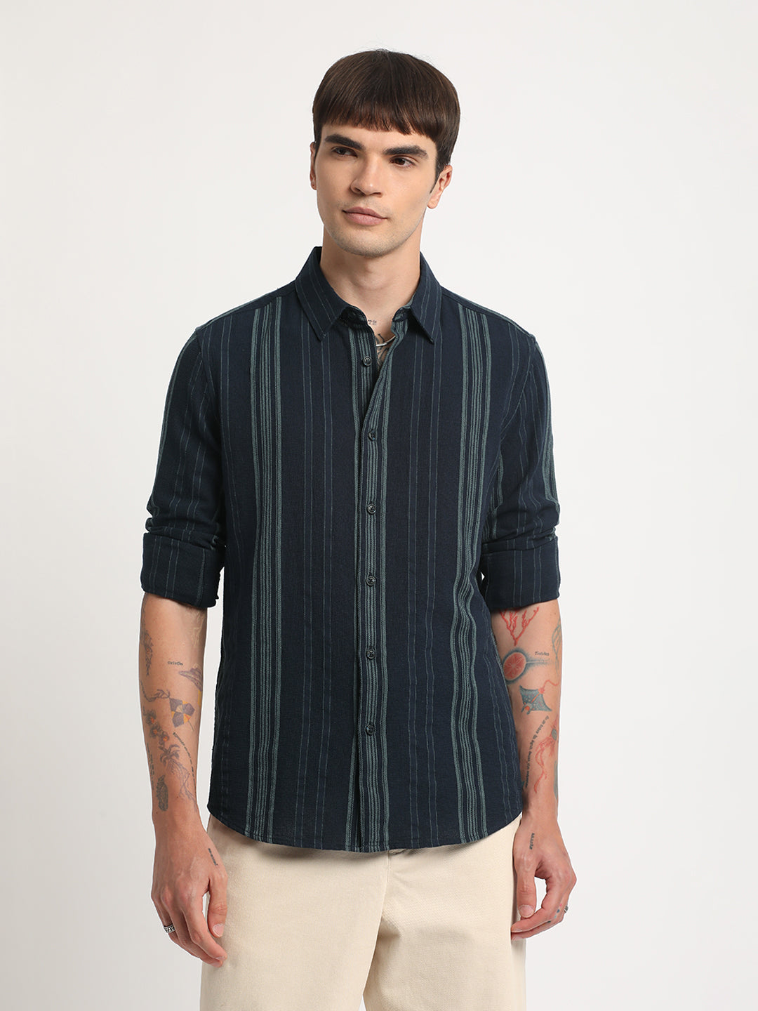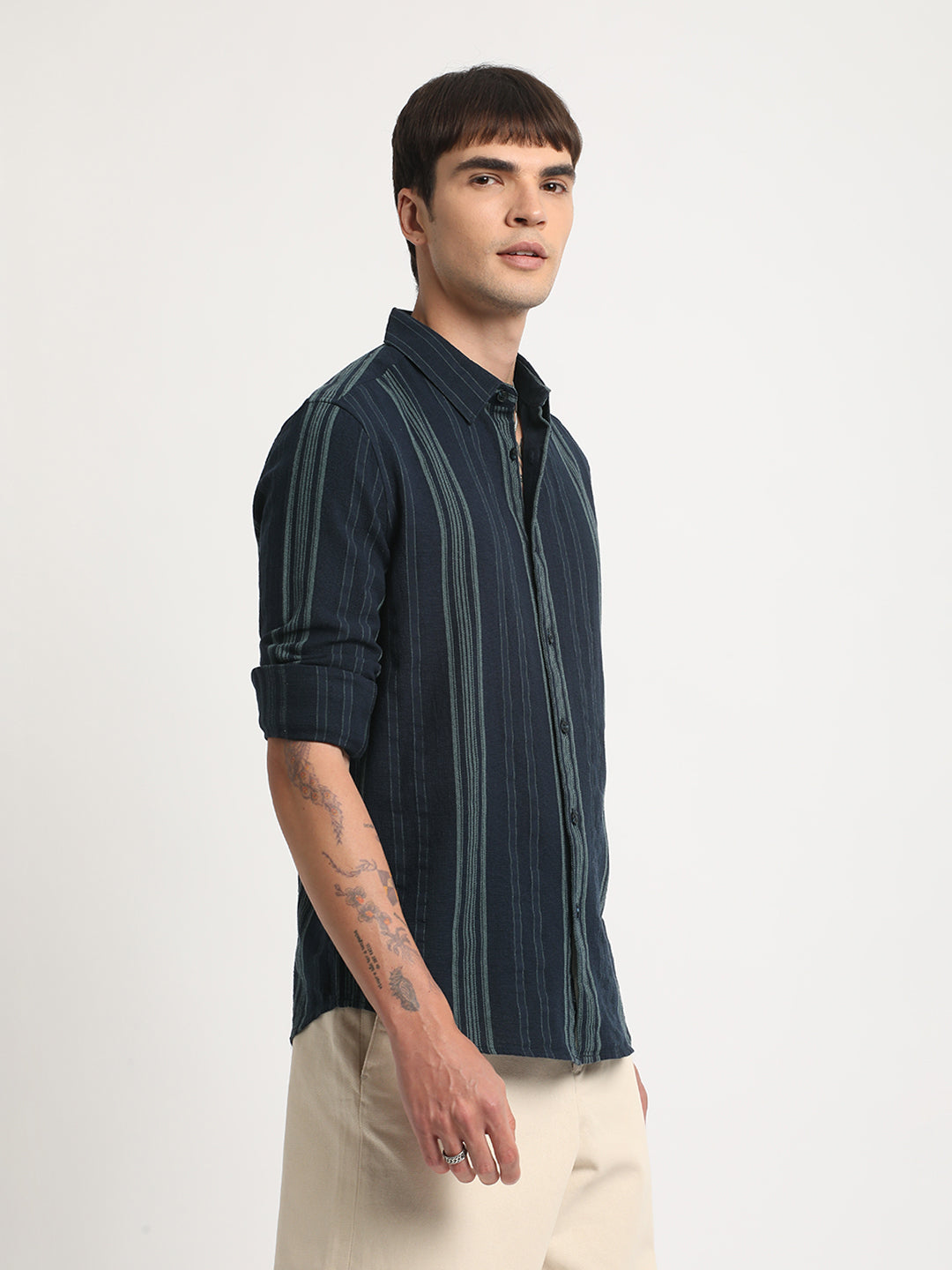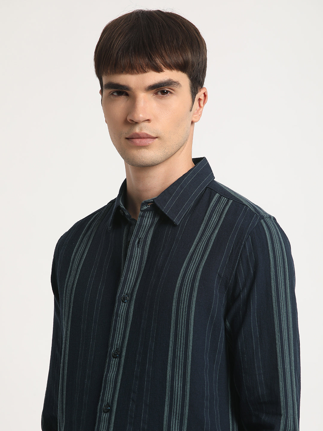 Men Blue Vertical Striped Fit Cotton Casual Shirt