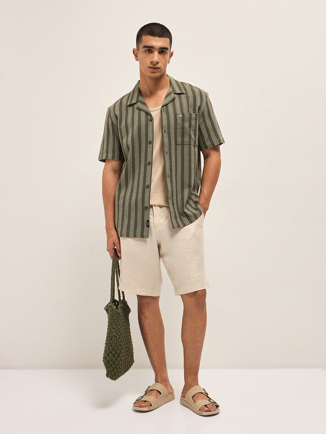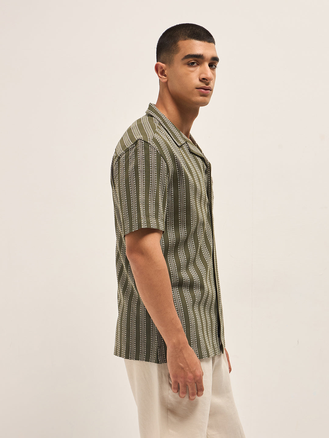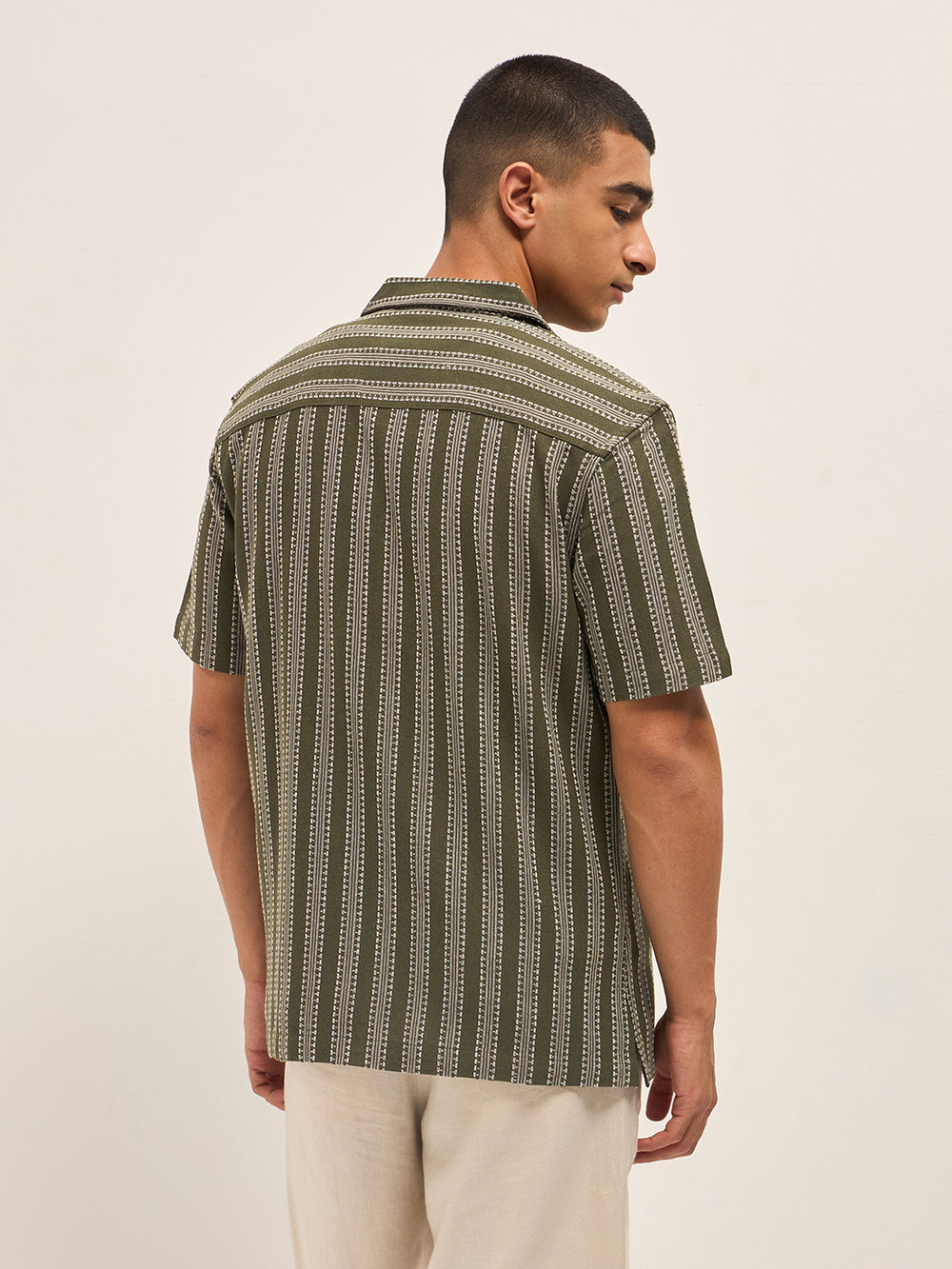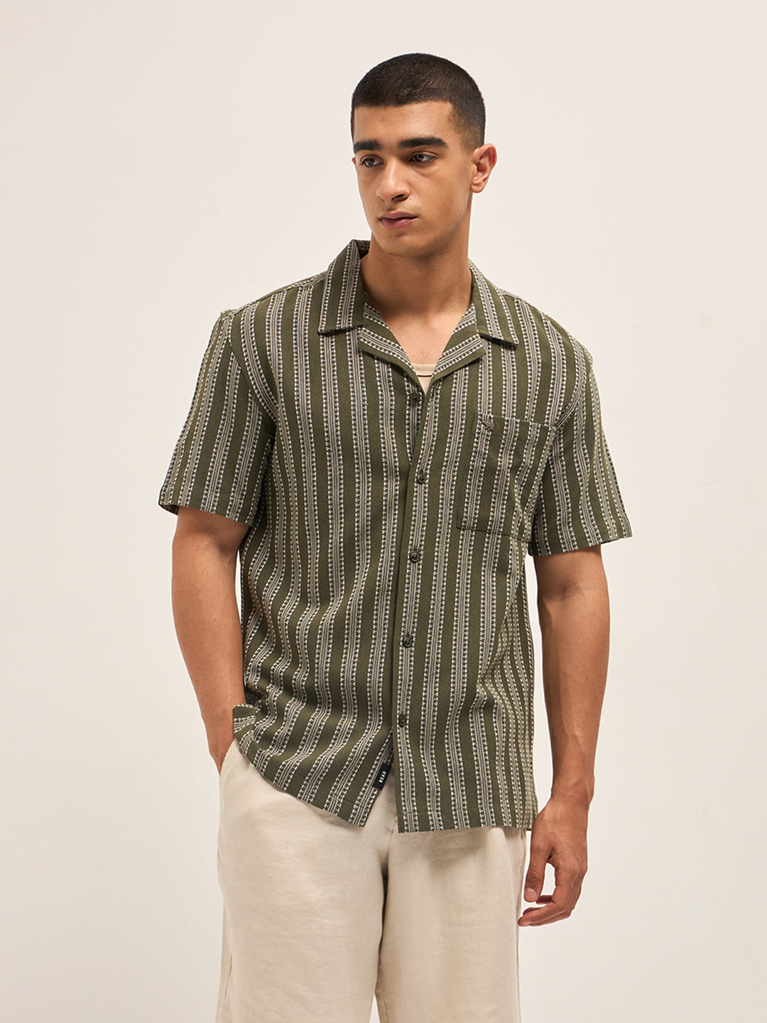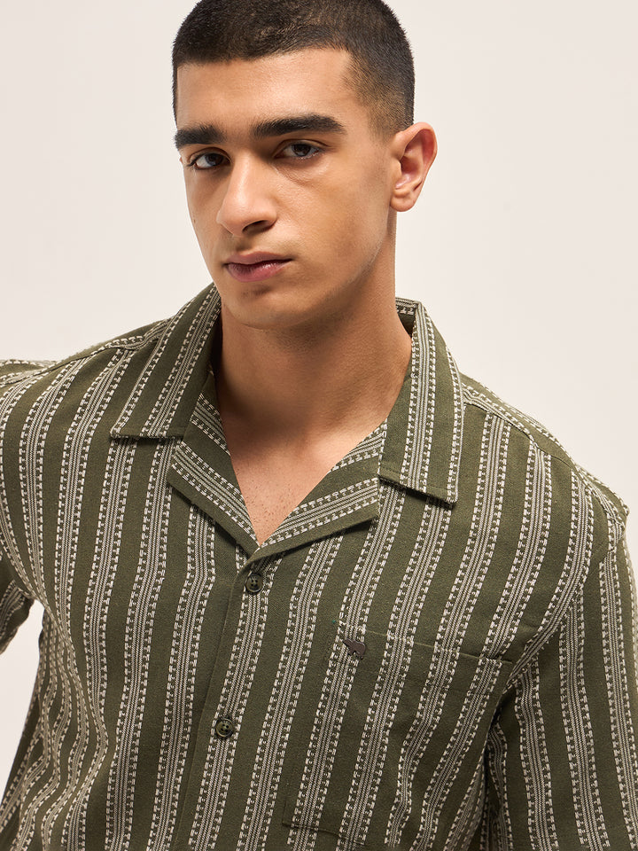 Olive Woven Stripes Regular Fit Casual Shirt with a Cuban Collar
