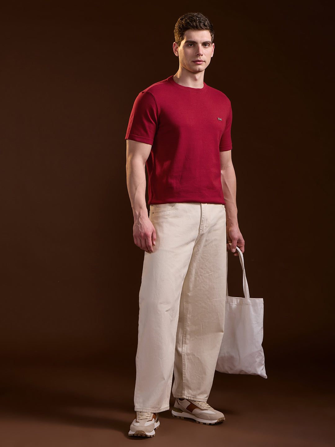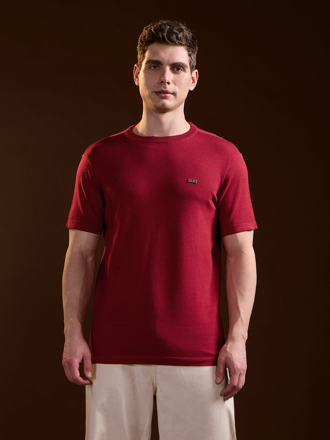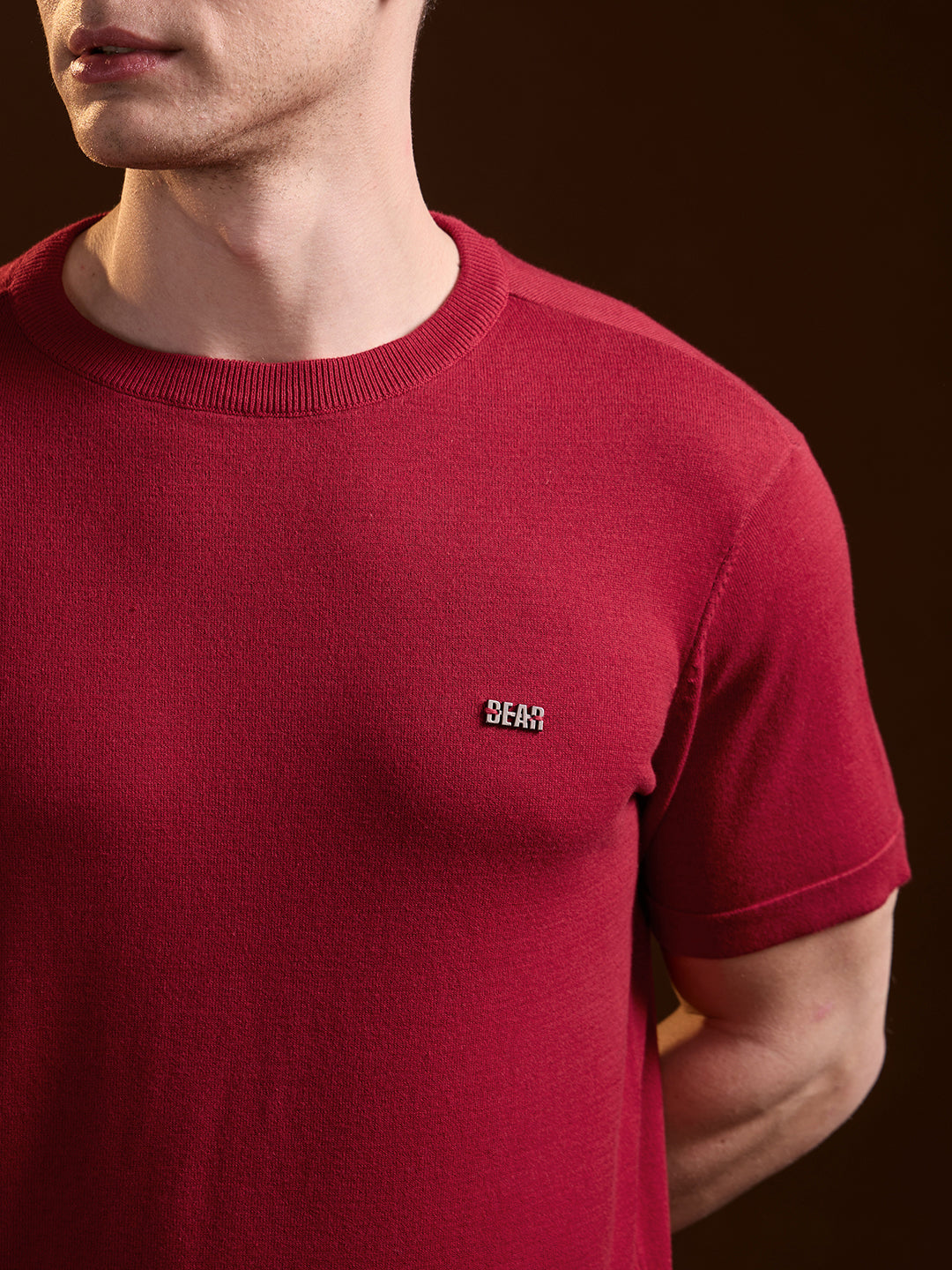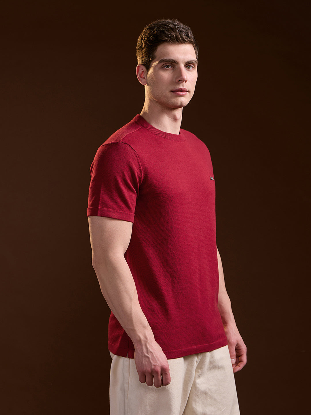 Red Solid Regular Fit Ribbed Crew Neck T-shirt