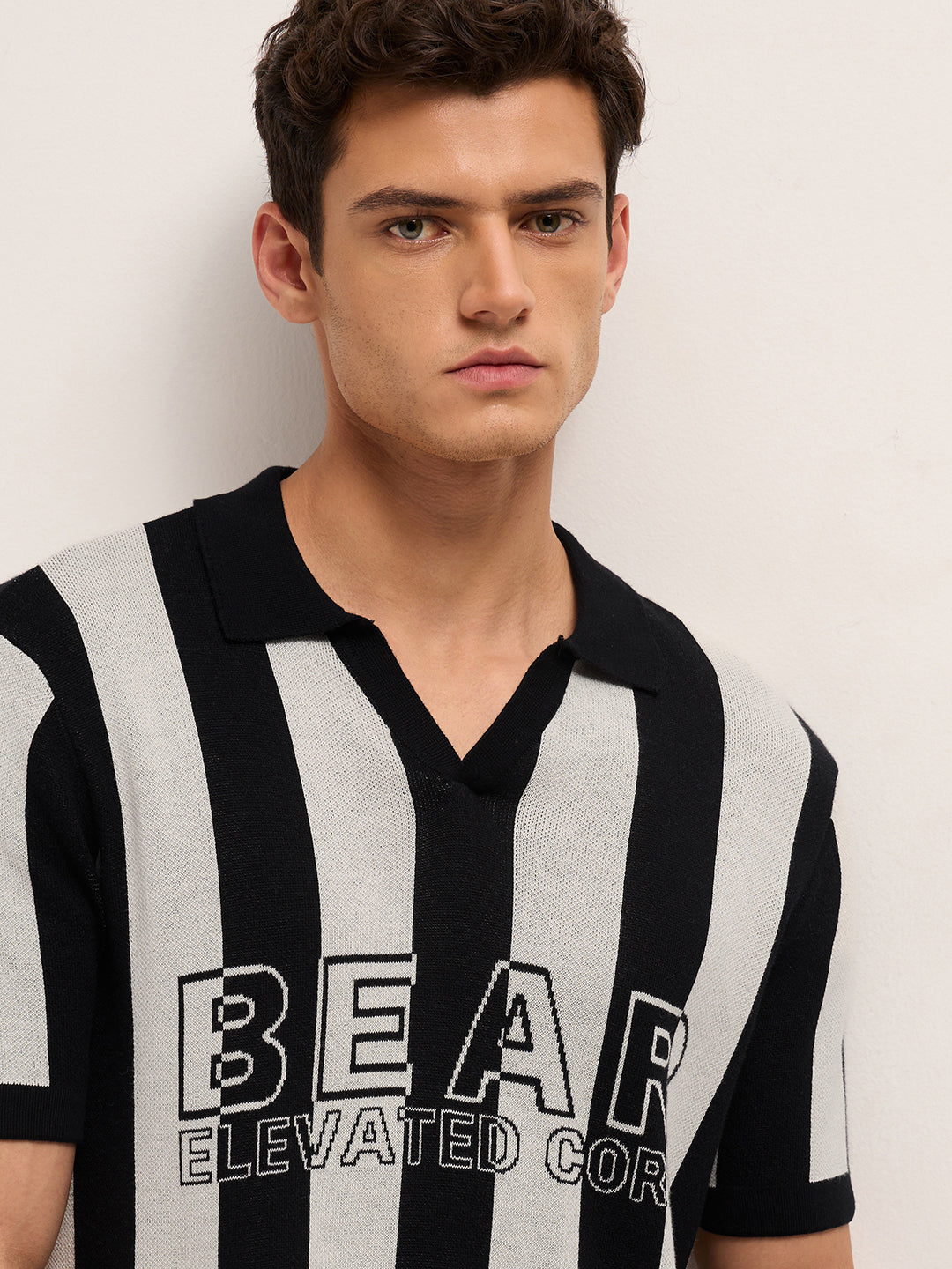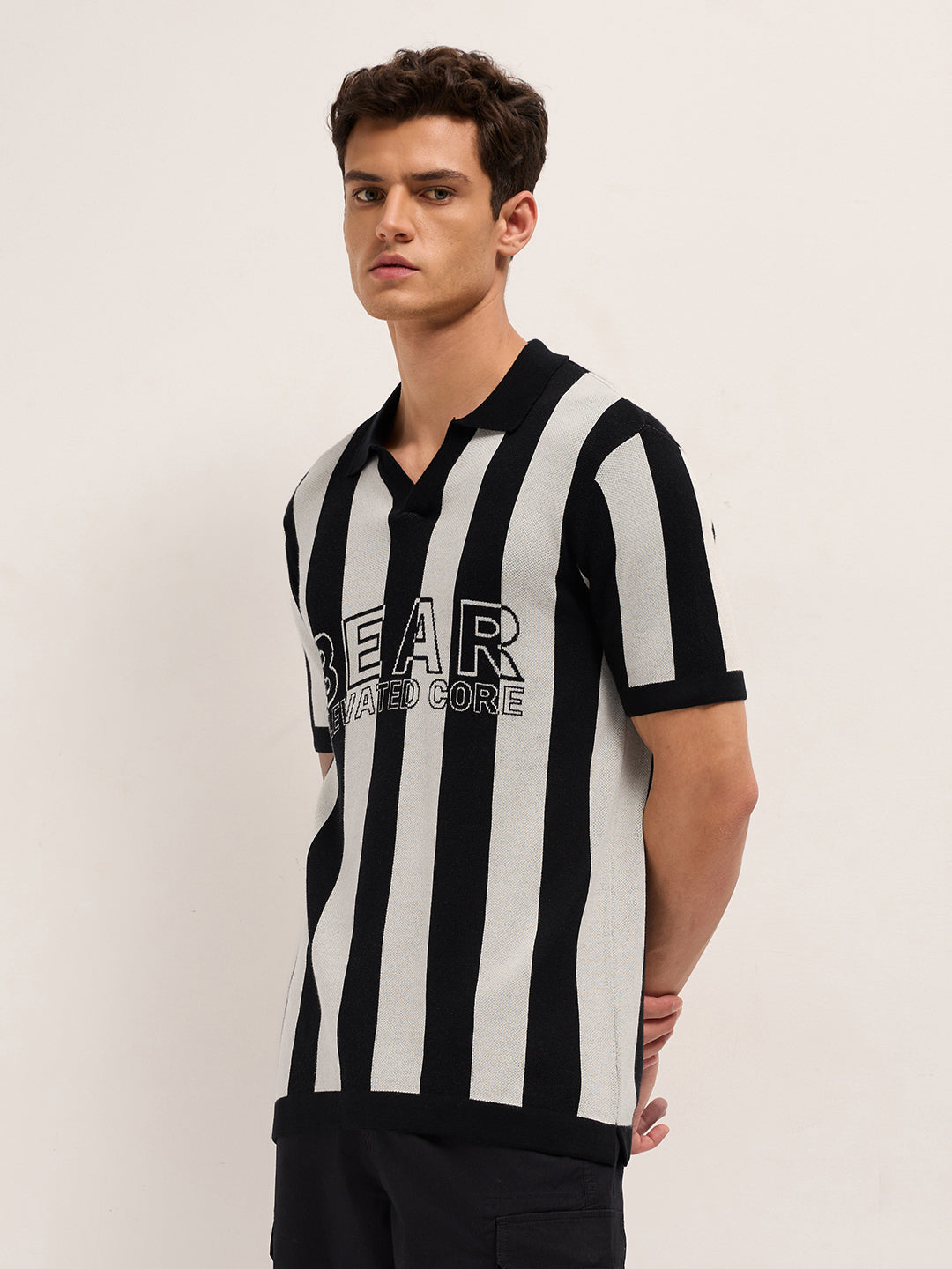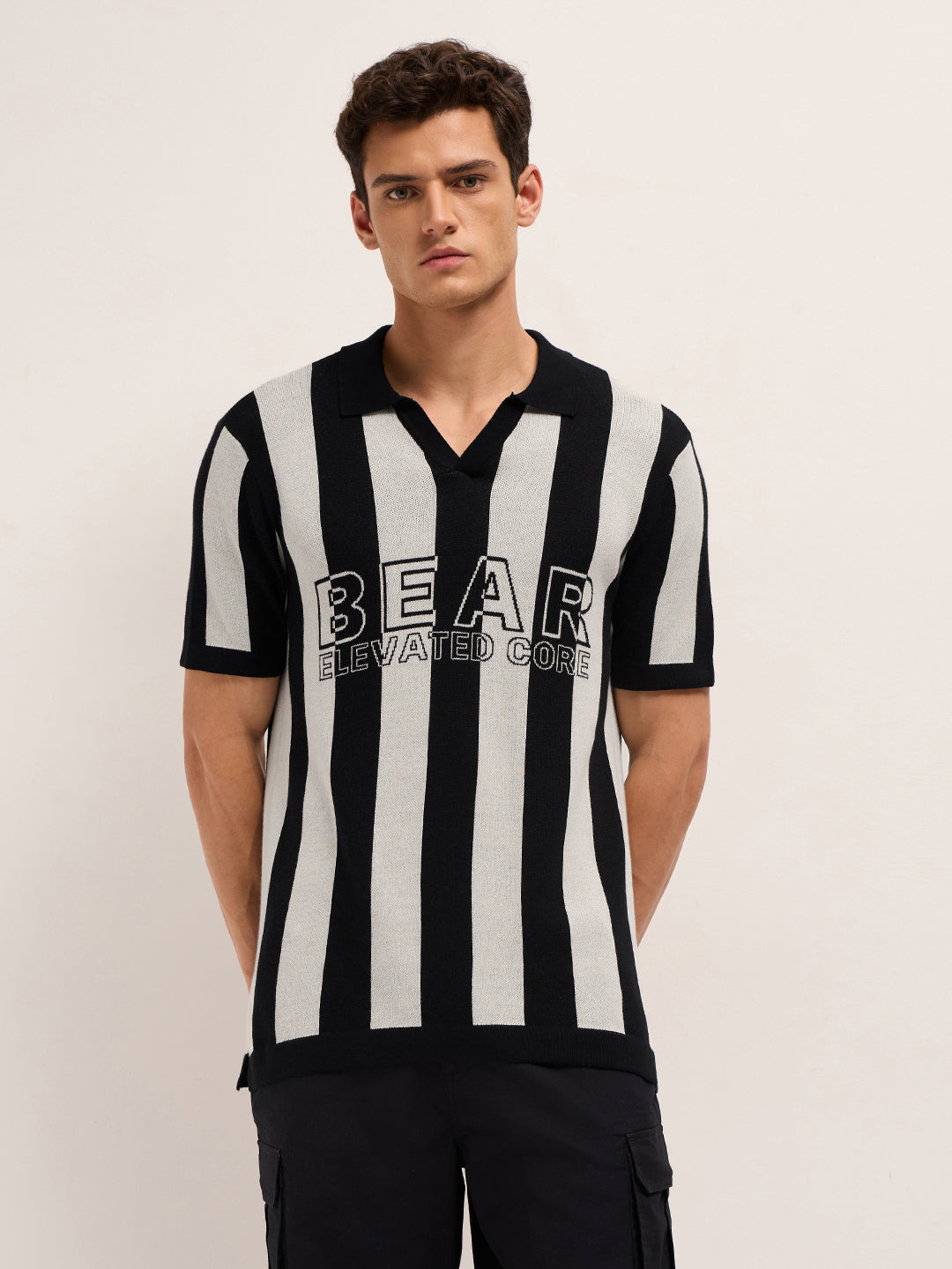 Black & Cream Stripe Knit Regular Fit Polo with V-Neck Placket & Chest Embroidery