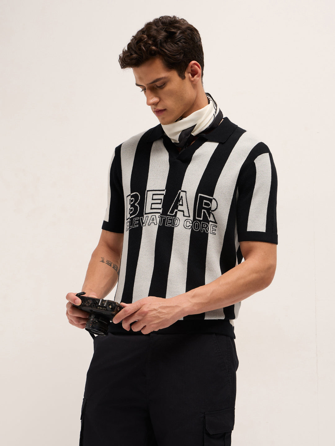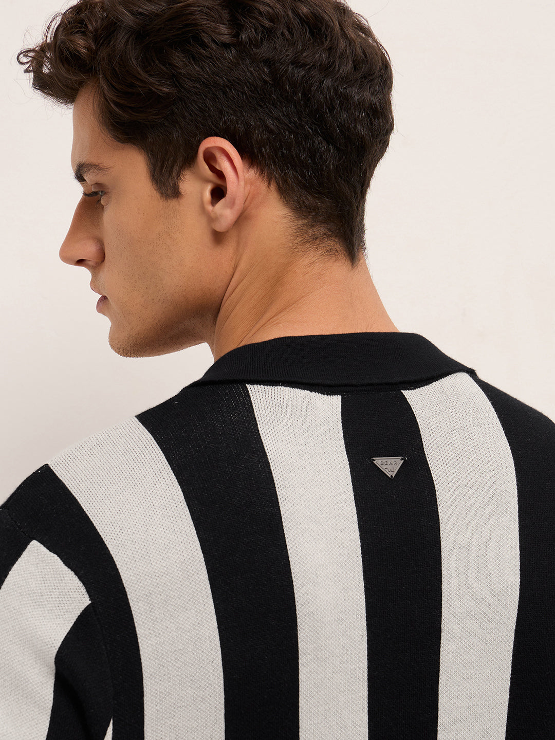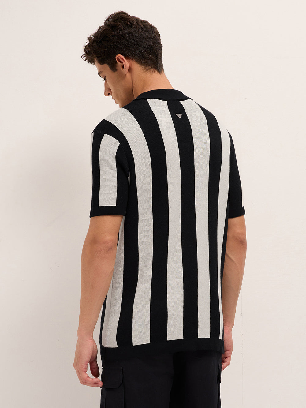 Black & Cream Stripe Knit Regular Fit Polo with V-Neck Placket & Chest Embroidery