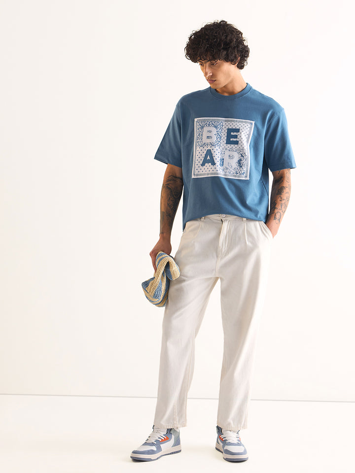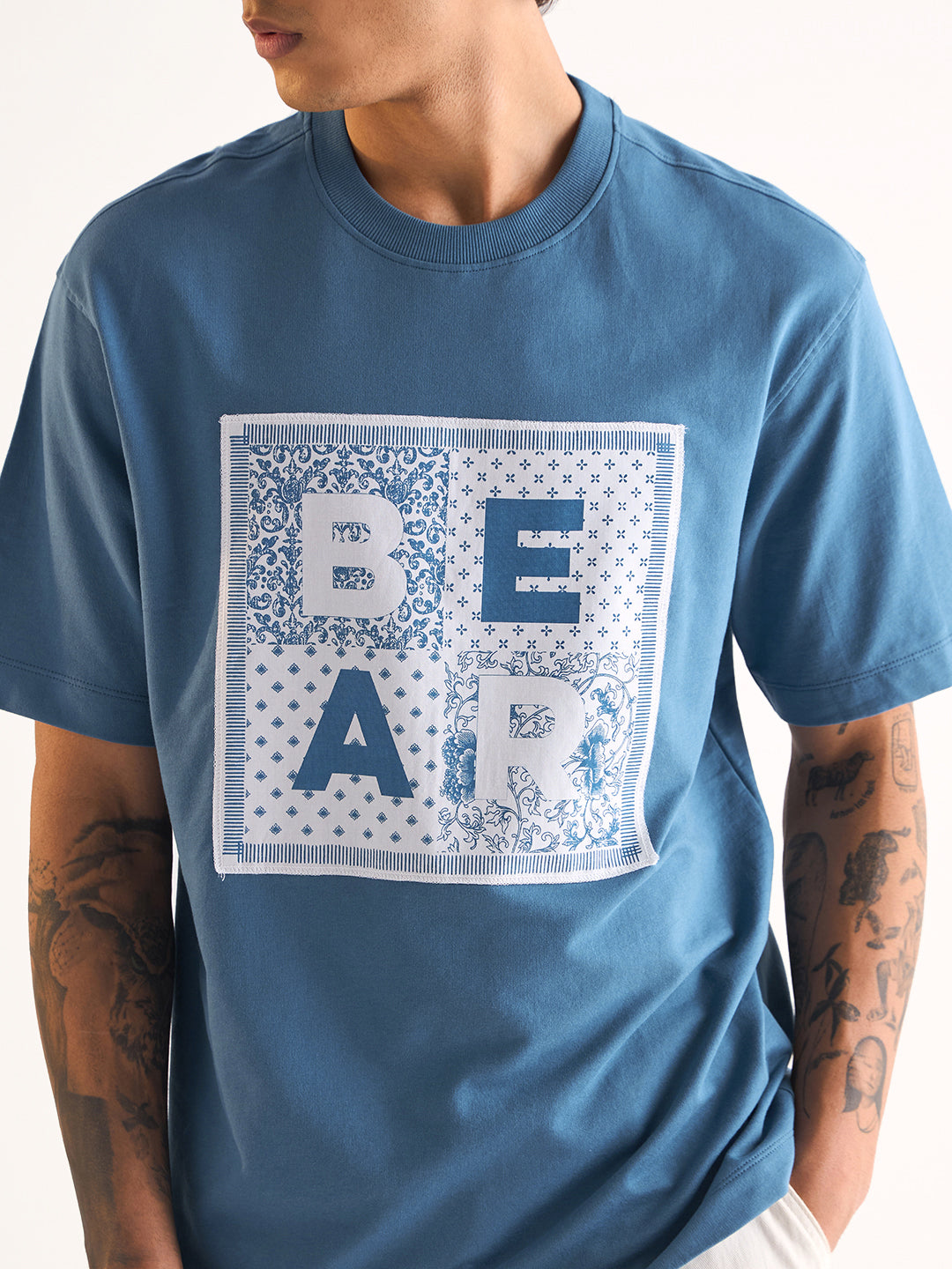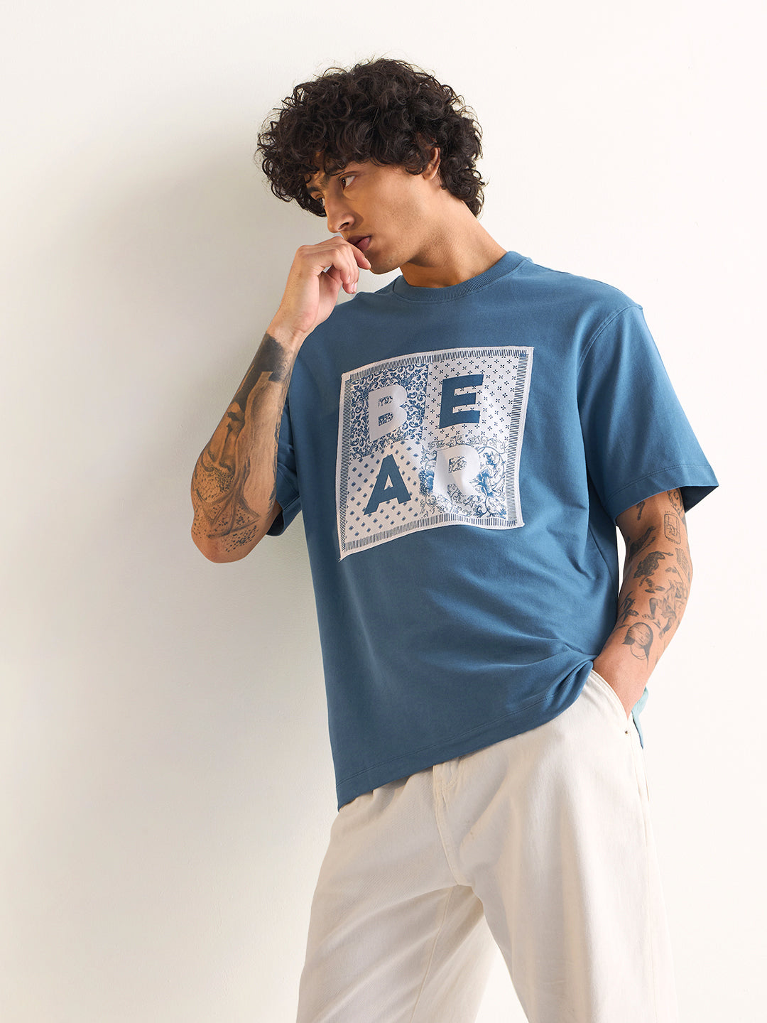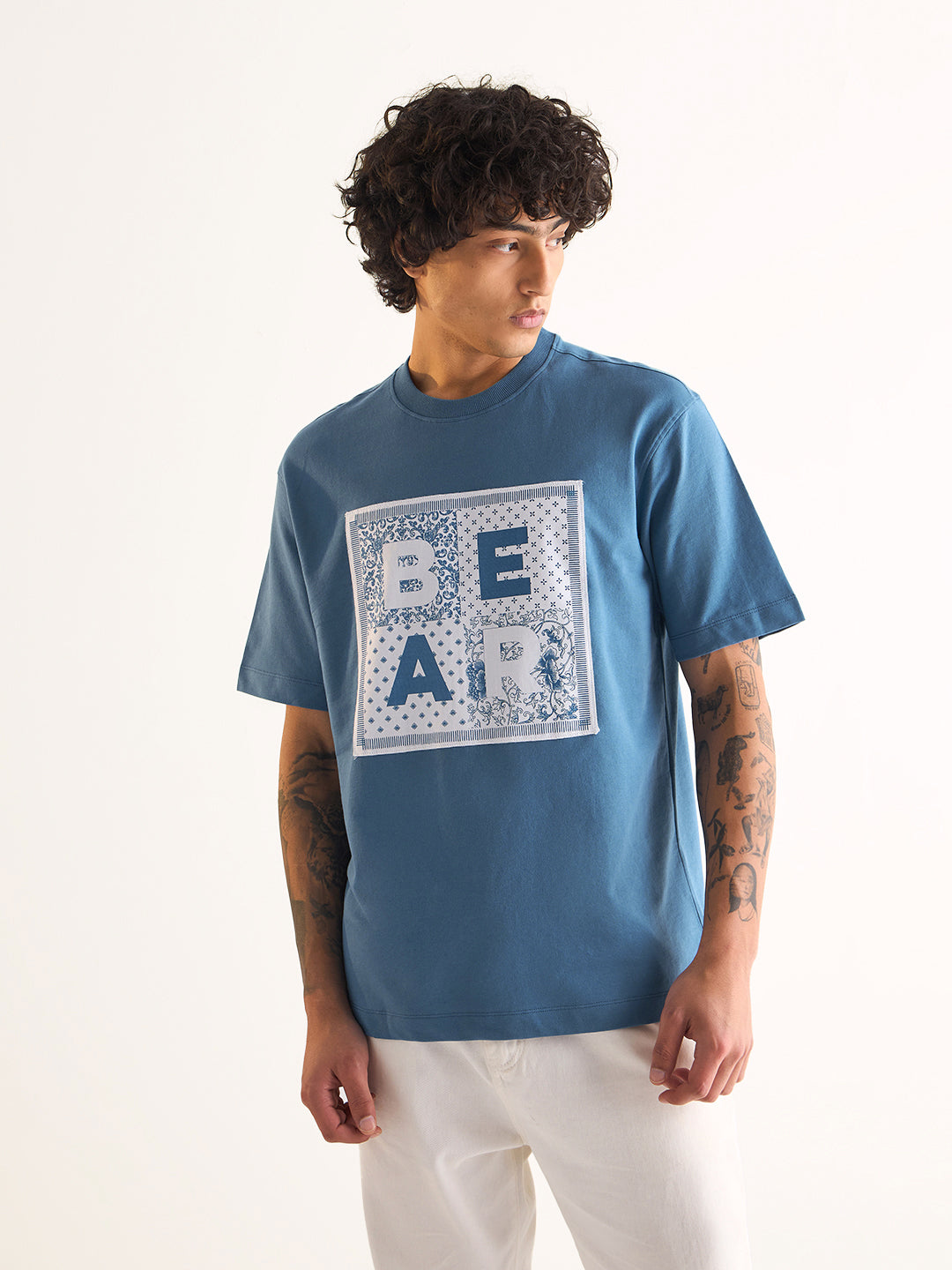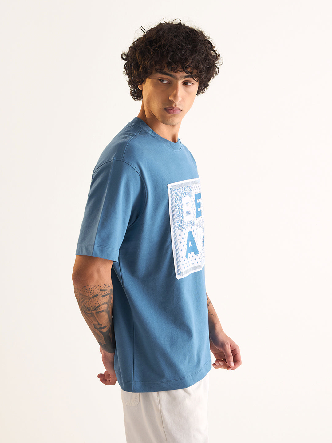 Blue Oversize Patchwork Graphic Print Crew Neck T-shirt