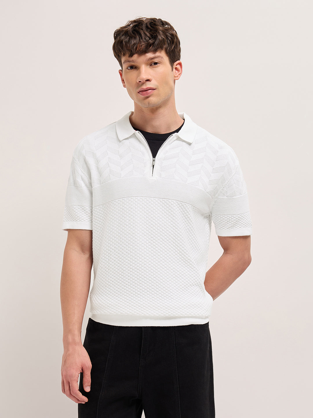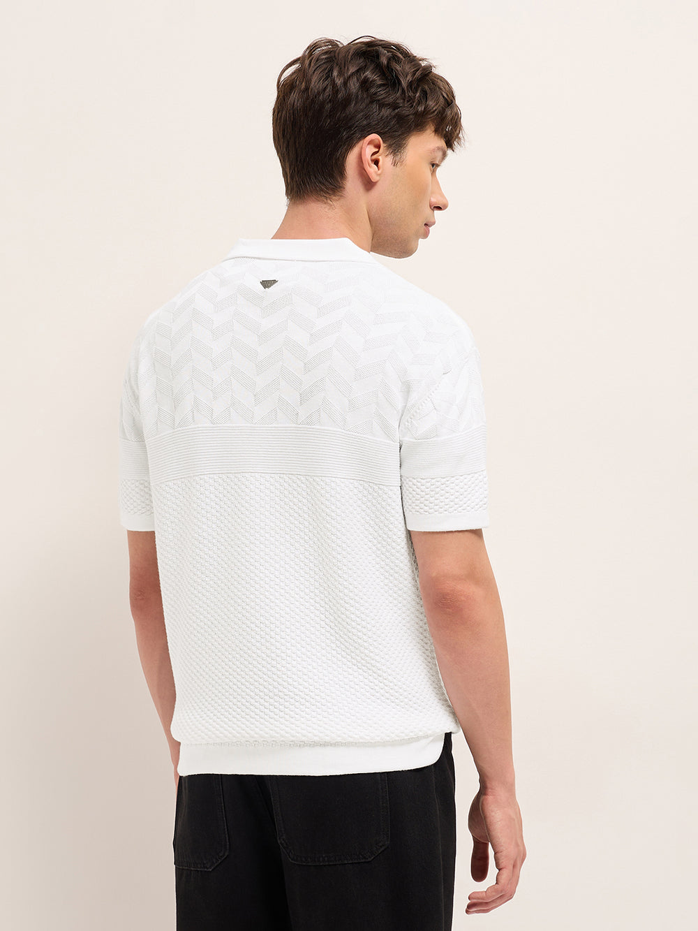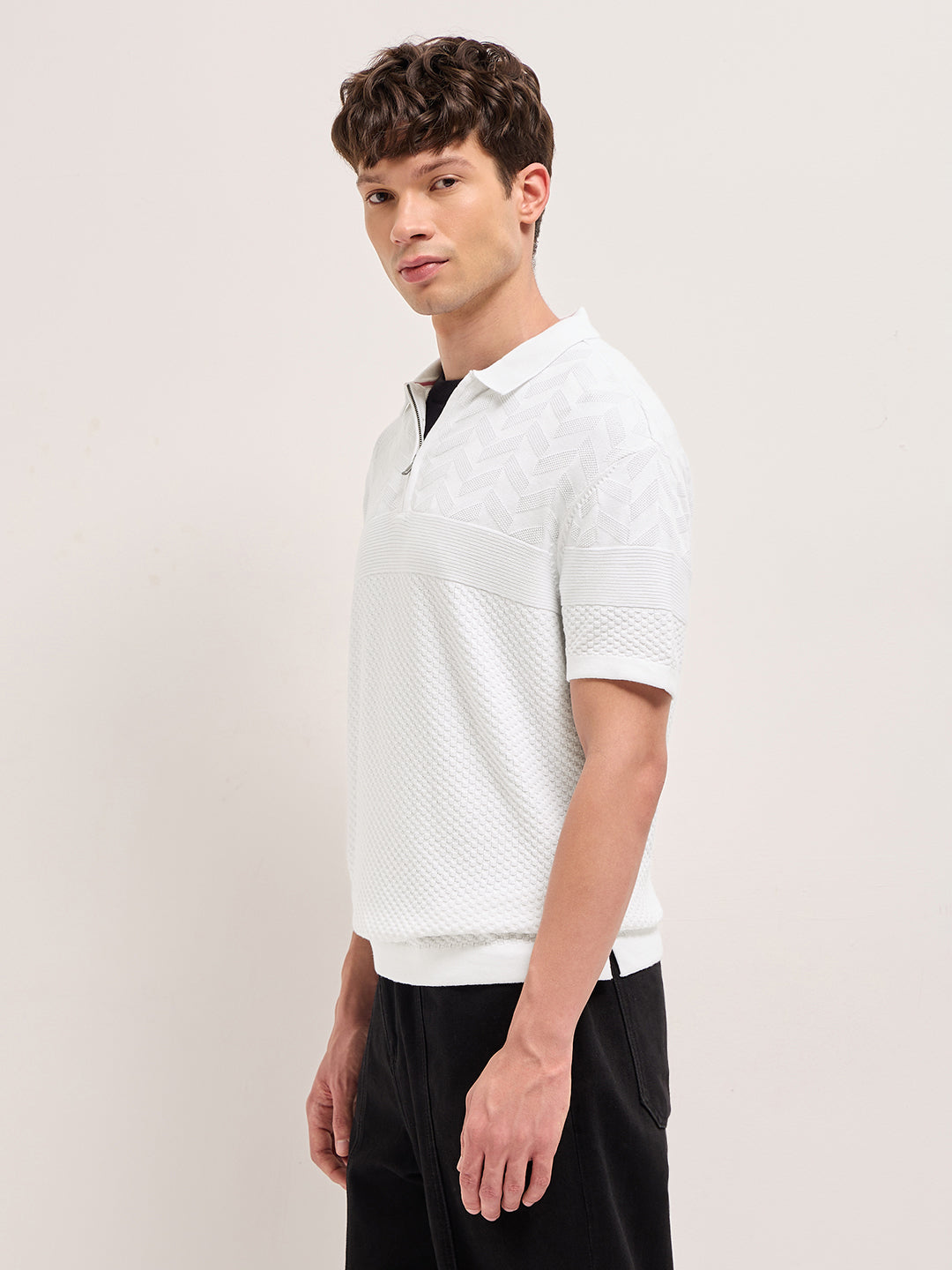 White Relaxed Fit Chevron Textured Flat Knit Polo
