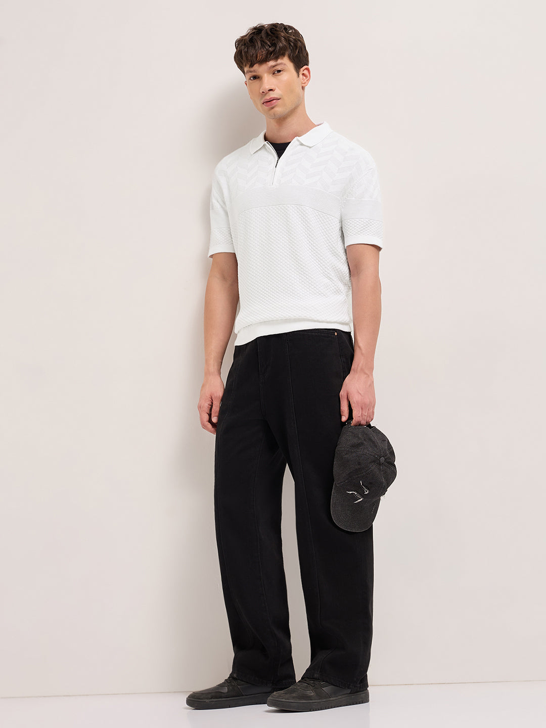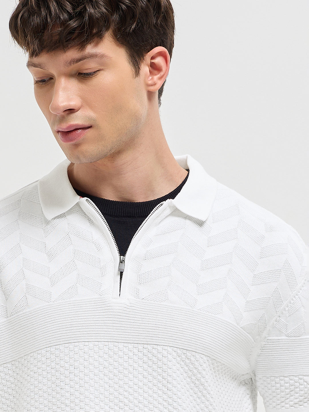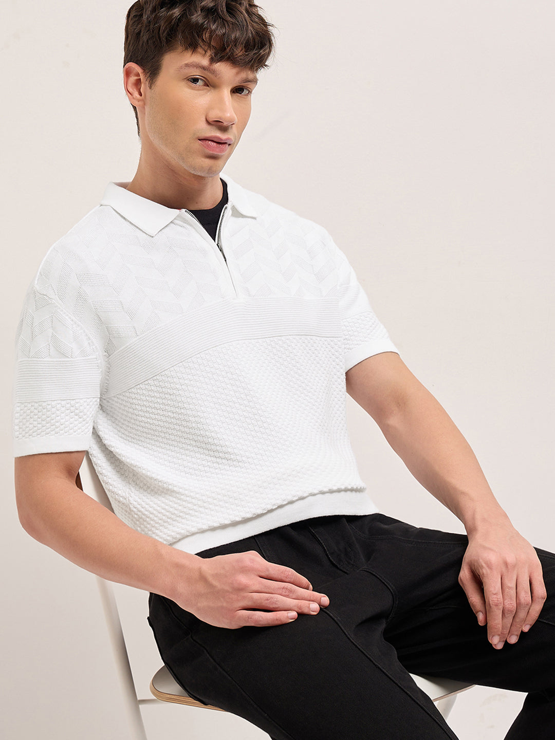 White Relaxed Fit Chevron Textured Flat Knit Polo