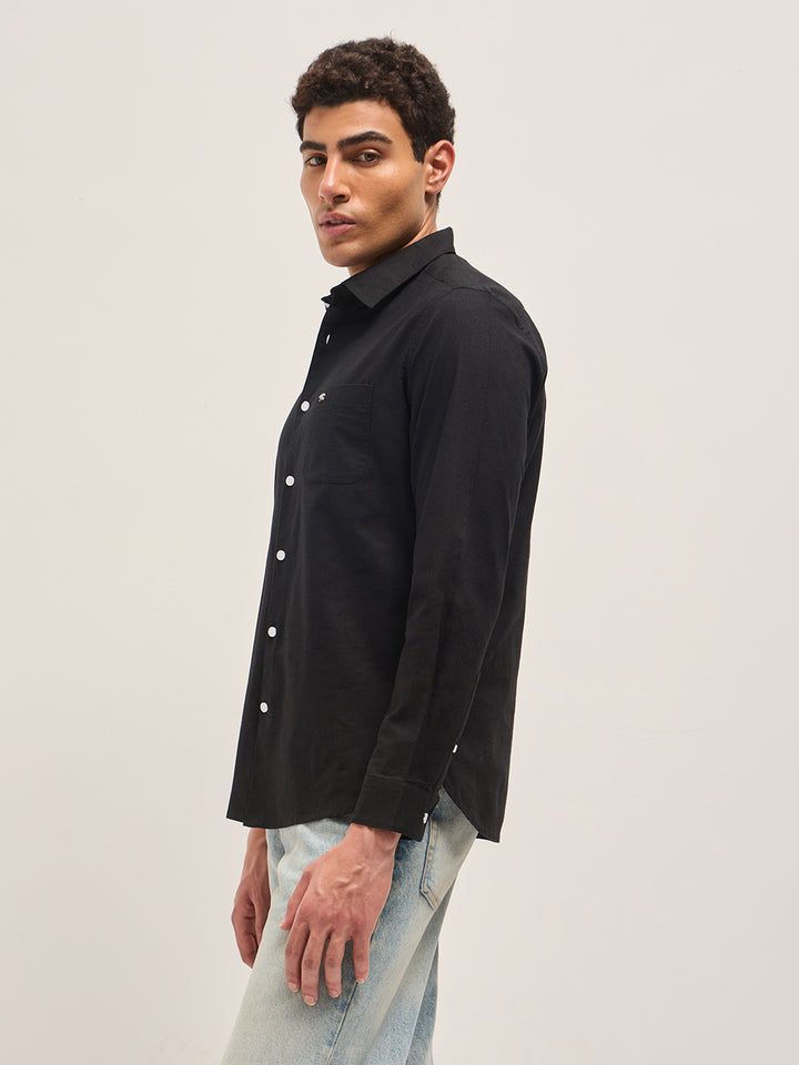 Black Cotton Linen Slim Fit Solid Casual Shirt