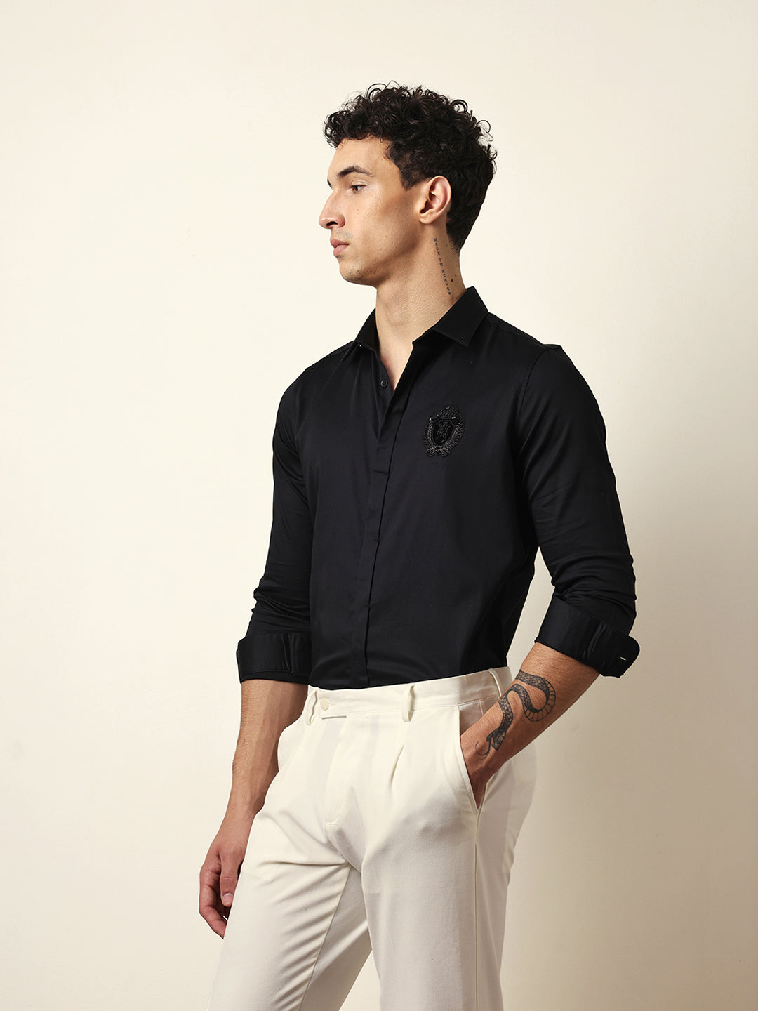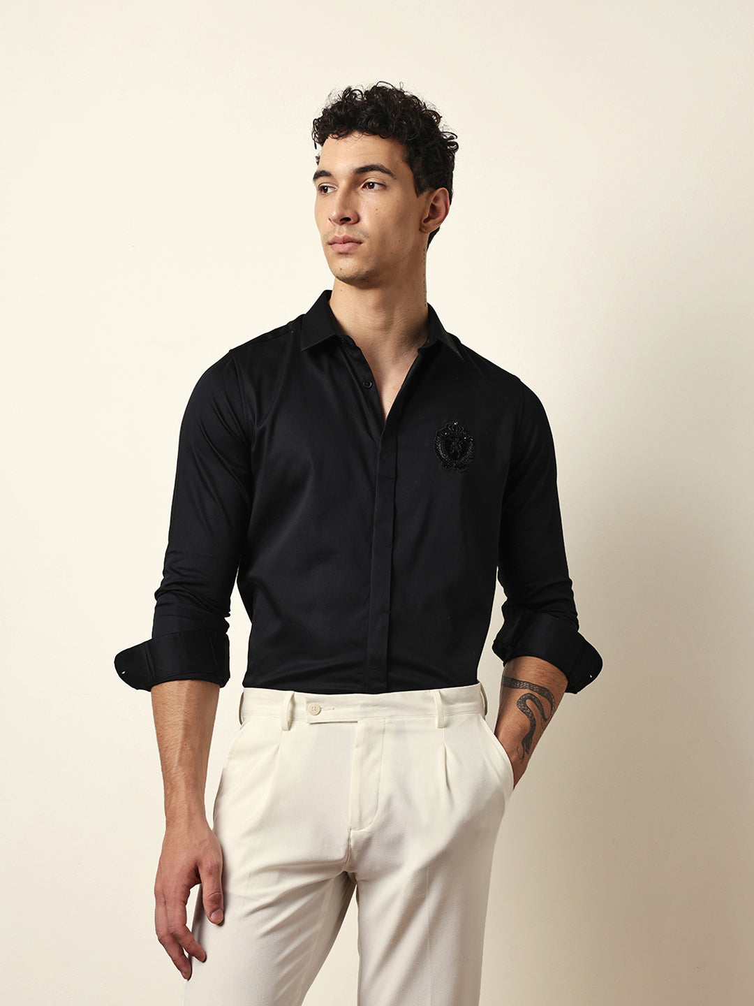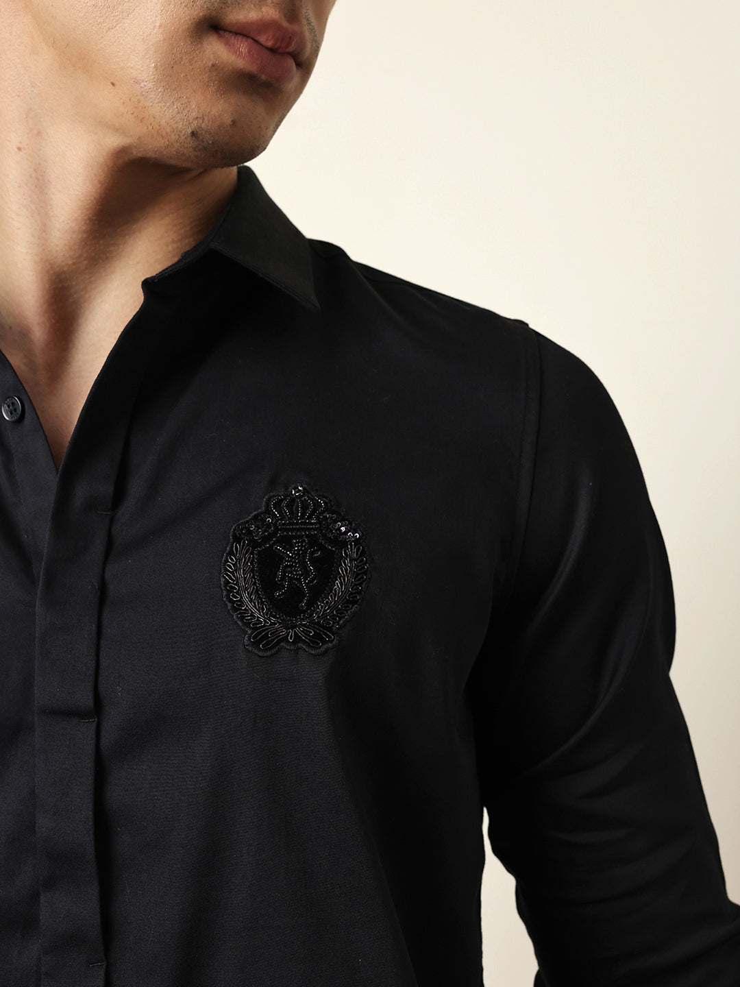 Black Tailored Fit Formal Party Shirt with Elegant Crest Embroidery