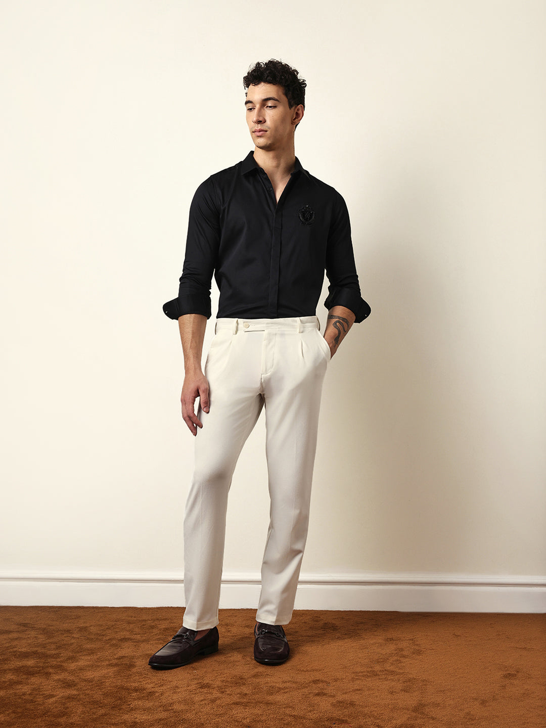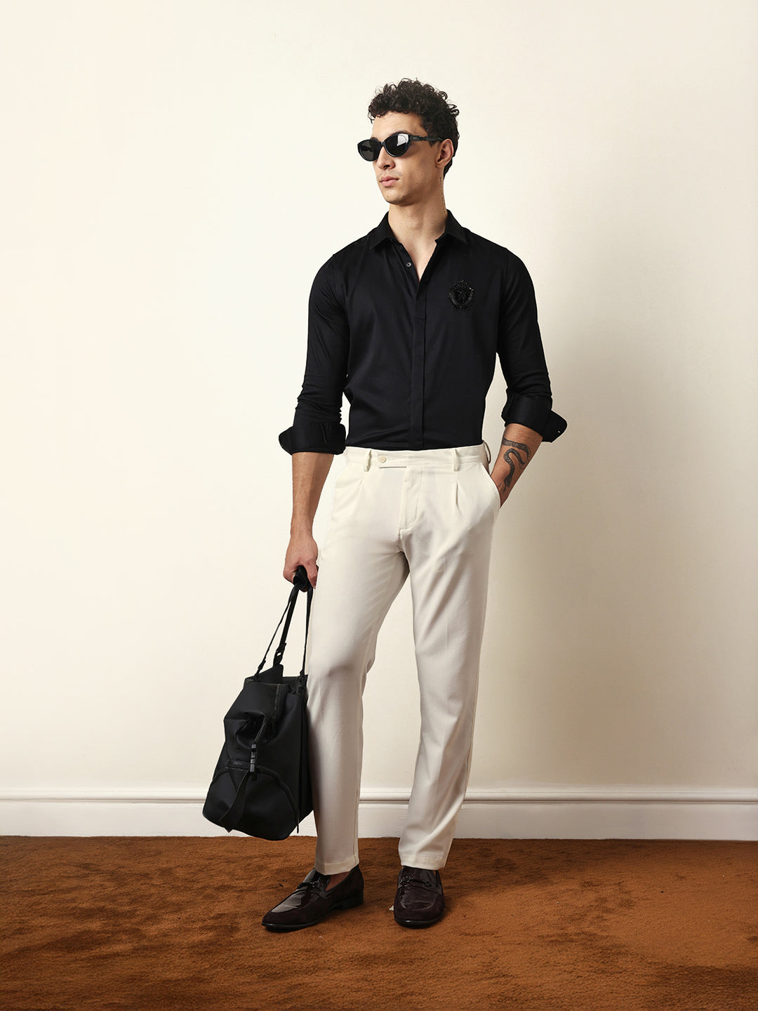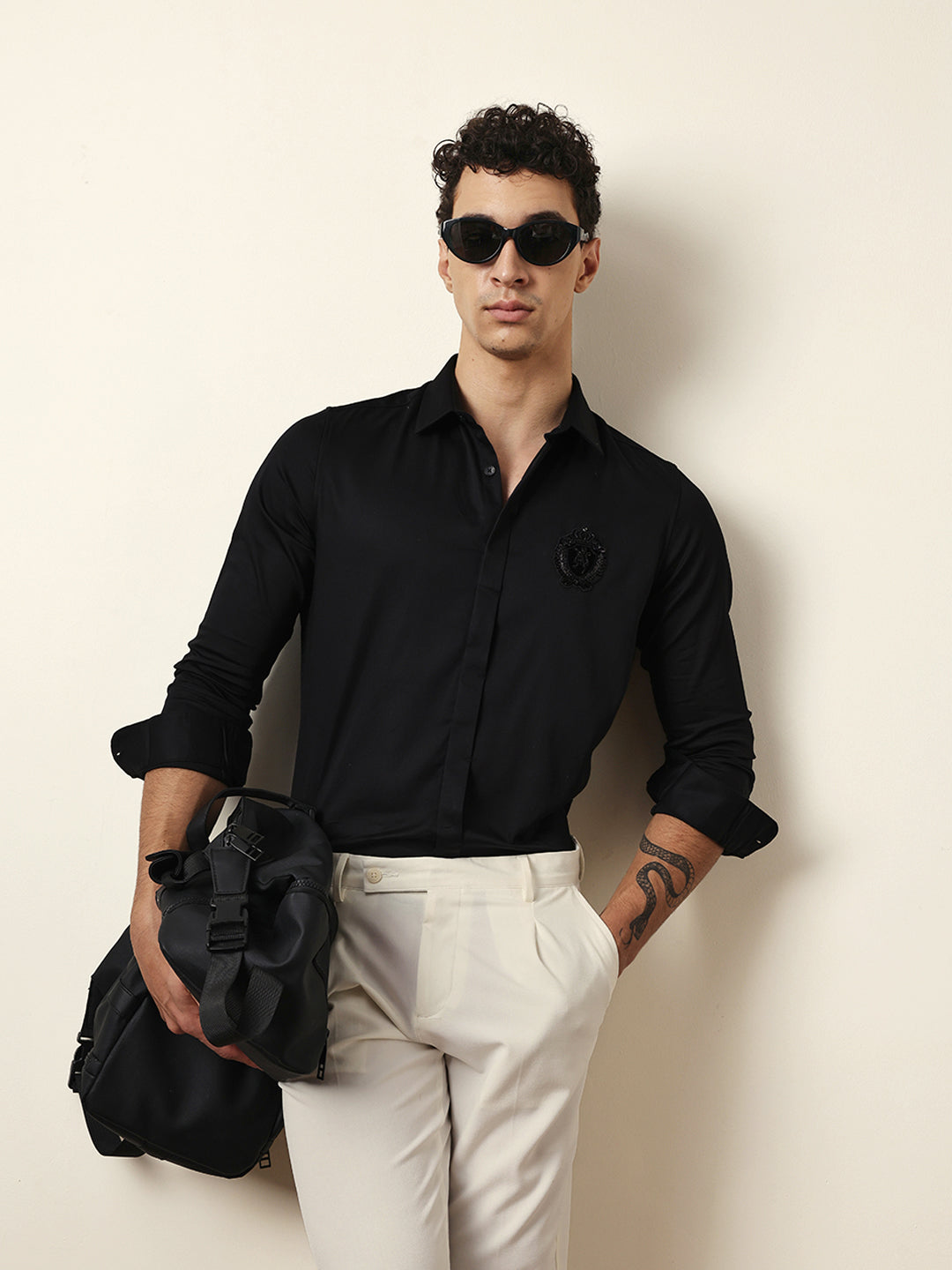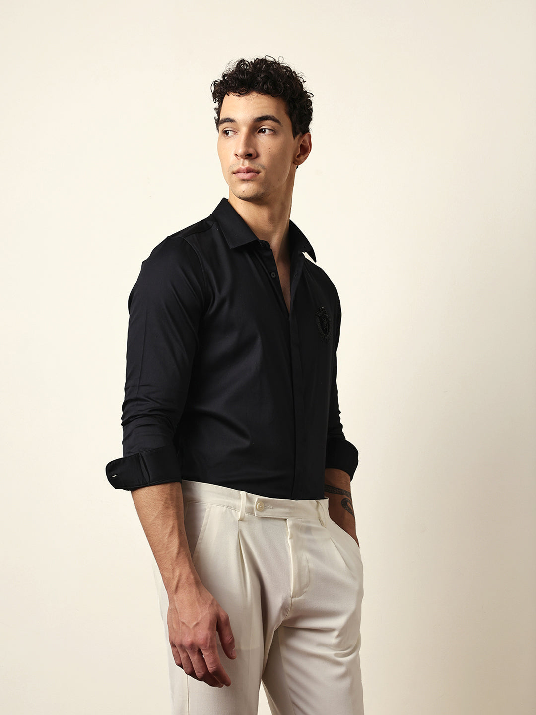 Black Tailored Fit Formal Party Shirt with Elegant Crest Embroidery