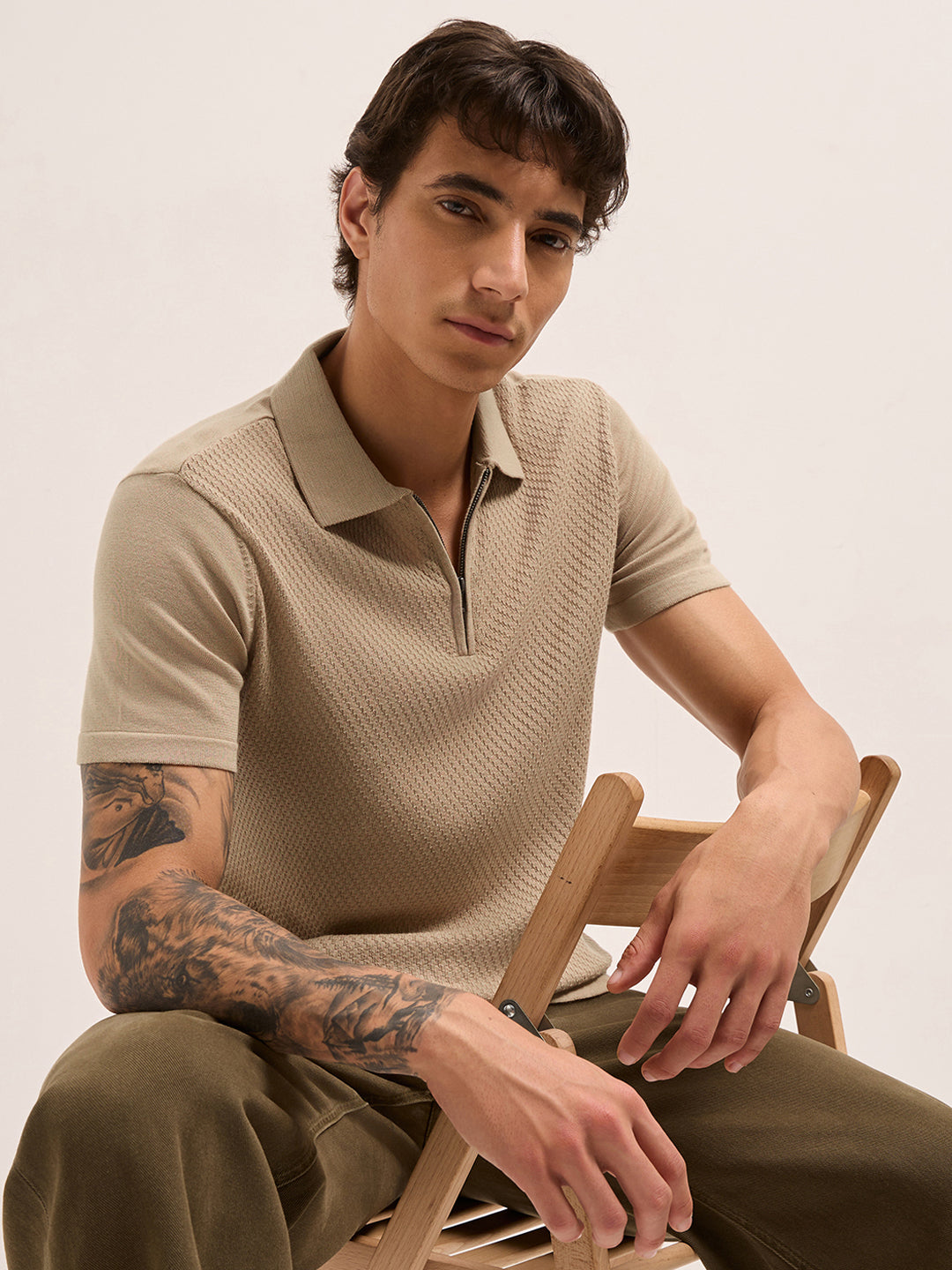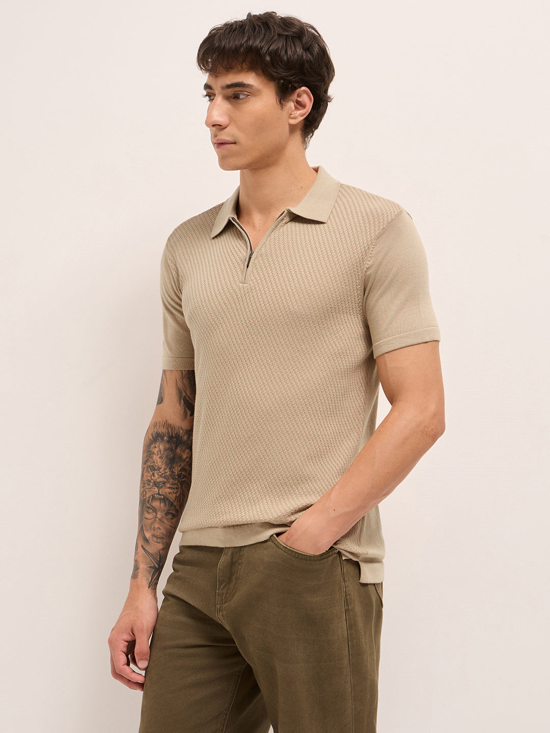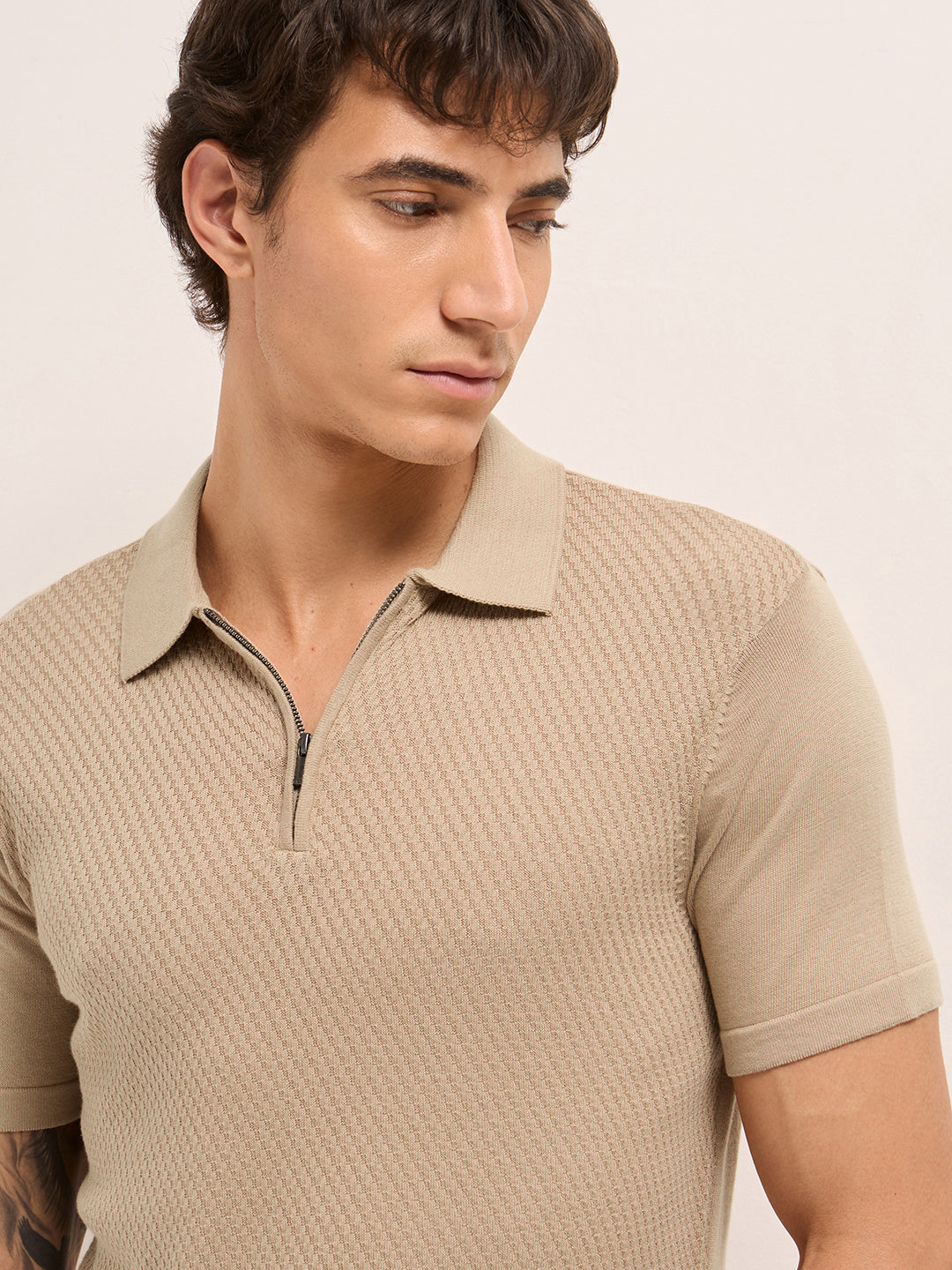 Beige Regular Fit Textured Knit Half-Zip Polo