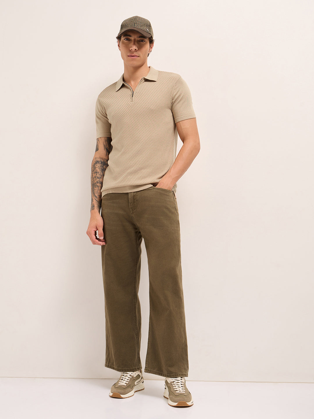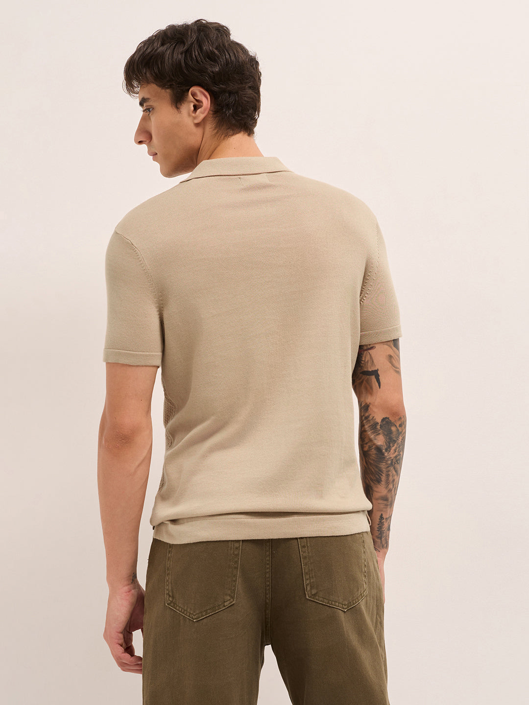 Shop Beige Regular Fit Textured Knit Half-Zip Polo Online.