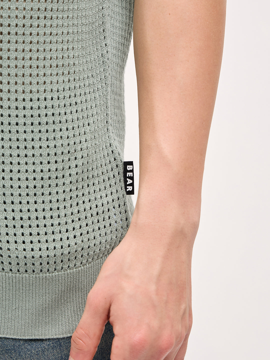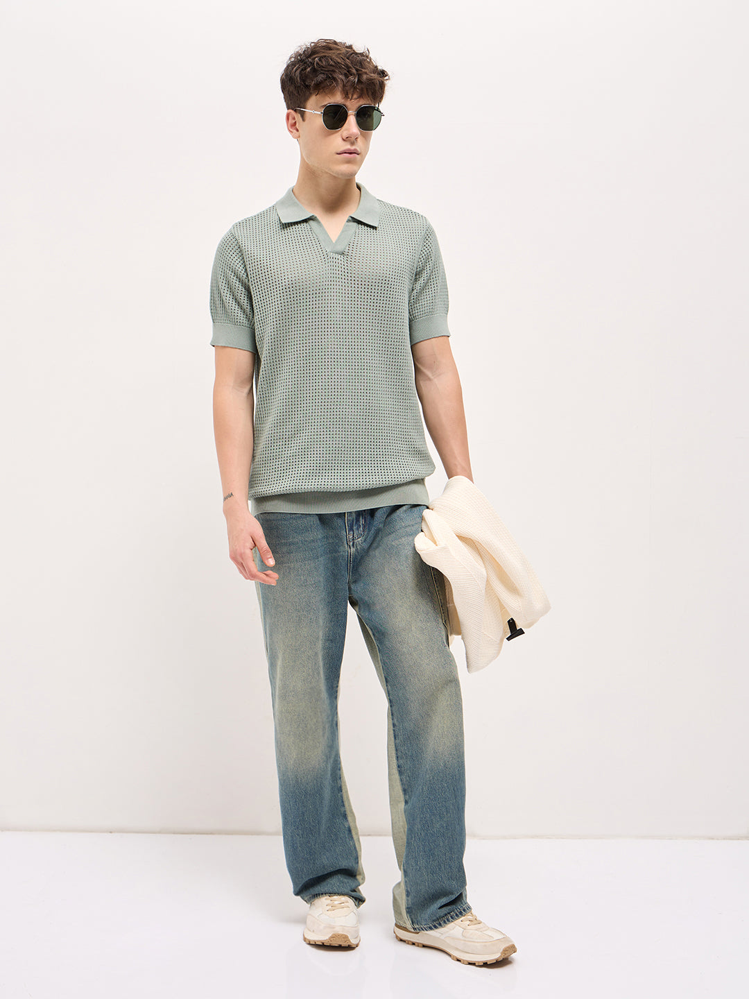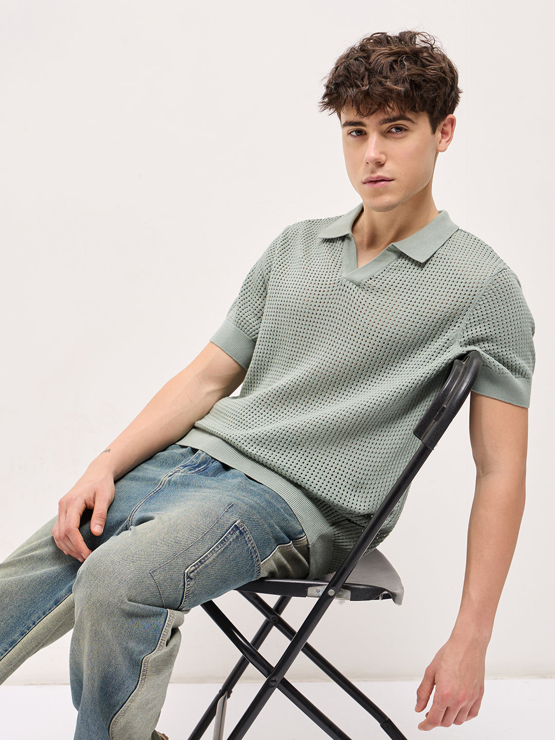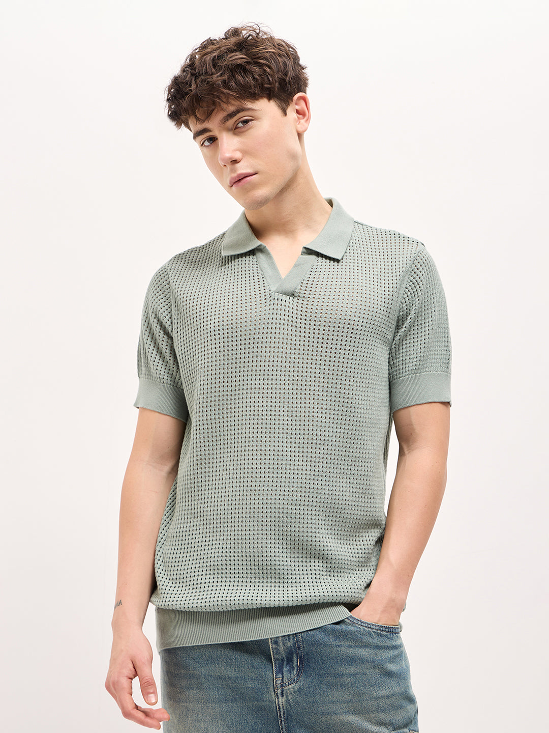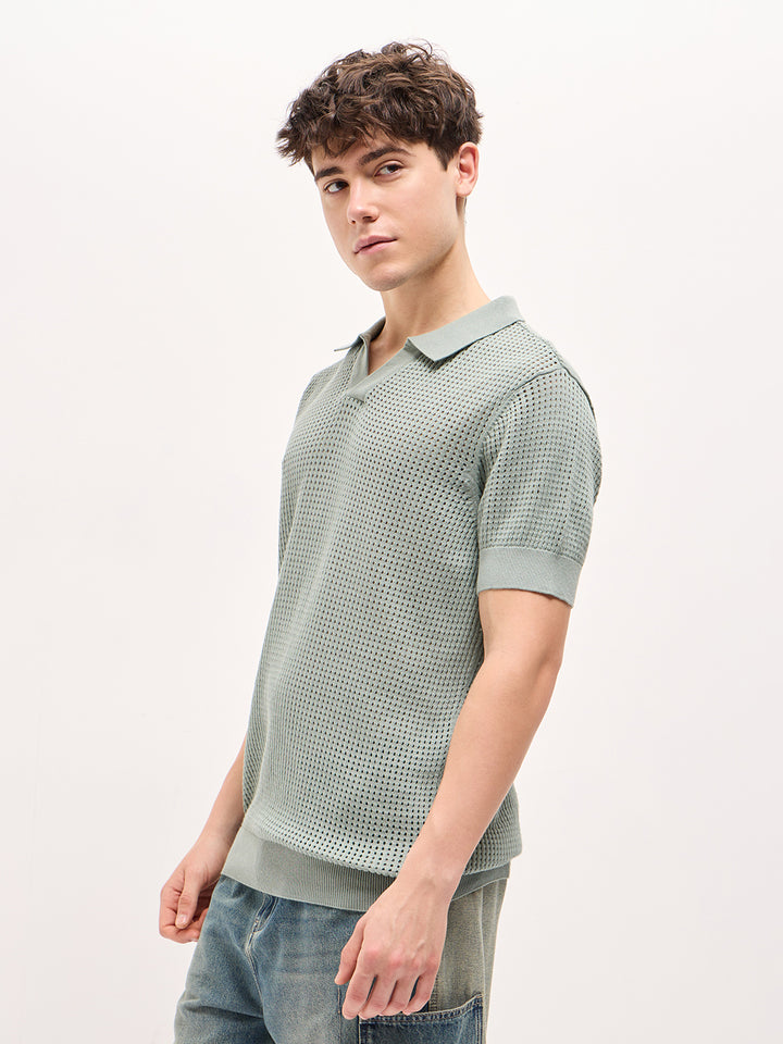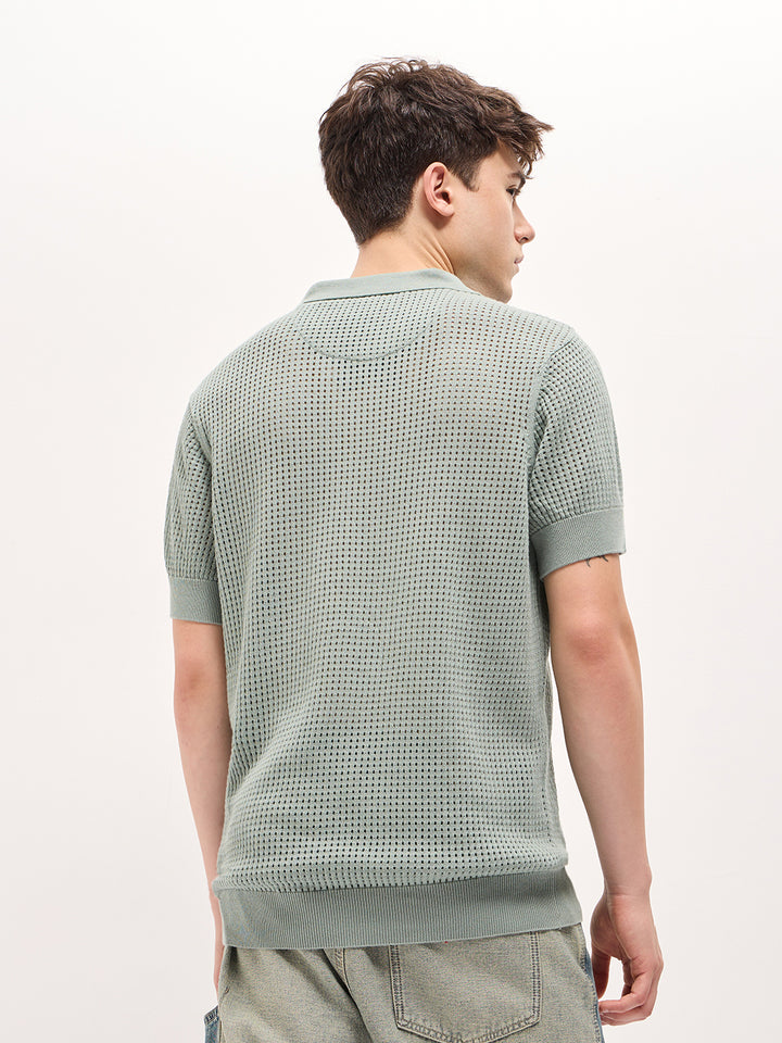 Sage Green Textured Knit Regular Fit Polo T-shirt