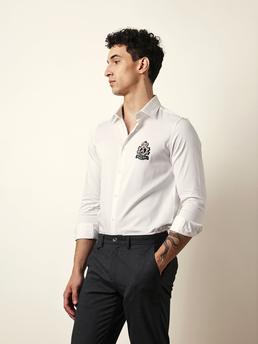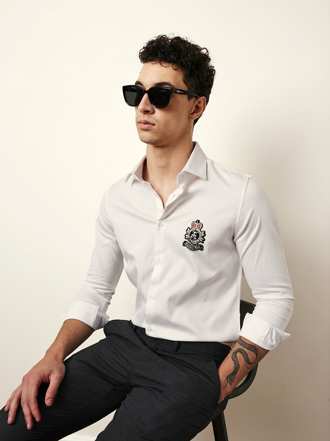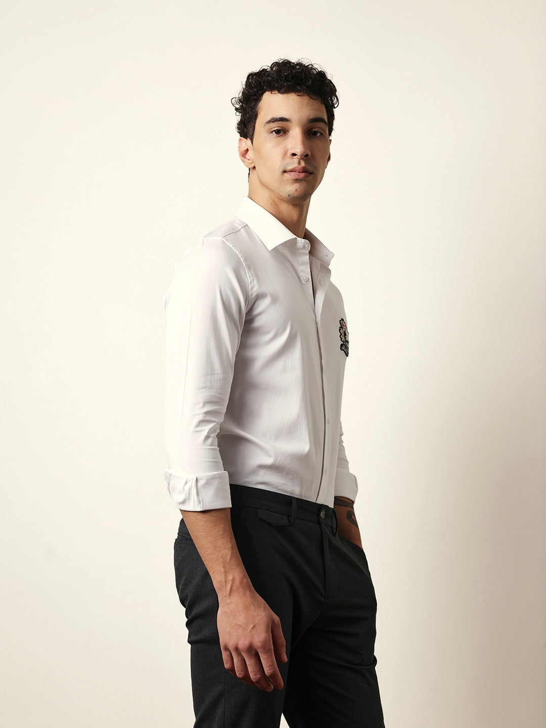 White Tailored Fit Regal Crest Embroidery Formal Party Shirt