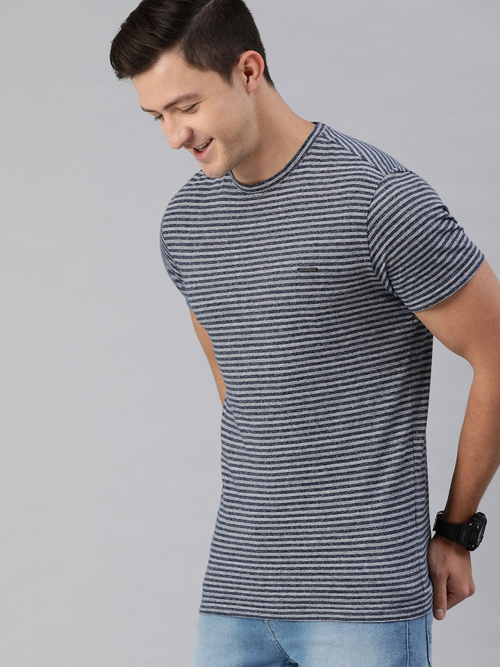Men Blue Striped Soli Fit Cotton Round Neck T-shirt