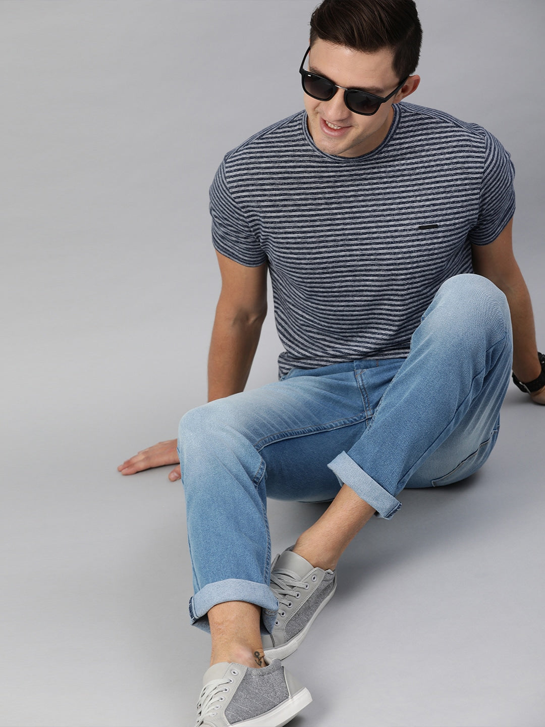 Shop Men Blue Striped Soli Fit Cotton Round Neck T-shirt online