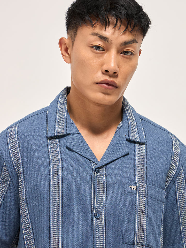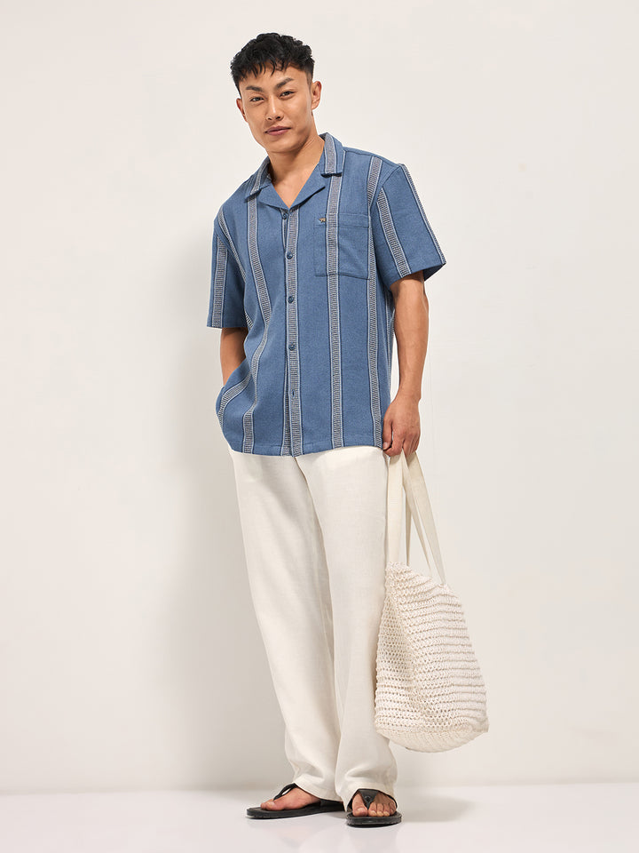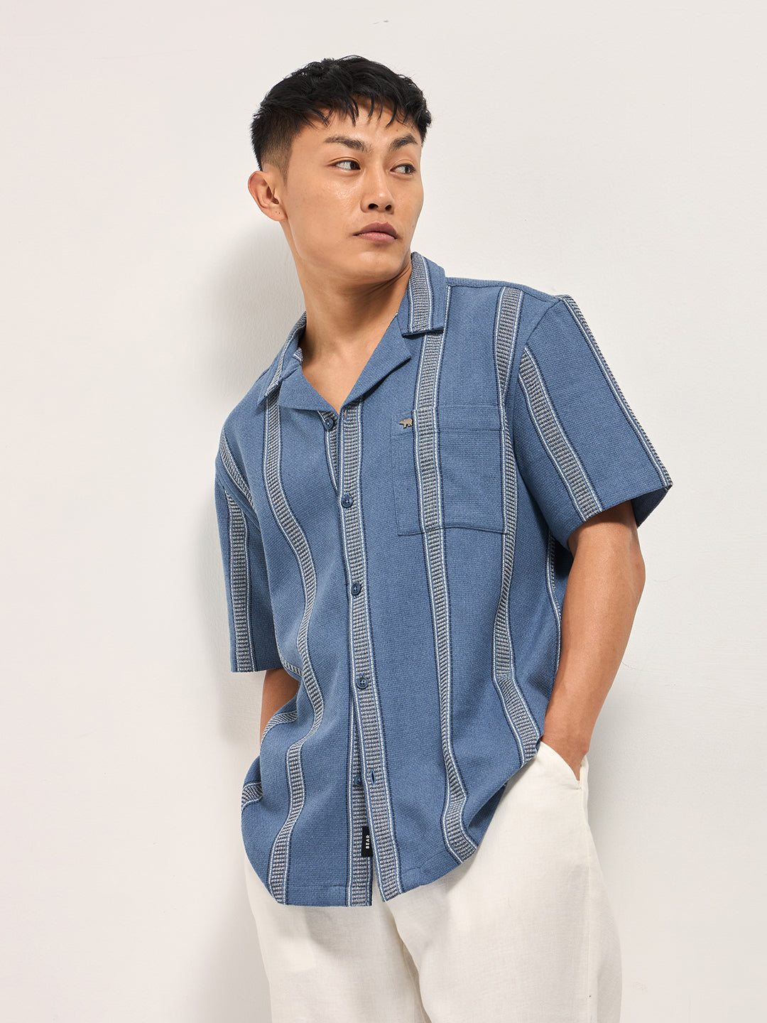 Shop Blue Textured Striped Regular Fit Casual Shirt with a Cuban Collar Online.