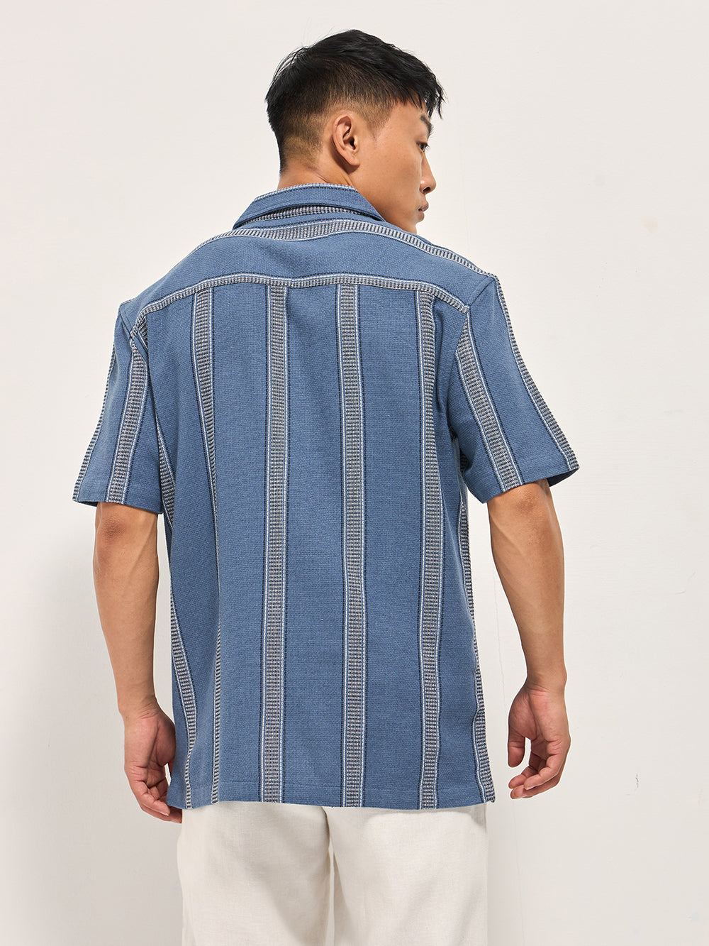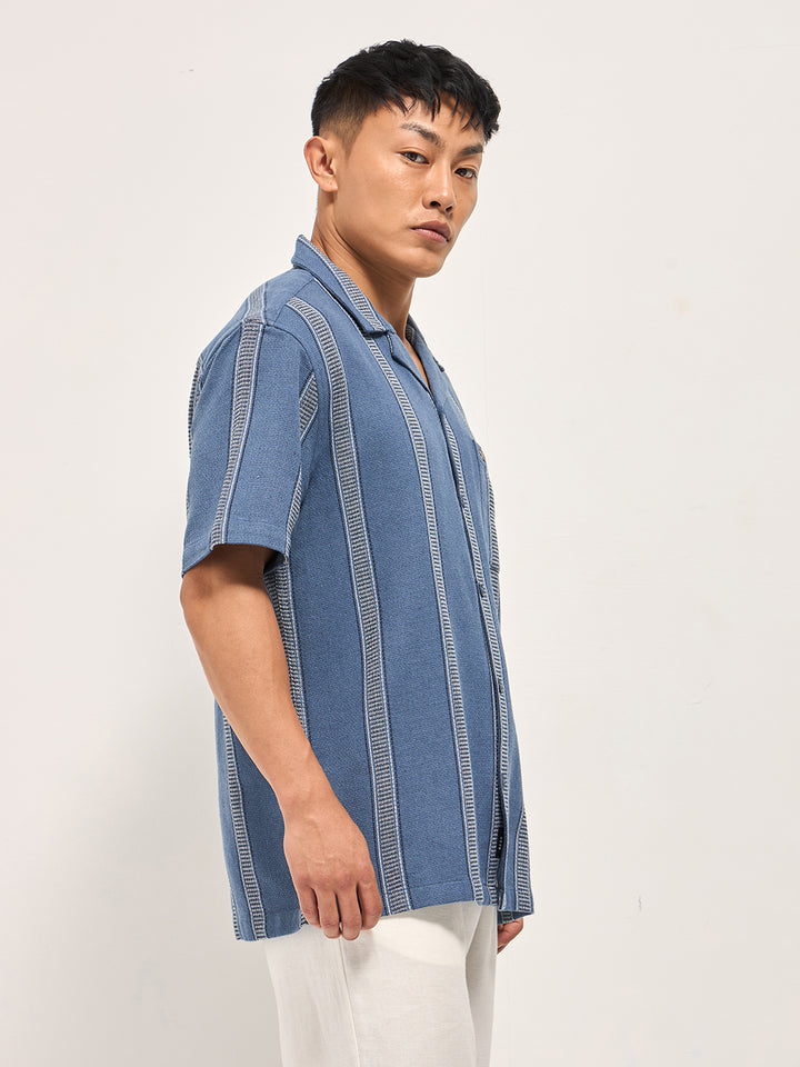 Blue Textured Striped Regular Fit Casual Shirt with a Cuban Collar