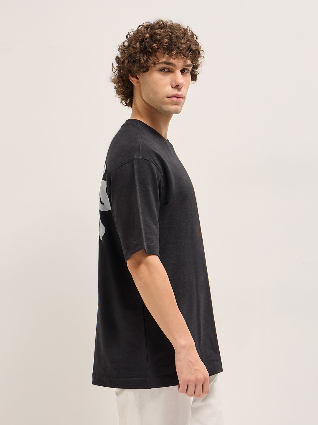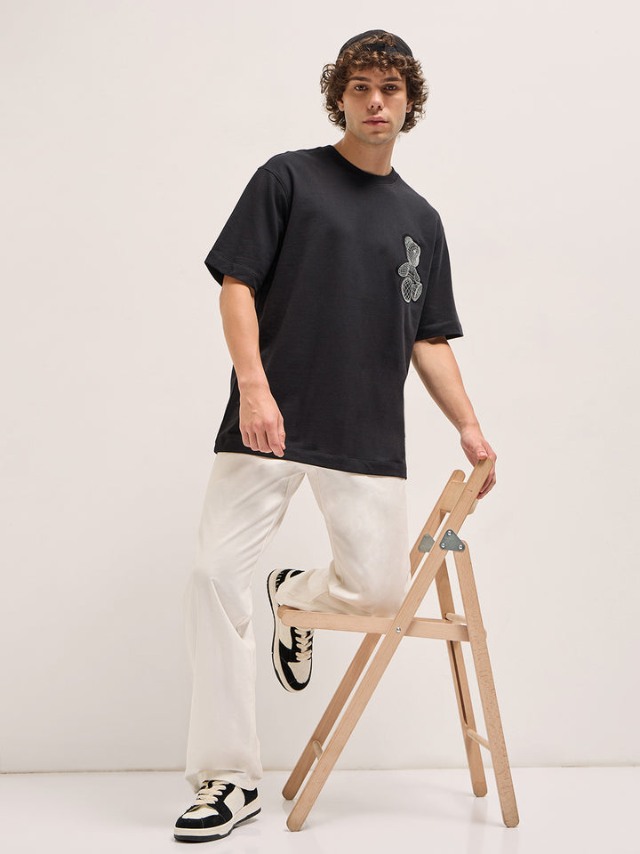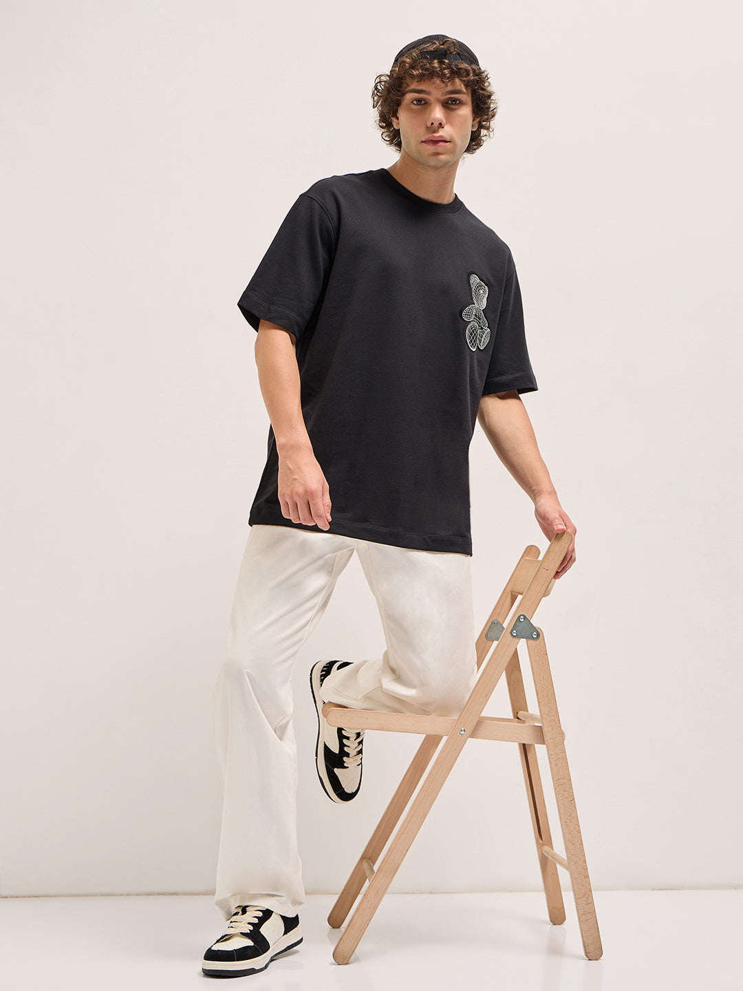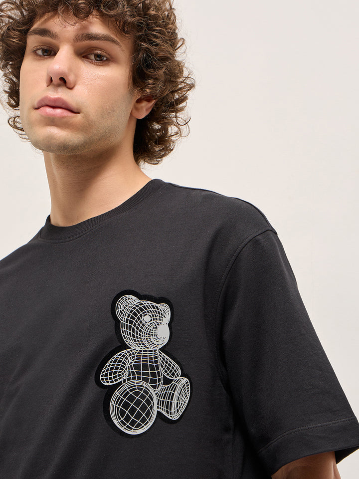 Black 3D Bear Graphic & Abstract Back Print Crew Neck T-shirt